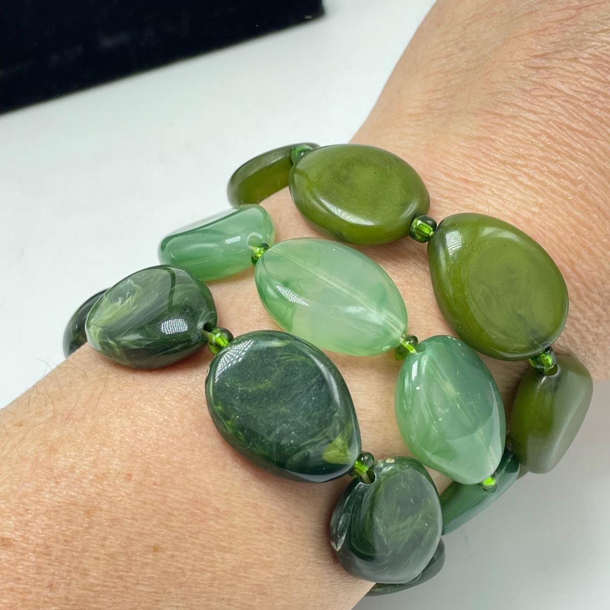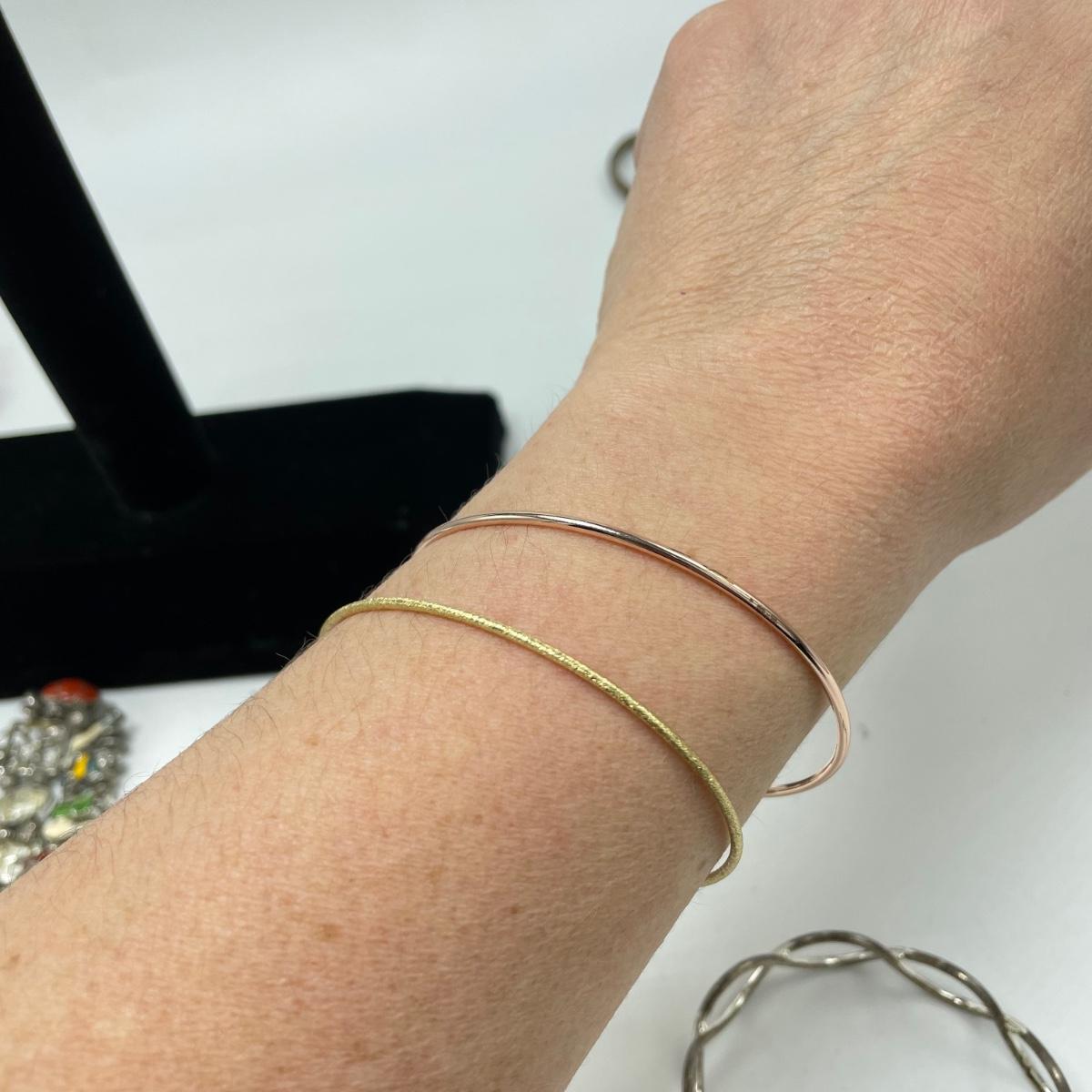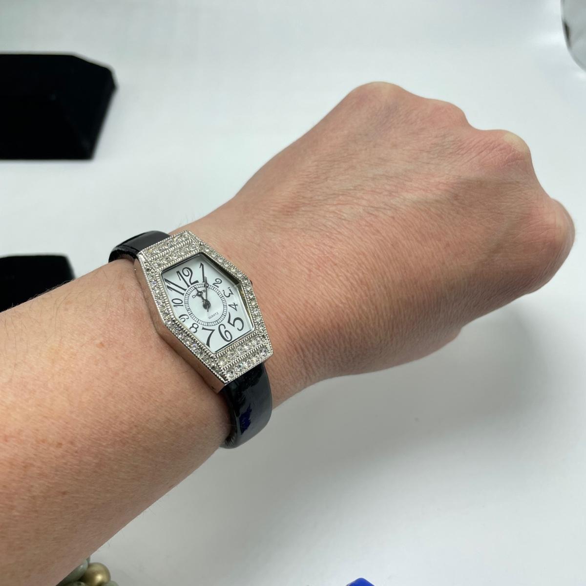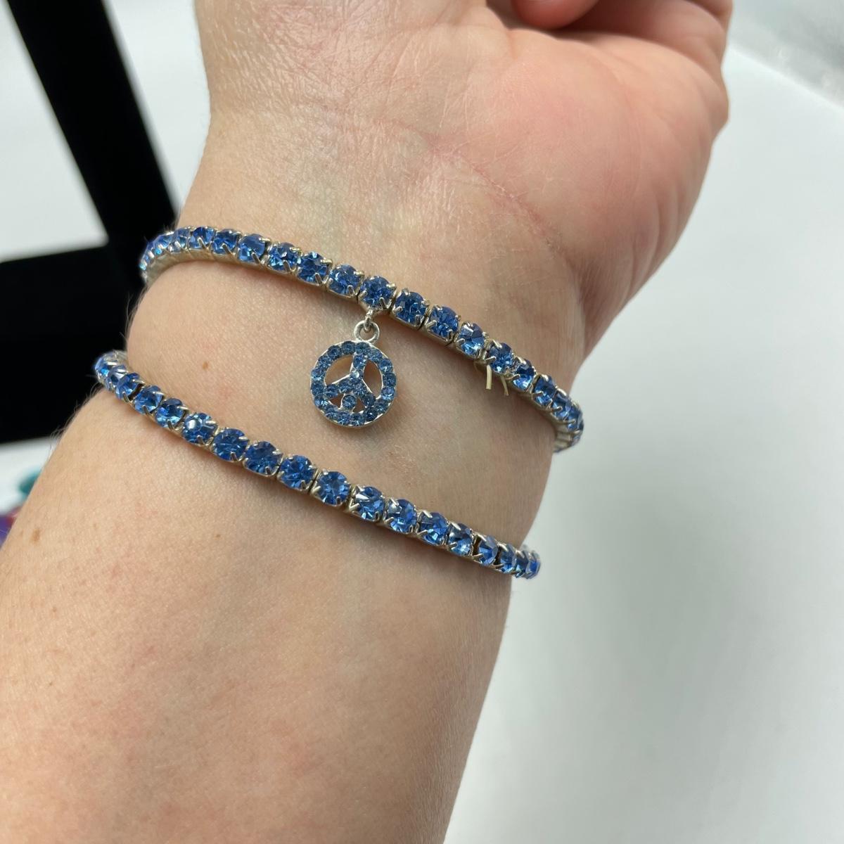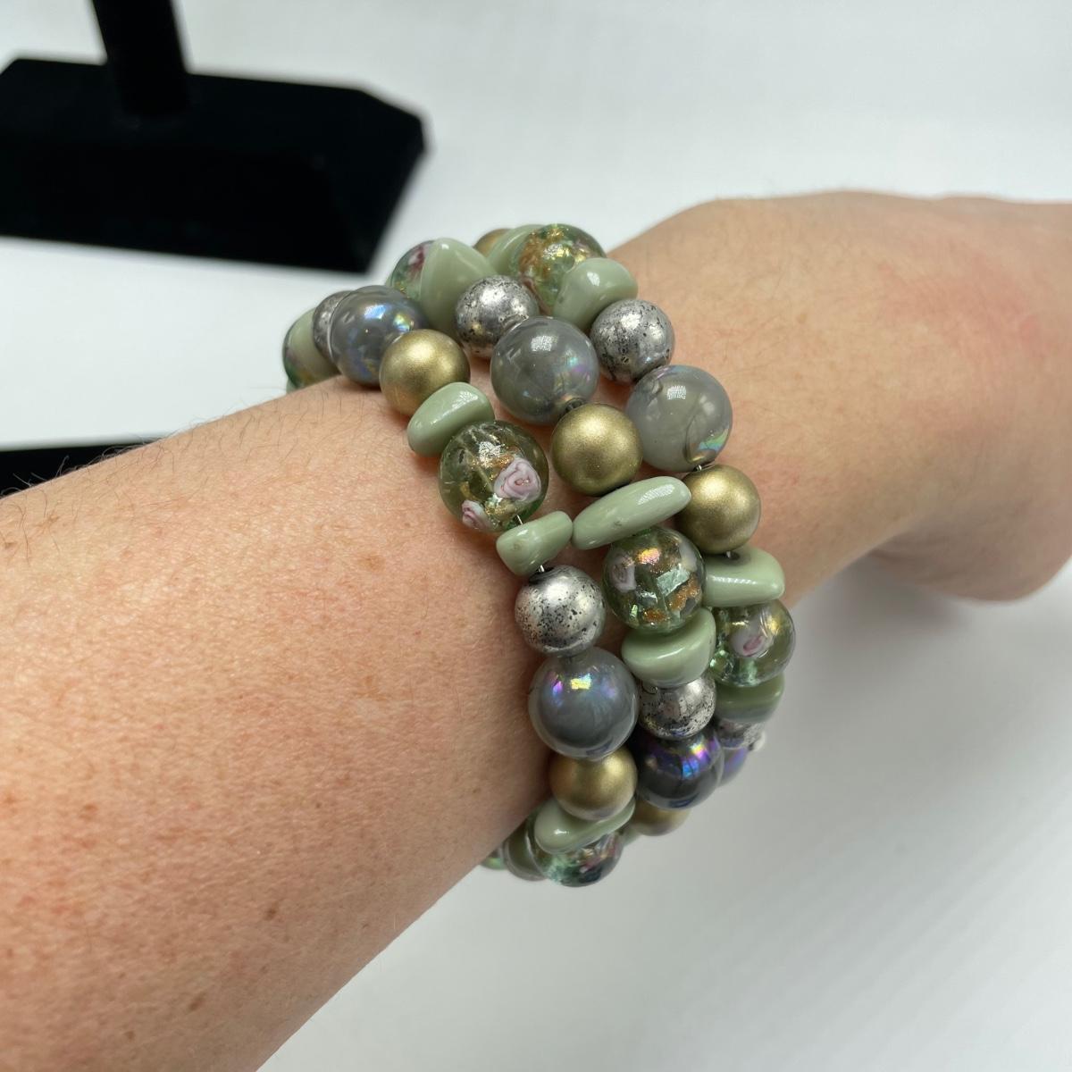 Twenty six bracelets, mostly elastic bands with some bangles and cuffs in the mix. All of the bangles and cuffs are made of metal. The sports charm bracelet and the clear blue beaded bracelet both have loose elastic that seems like it will need to be restrung soon. Lot also includes three watches - A Geneva with a rubber wrist band, a watch marked P with an elastic and metal flip flop band and a Chicos quarts watch with hinged band. See images. Shipping available.