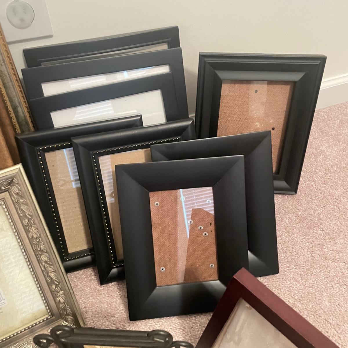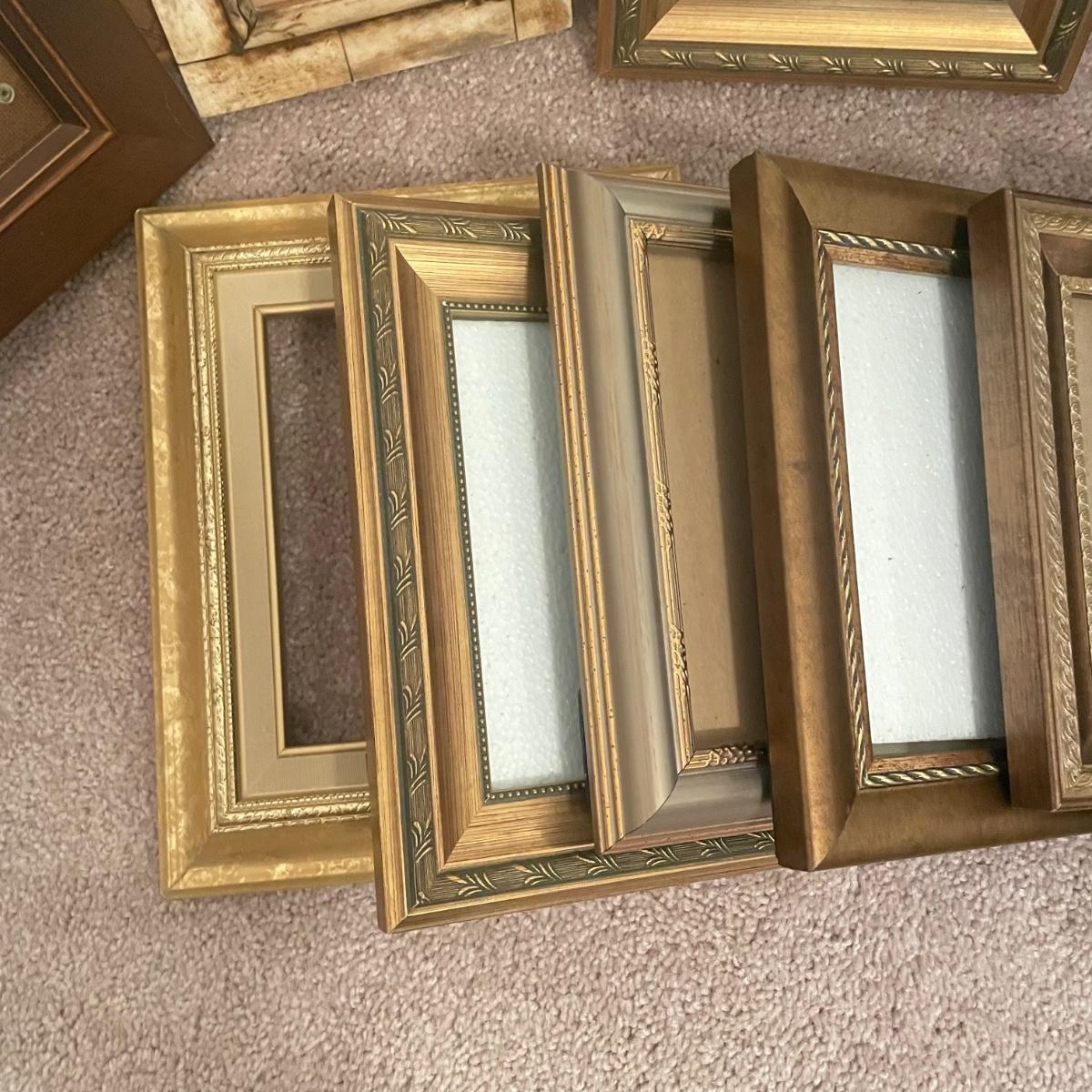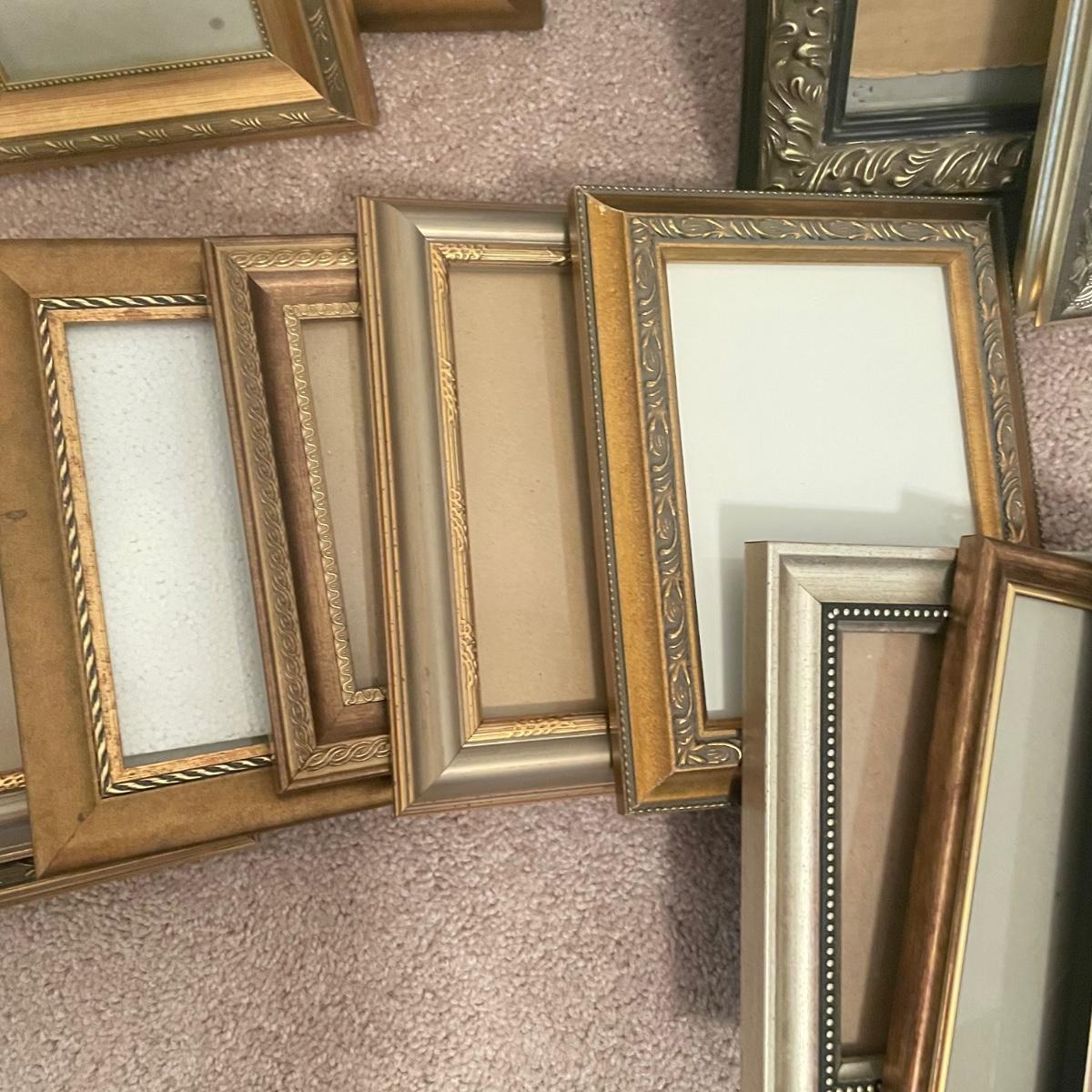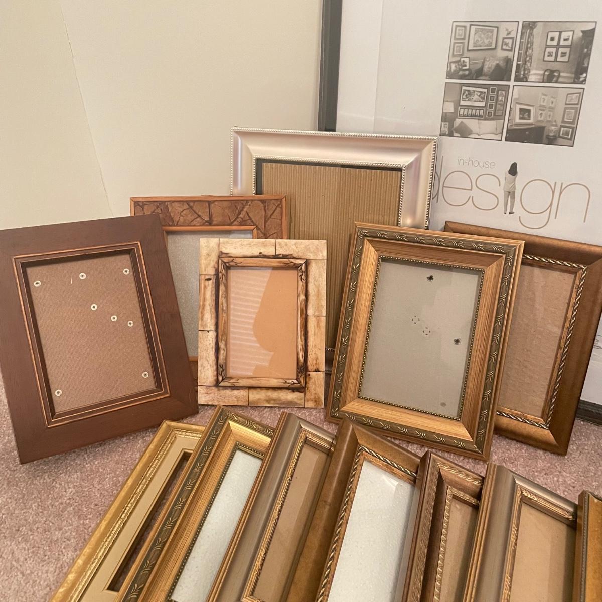 Nice lot of mostly wooden frames, other materials are resin, plastic and one black metal frame. The largest frame is 16” x 20”, four 8” x 10” frames and the majority of the rest are 5” x 7” with a few 4” x 6”. See images. Local pick up only.