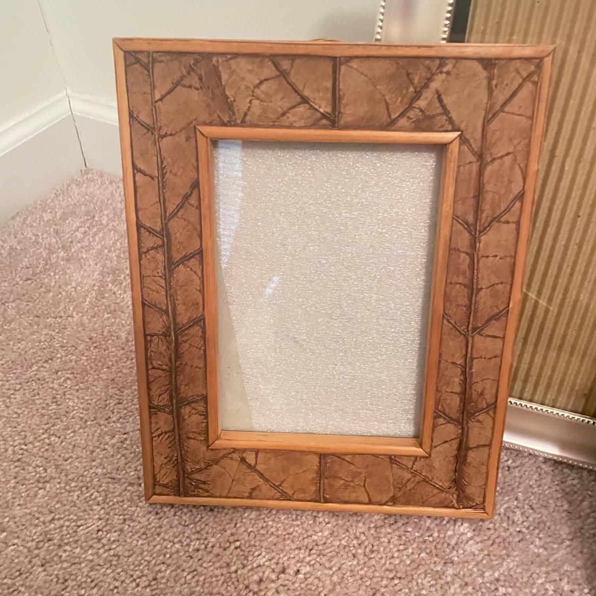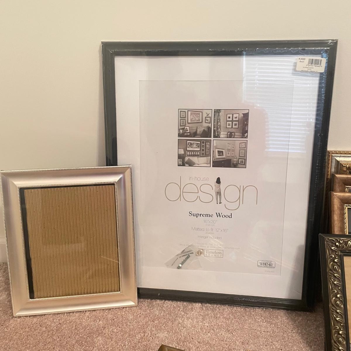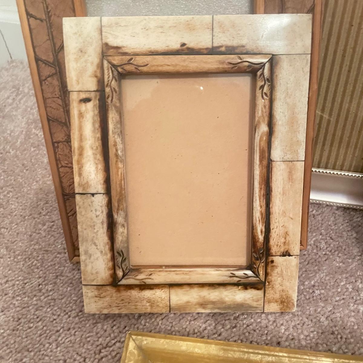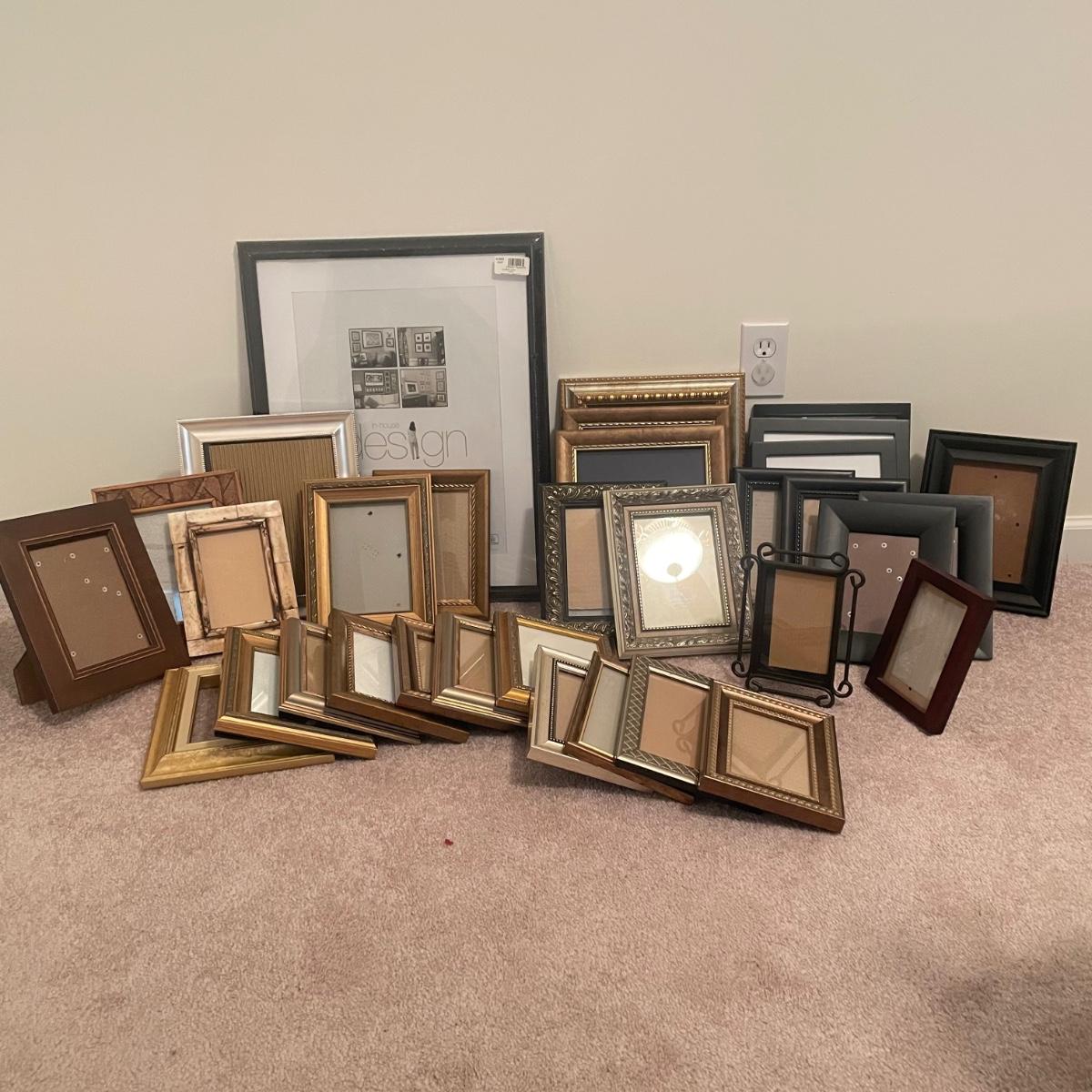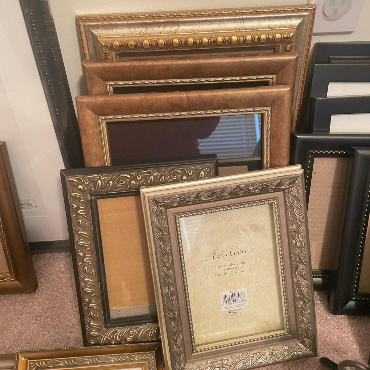 Nice lot of mostly wooden frames, other materials are resin, plastic and one black metal frame. The largest frame is 16” x 20”, four 8” x 10” frames and the majority of the rest are 5” x 7” with a few 4” x 6”. See images. Local pick up only.