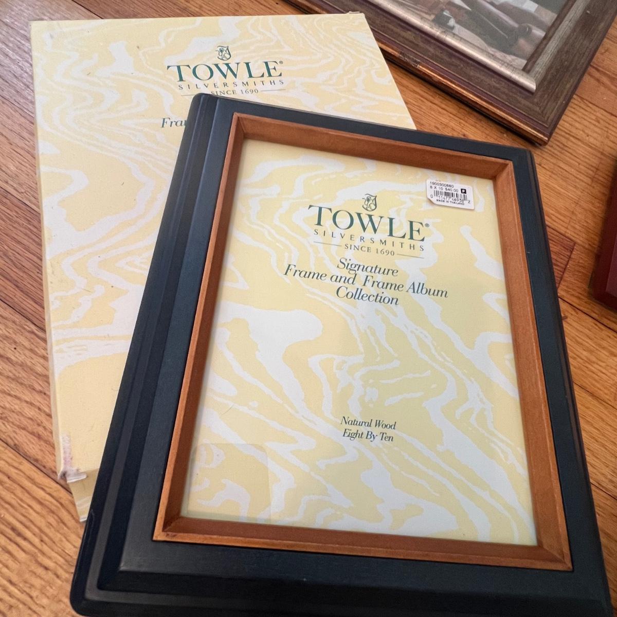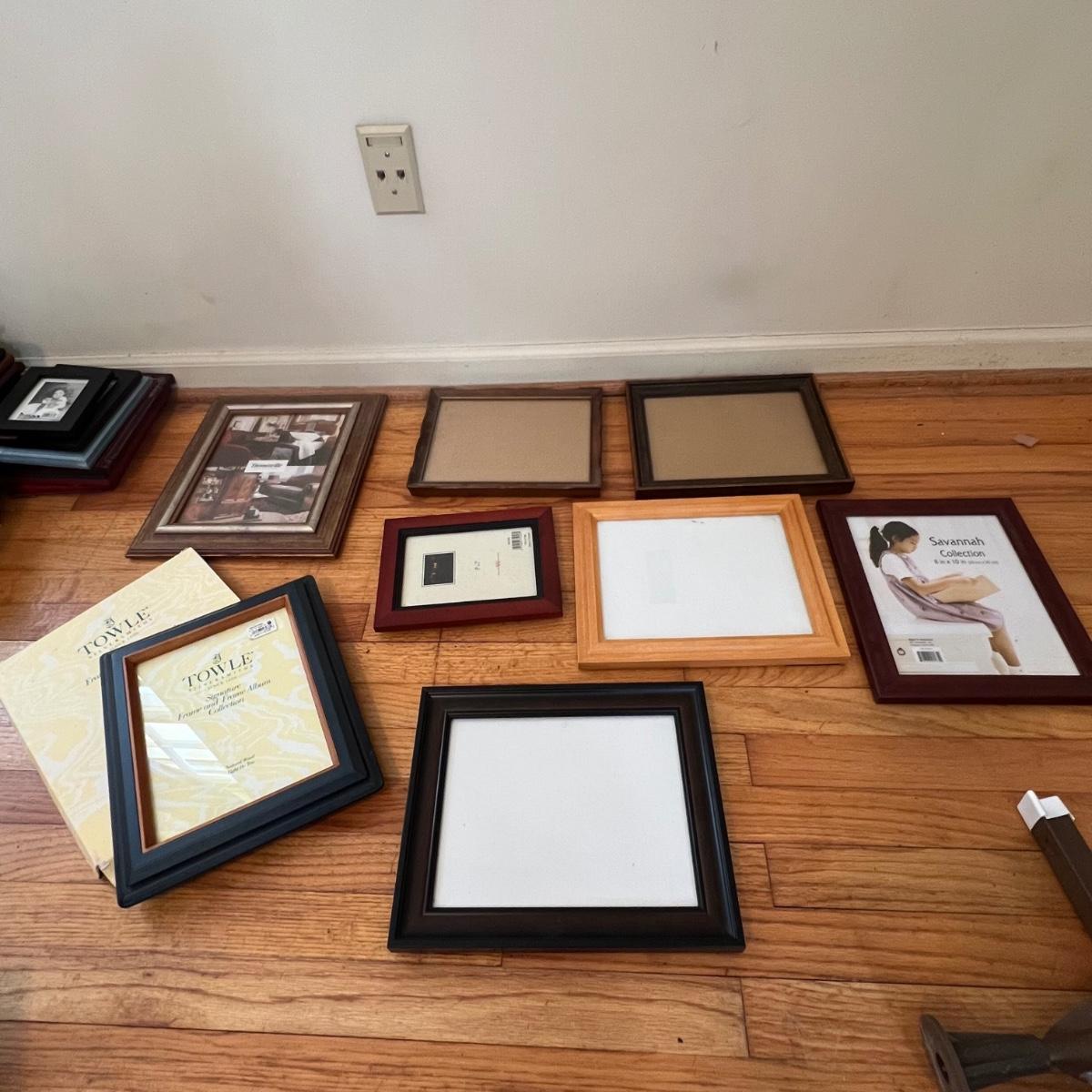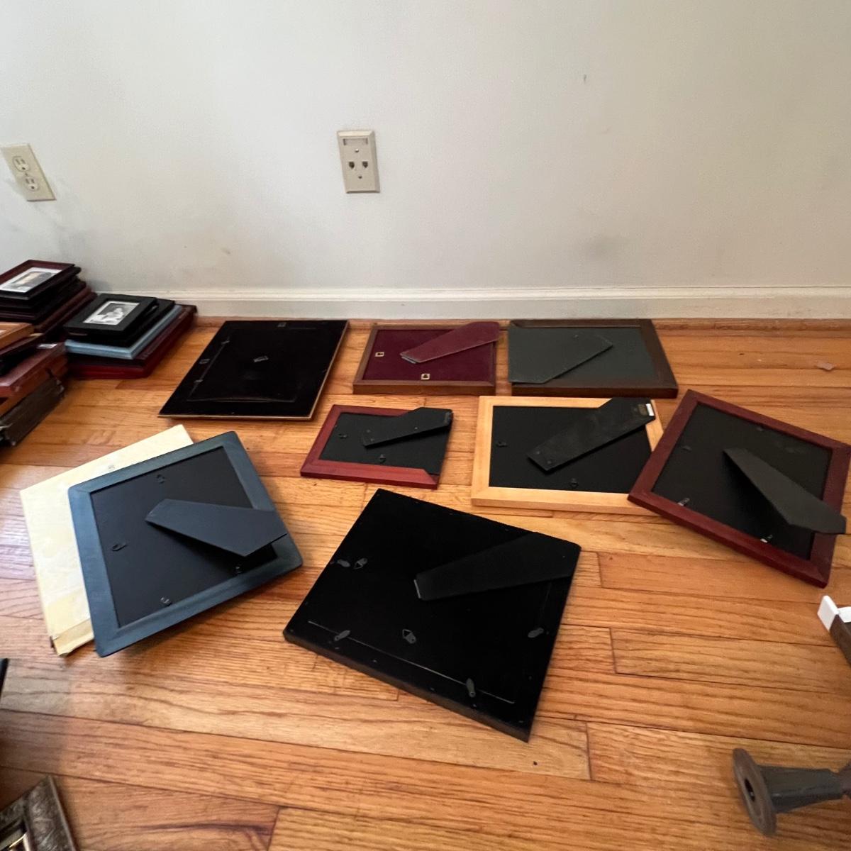80 plus frames includes materials such as metal, wood, china and faux wood. The majority have stands but can be hung as well. Includes a new in box frame from Towle. The largest frame shown in image with tape measure, measures 10” x 17”H.