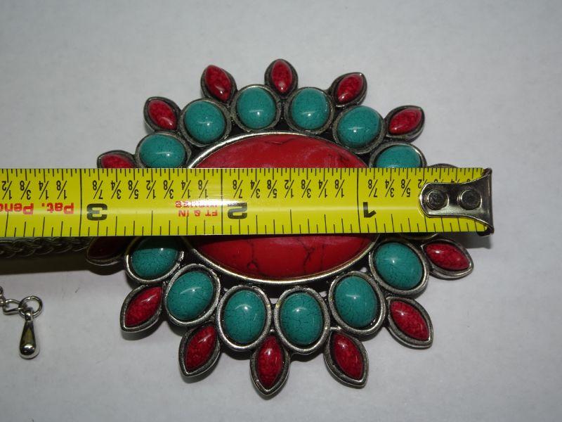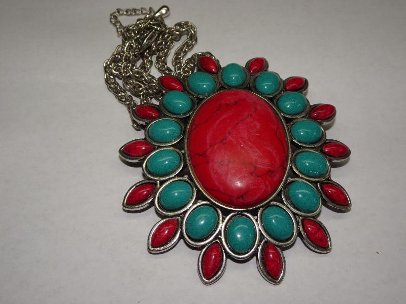 Over Sized Silver Tone Southwestern Style Pendant, Red & Turquoise