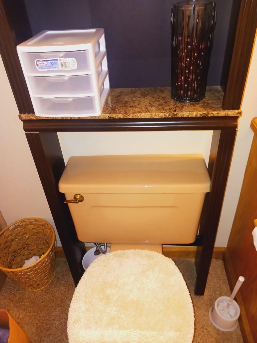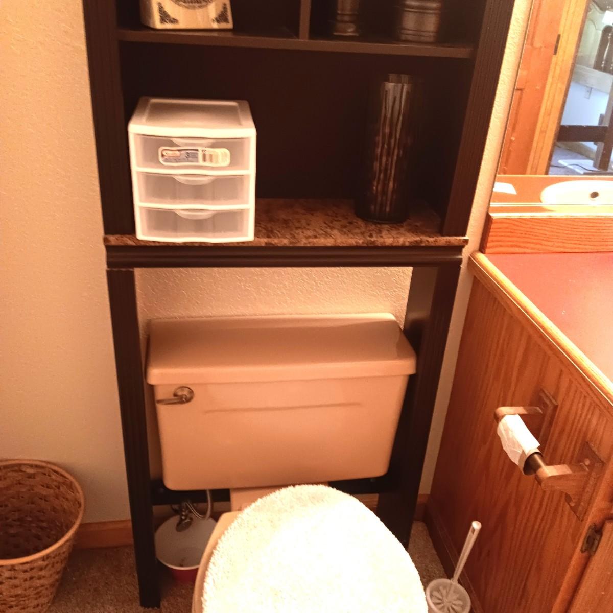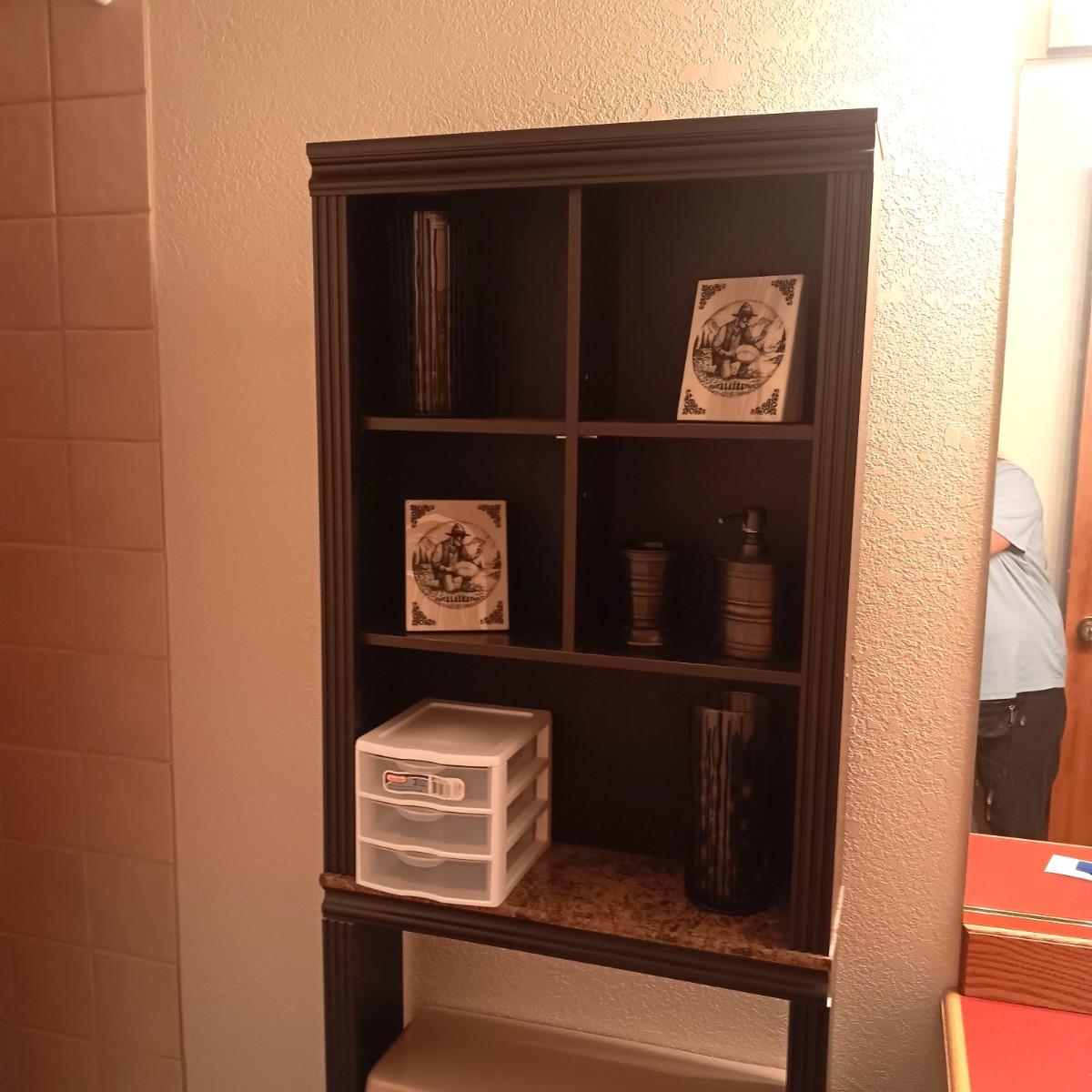 OVER THE TOILET SHELF, BATHROOM ITEMS AND ALASKA ART
