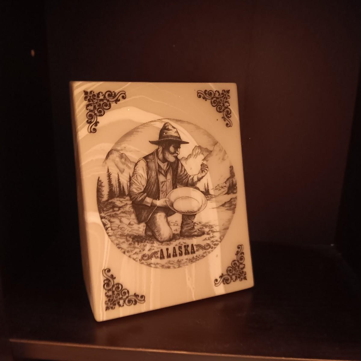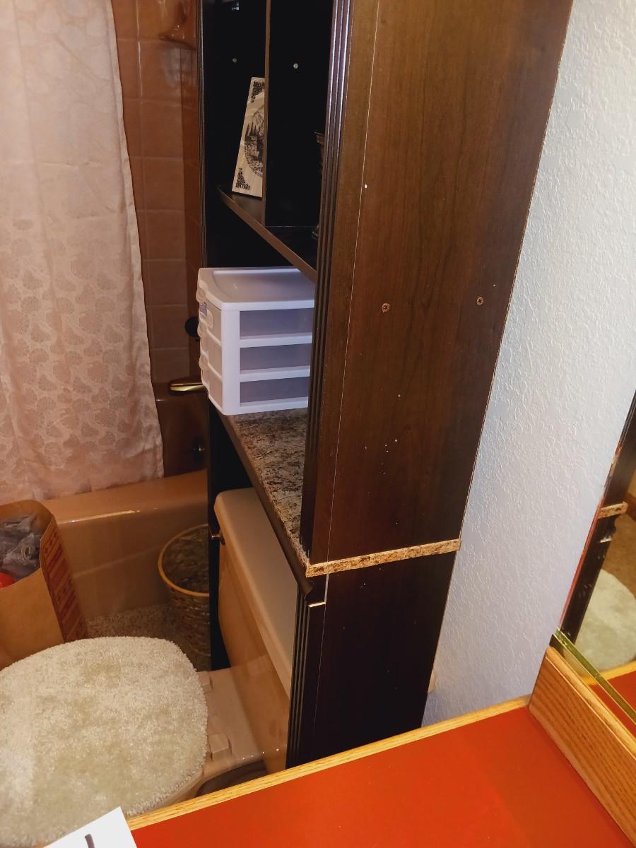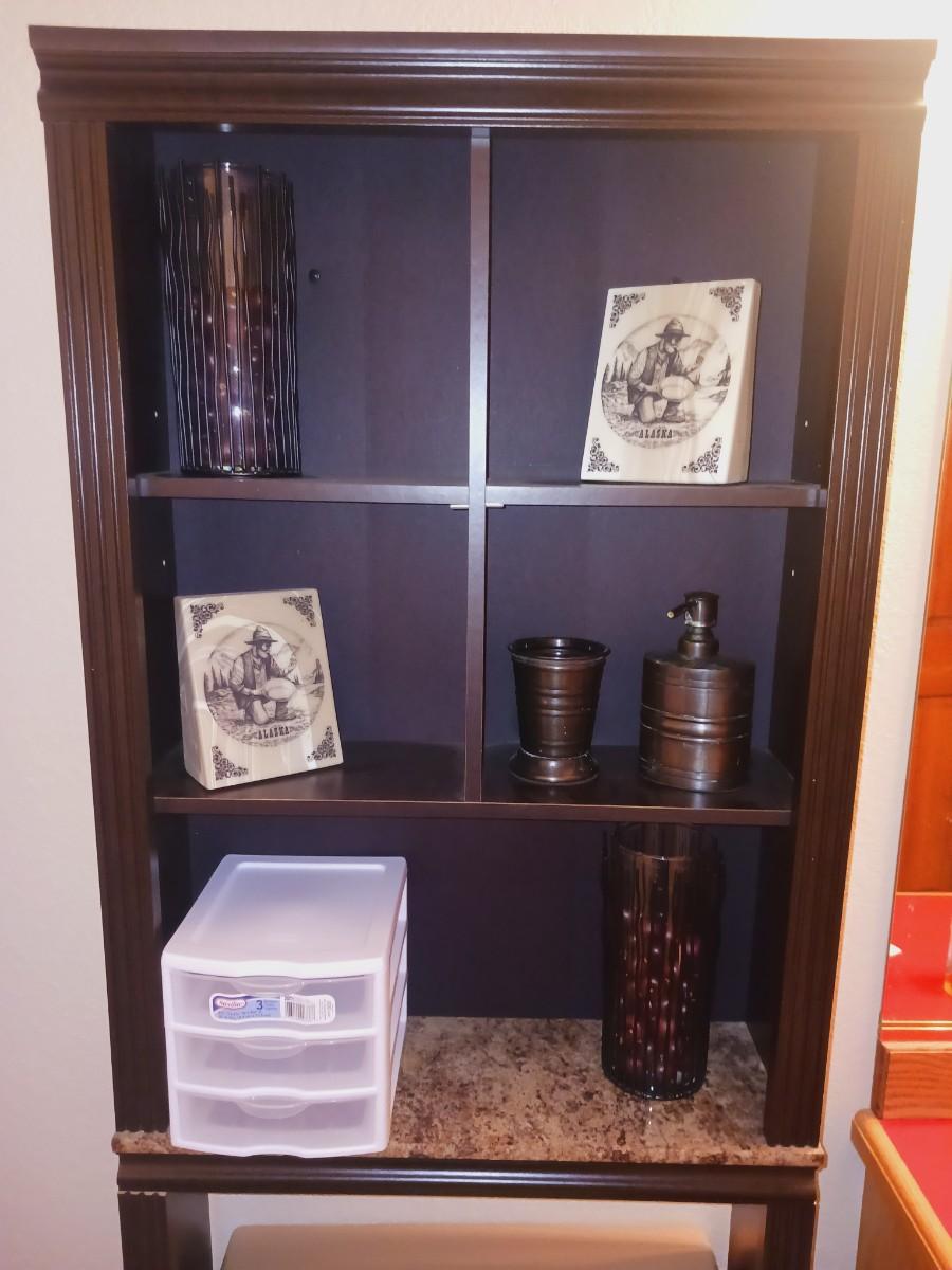 OVER THE TOILET SHELF, BATHROOM ITEMS AND ALASKA ART