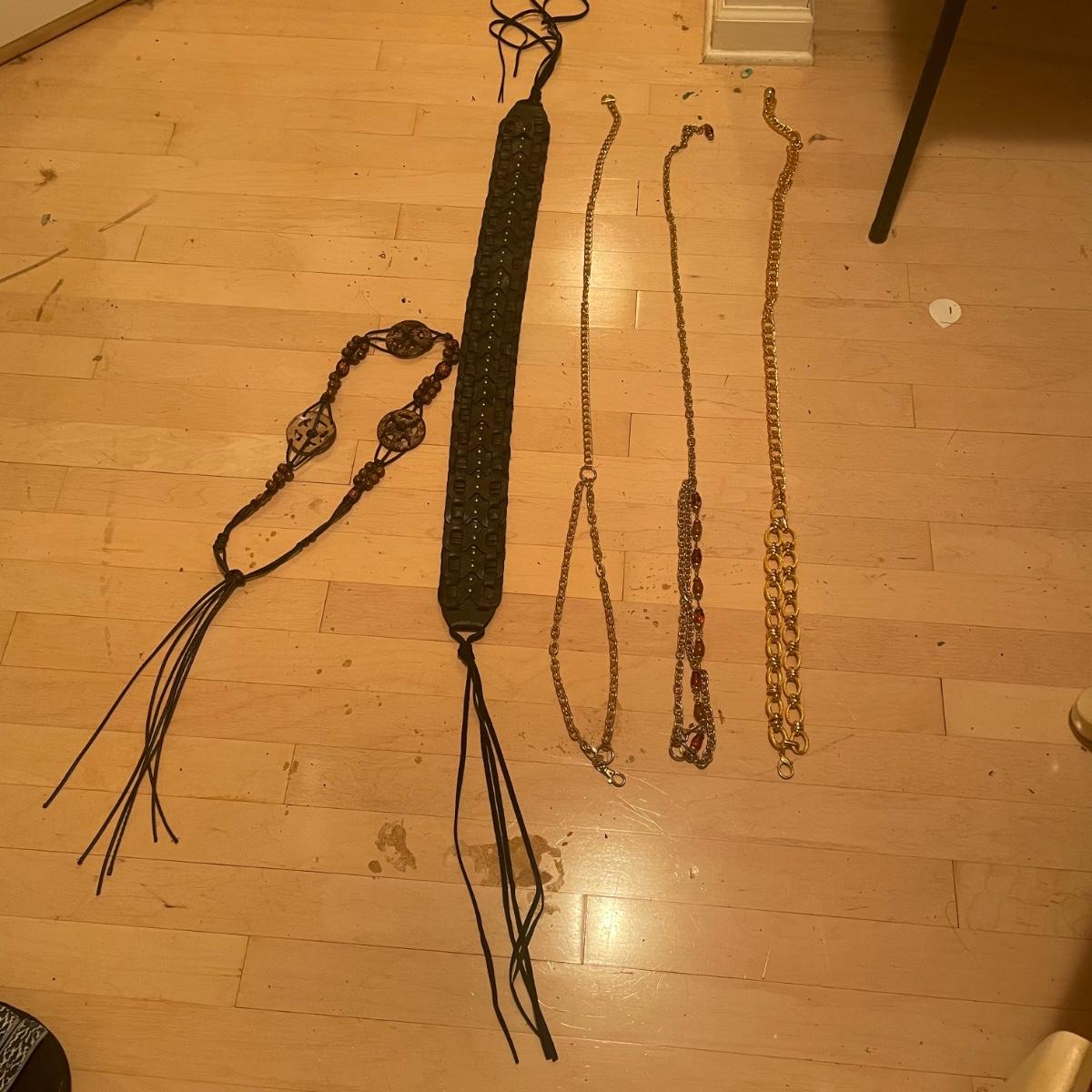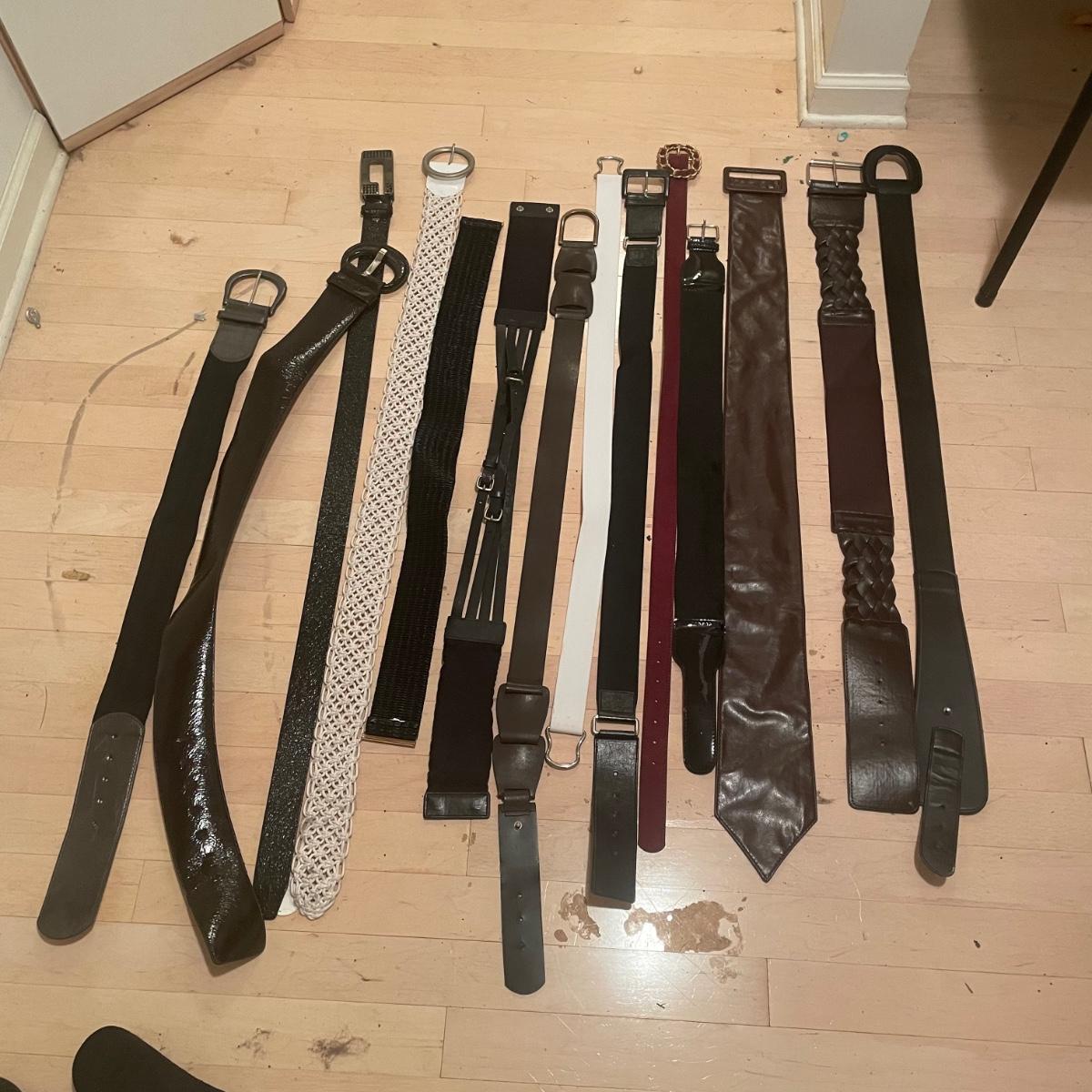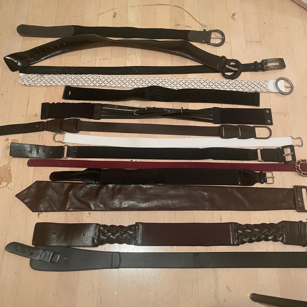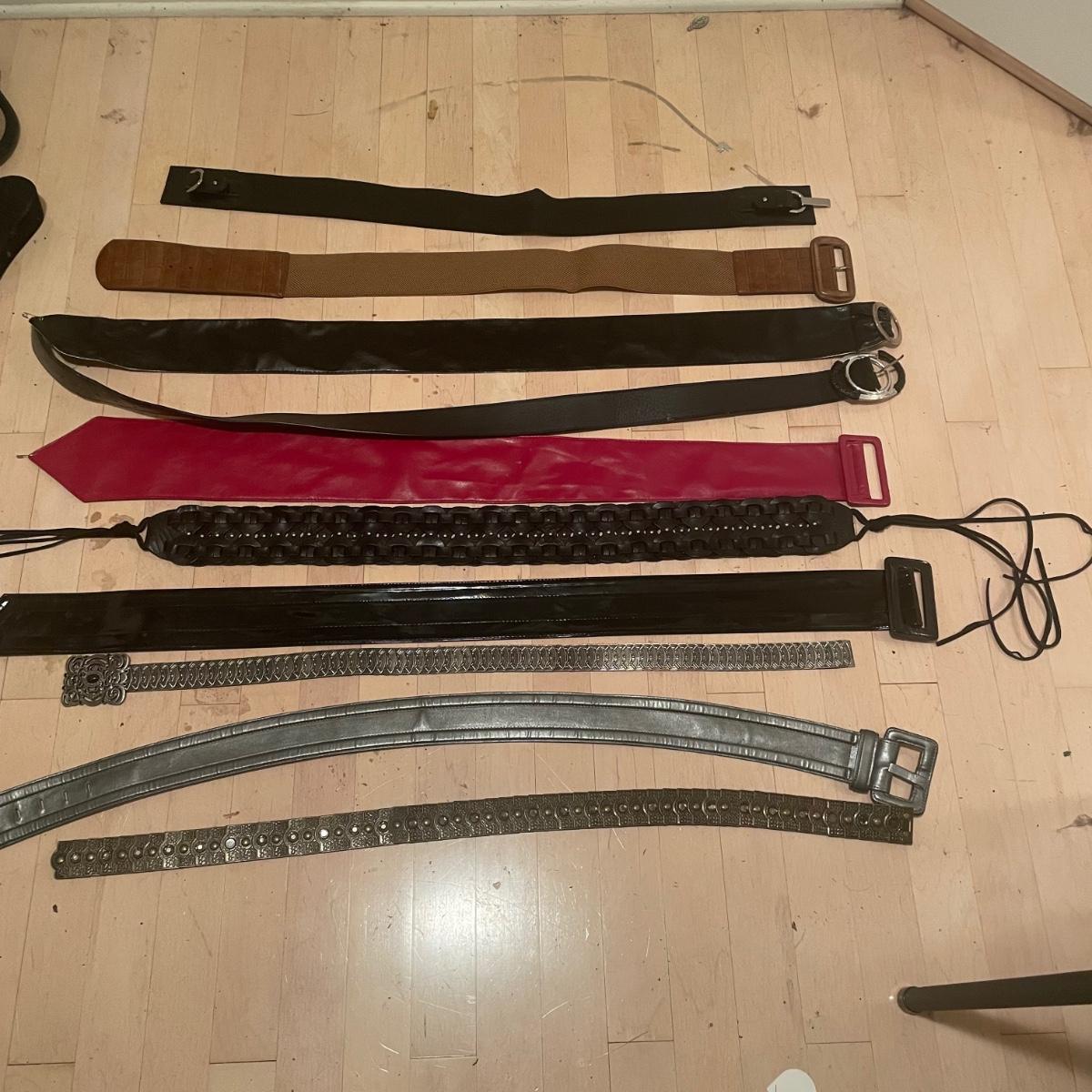 A belt for every outfit in this lot of 35 plus belts! Mostly faux leather. This assortment also includes metal chain style, elastic, rope and much more. A large proportion will fit many sizes of people, the belts that have holes are typically around 42” long. See images for the wide range of colors and styles. Lot also includes 5 new in packaging lace trim garter stockings and 5 belt or tie rack metal hangers.
