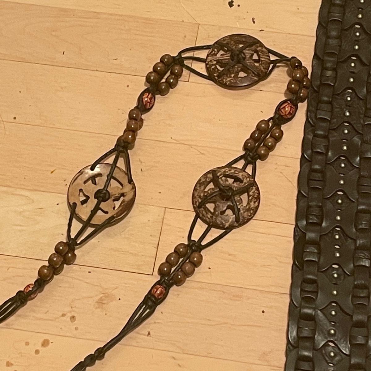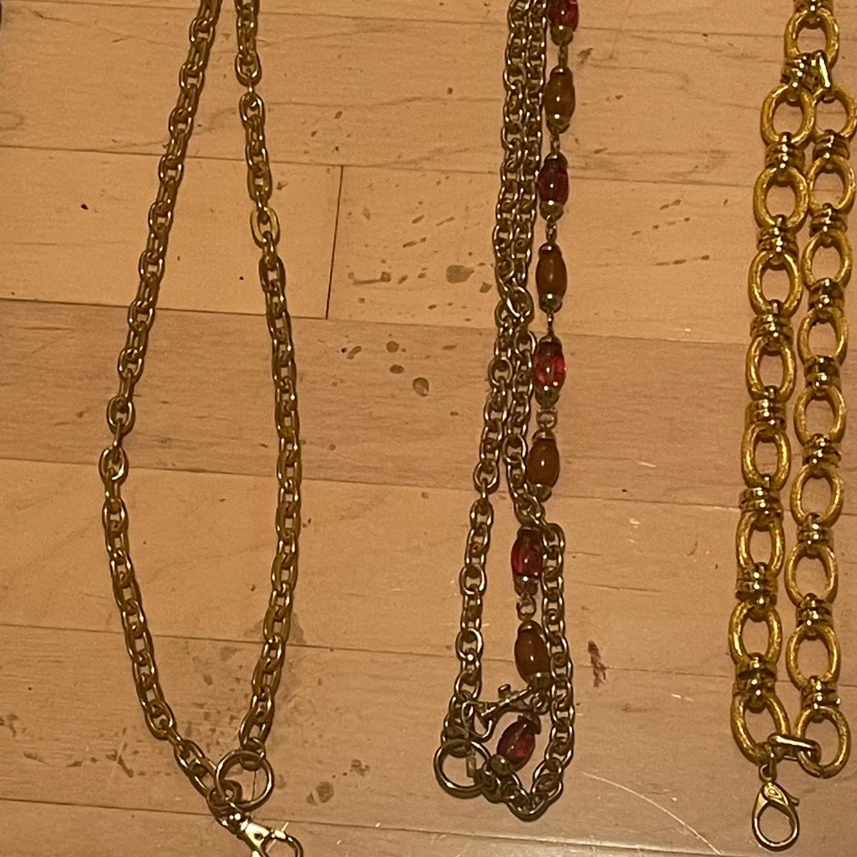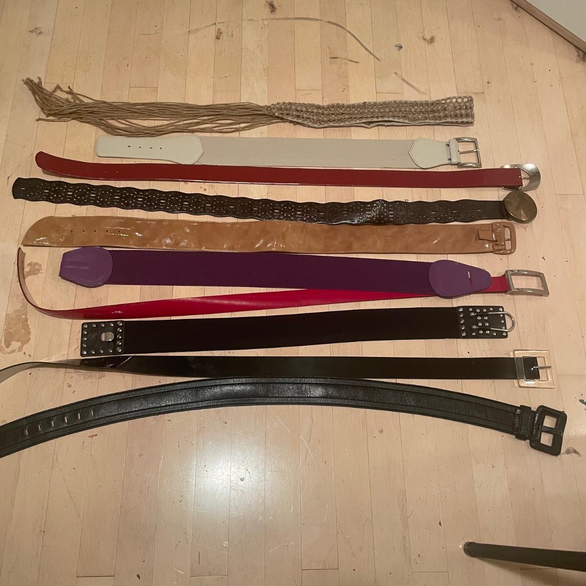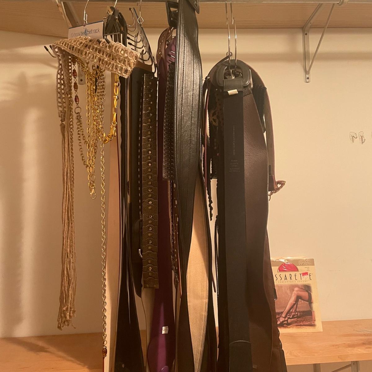 A belt for every outfit in this lot of 35 plus belts! Mostly faux leather. This assortment also includes metal chain style, elastic, rope and much more. A large proportion will fit many sizes of people, the belts that have holes are typically around 42” long. See images for the wide range of colors and styles. Lot also includes 5 new in packaging lace trim garter stockings and 5 belt or tie rack metal hangers.