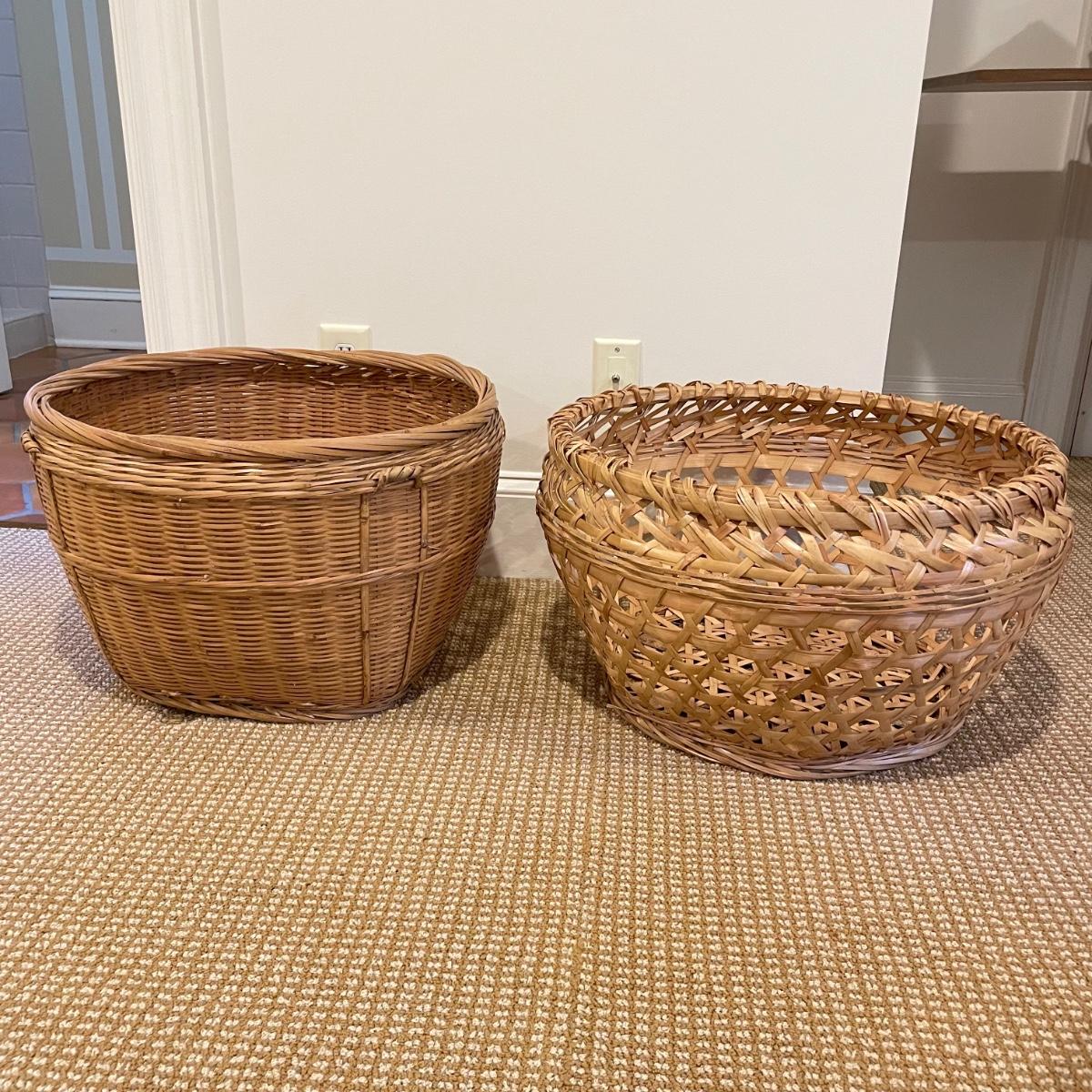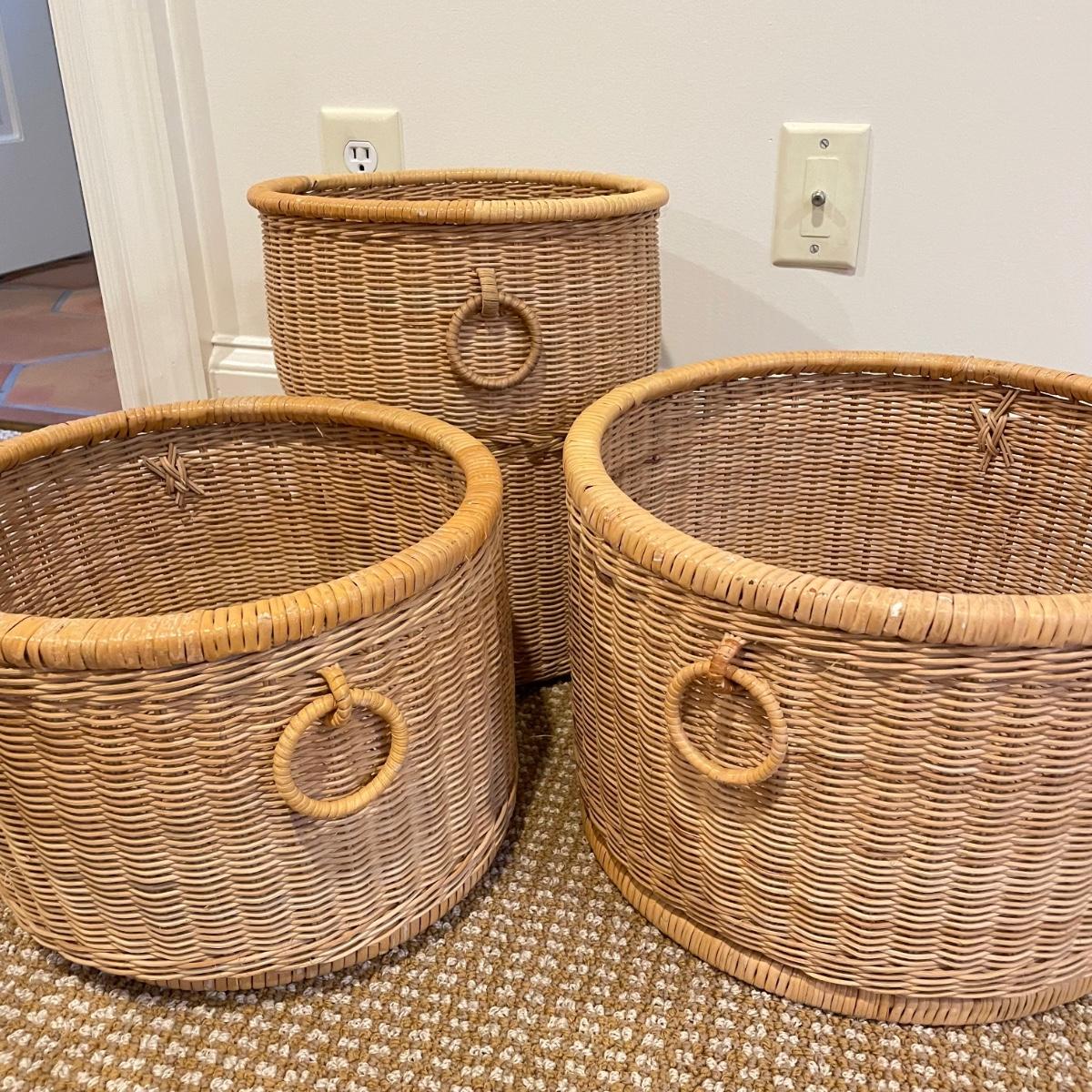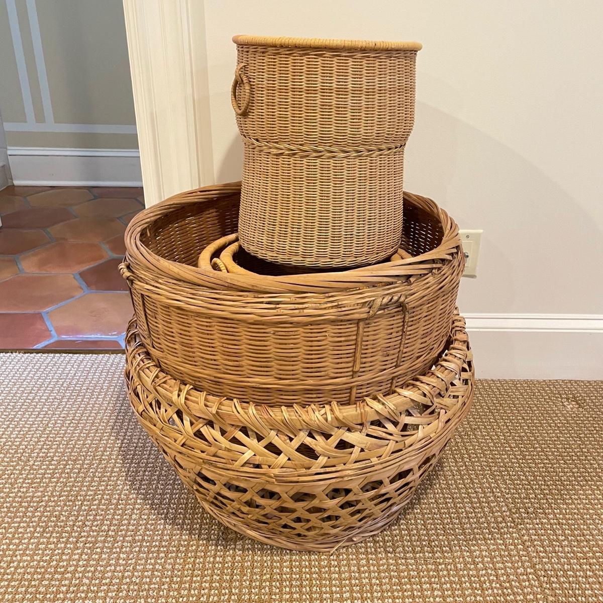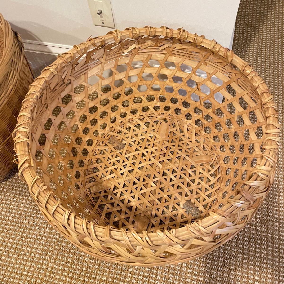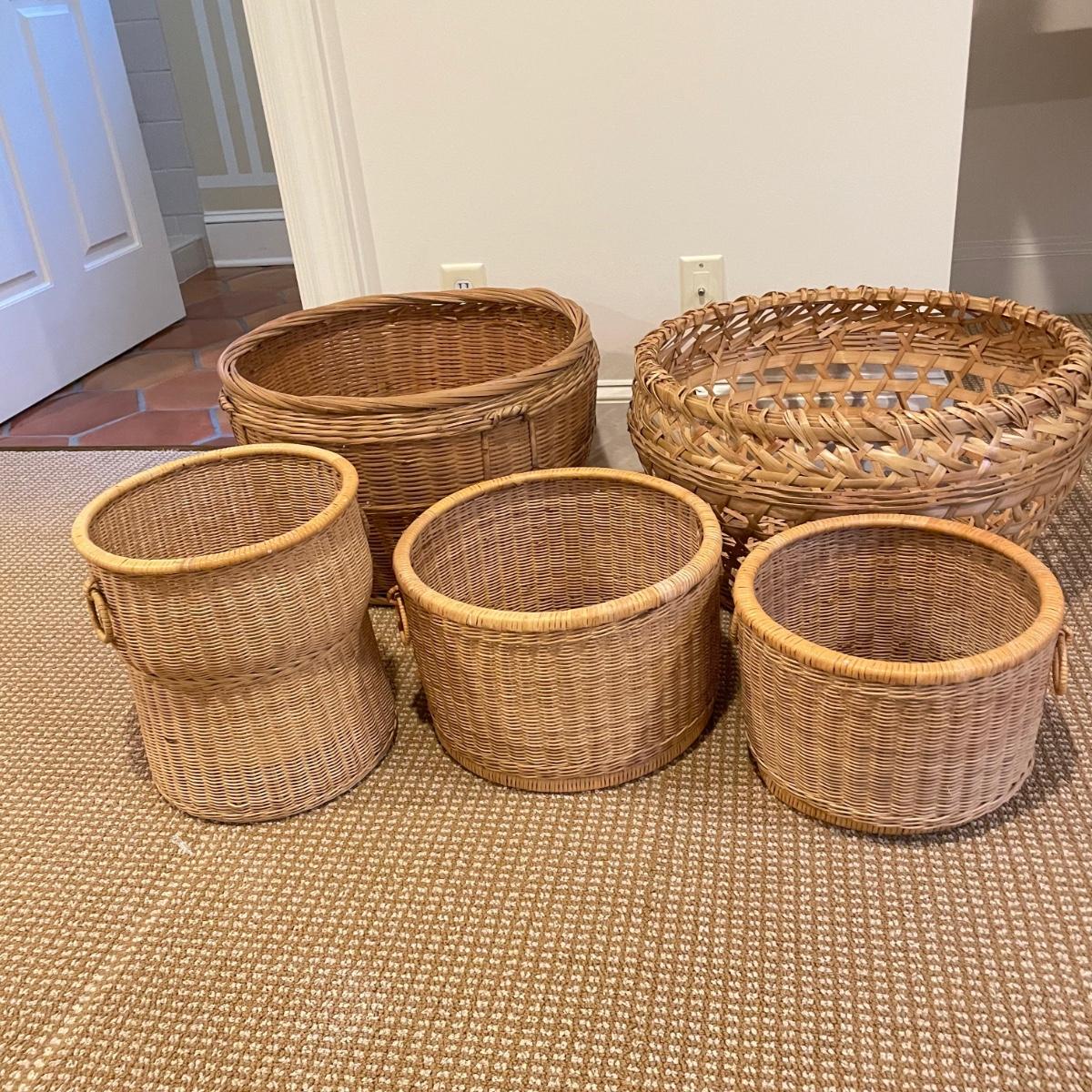 Two large woven baskets and three matching smaller baskets. The basket with small handles in all four “corners” measures 21”D x 14.5”H, the other large basket has a 24”D. Two of the three smaller baskets nest and have a bottom rim, while the third has a no rim. These three are matching in color, style, and handles. See images. Local pick up only.