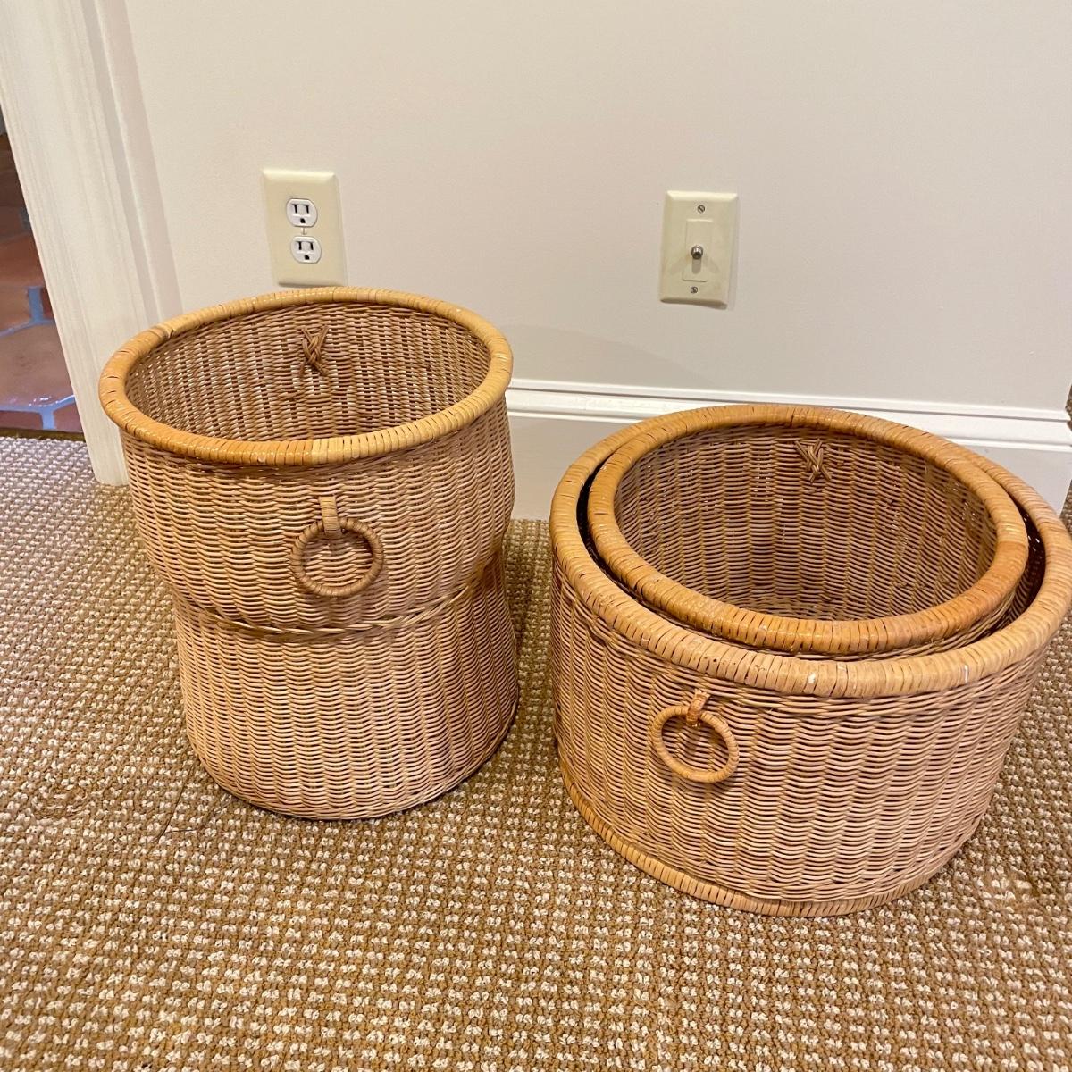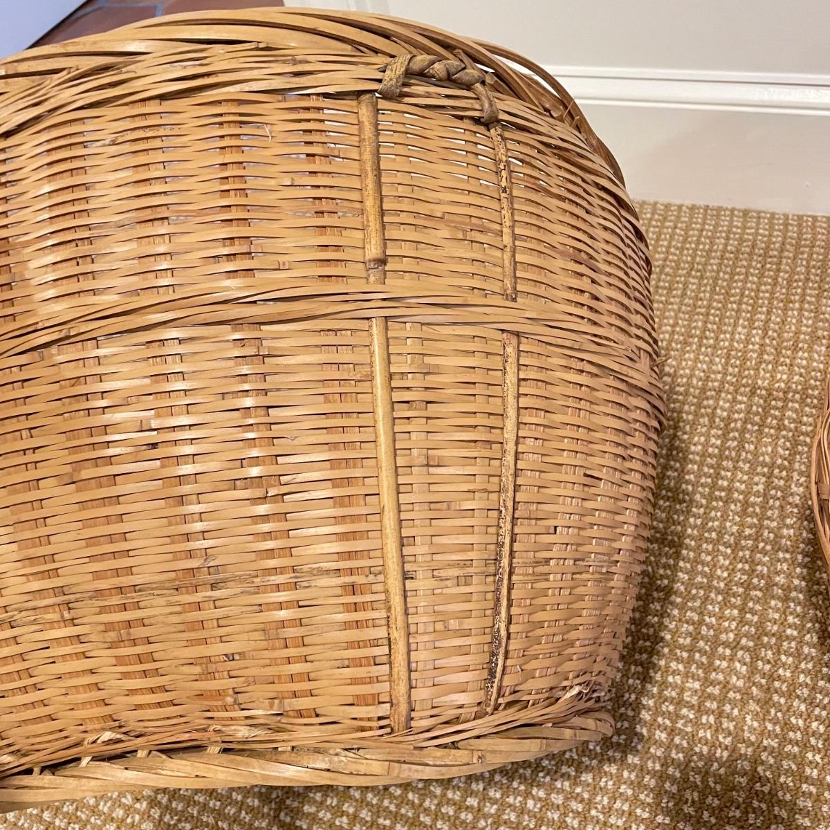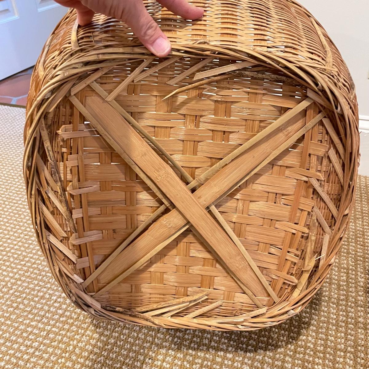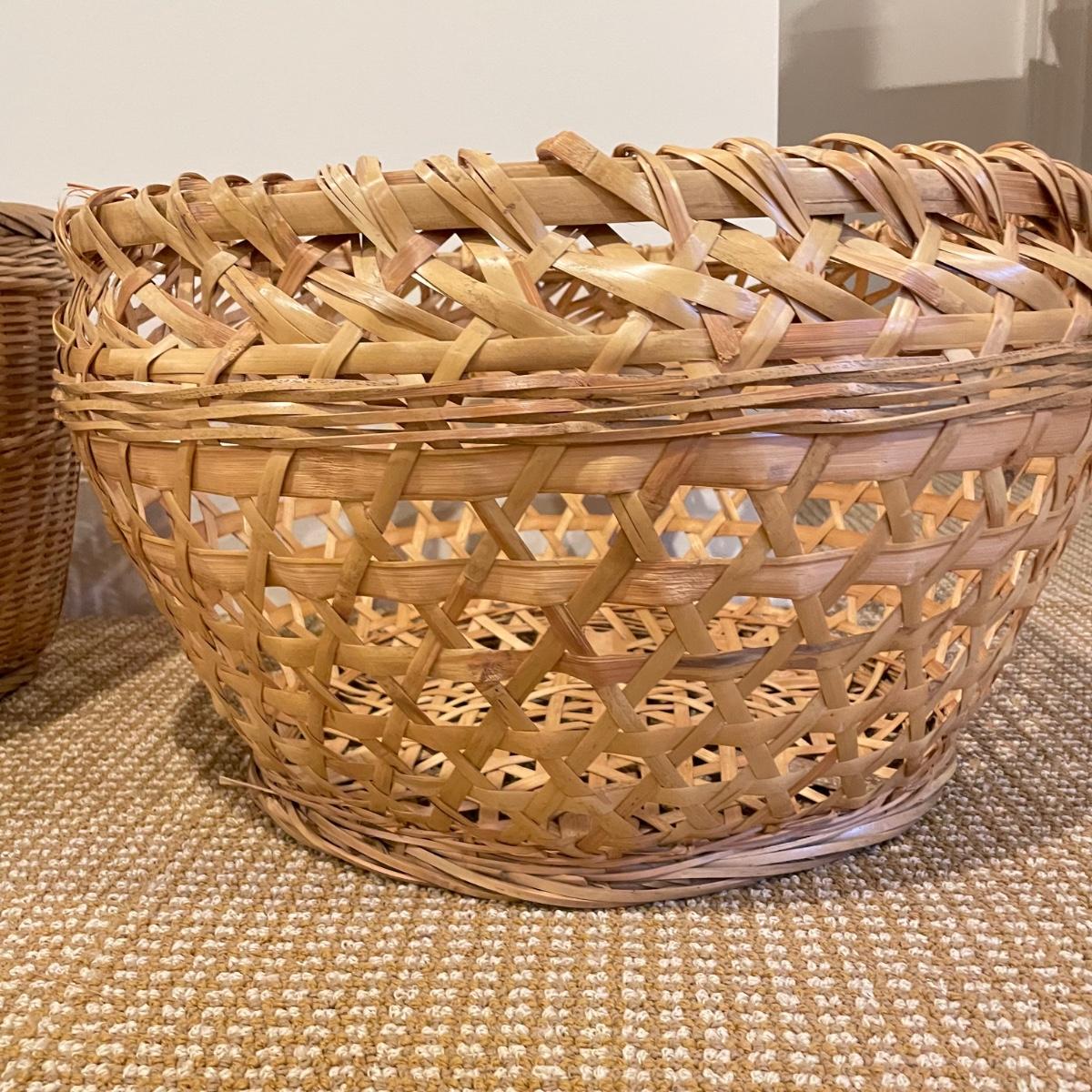 Two large woven baskets and three matching smaller baskets. The basket with small handles in all four “corners” measures 21”D x 14.5”H, the other large basket has a 24”D. Two of the three smaller baskets nest and have a bottom rim, while the third has a no rim. These three are matching in color, style, and handles. See images. Local pick up only.