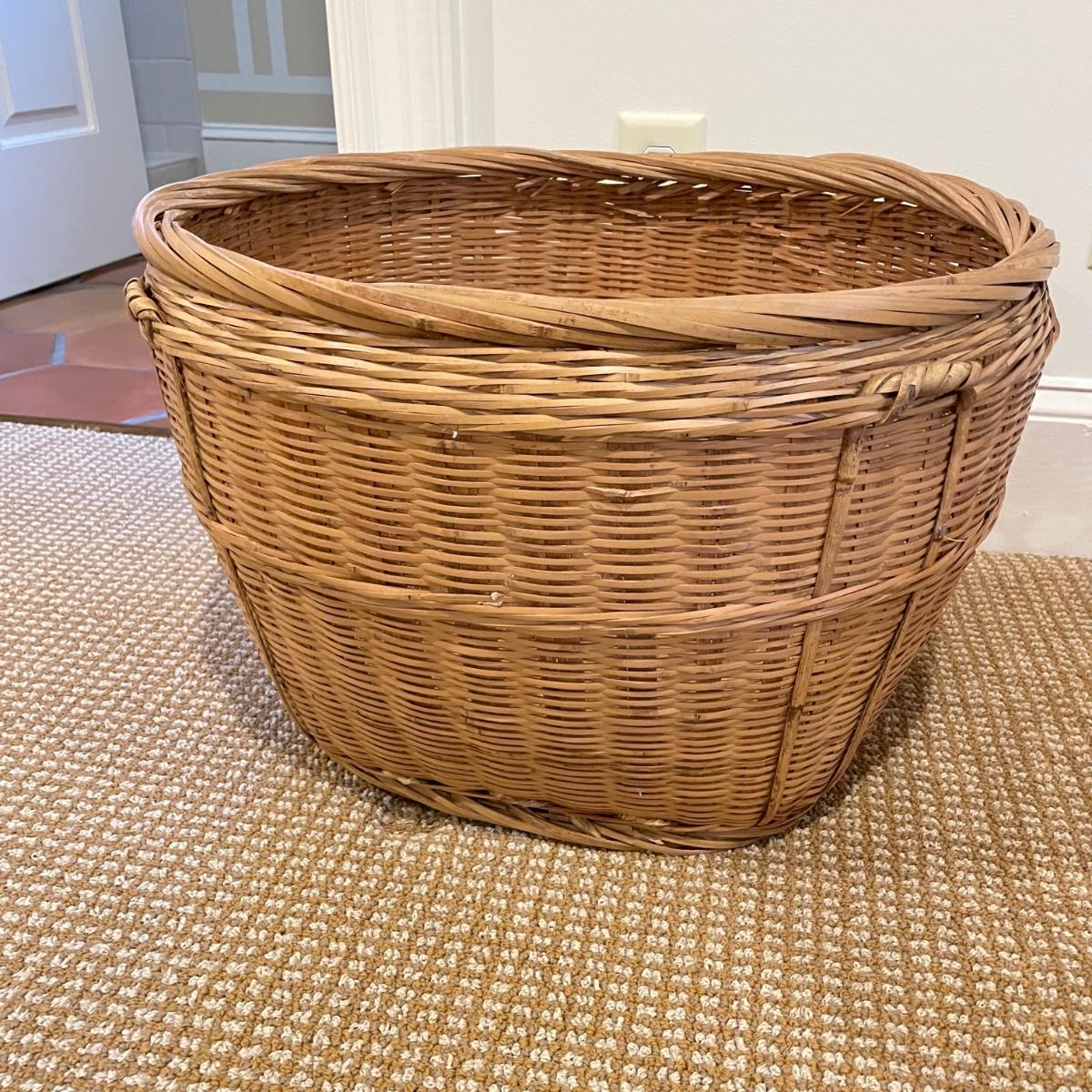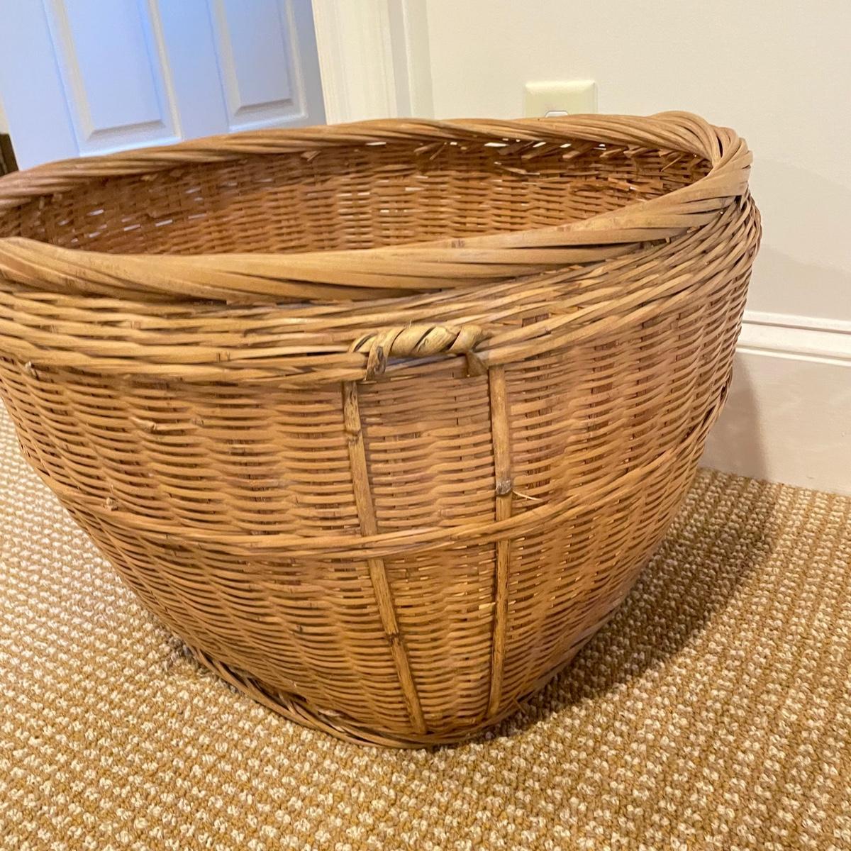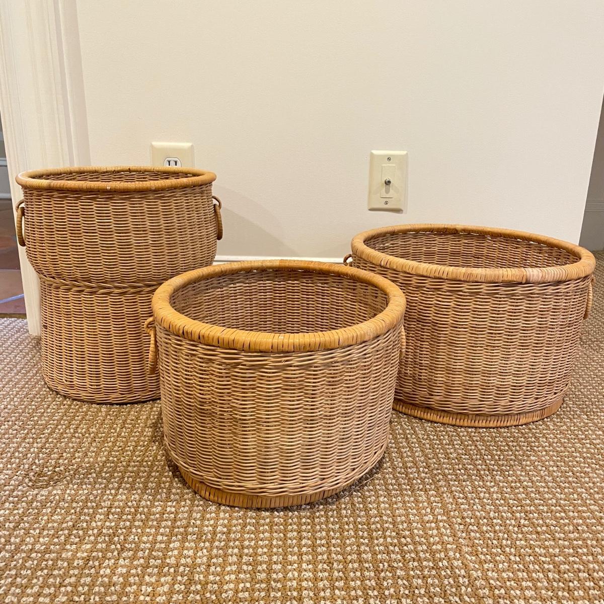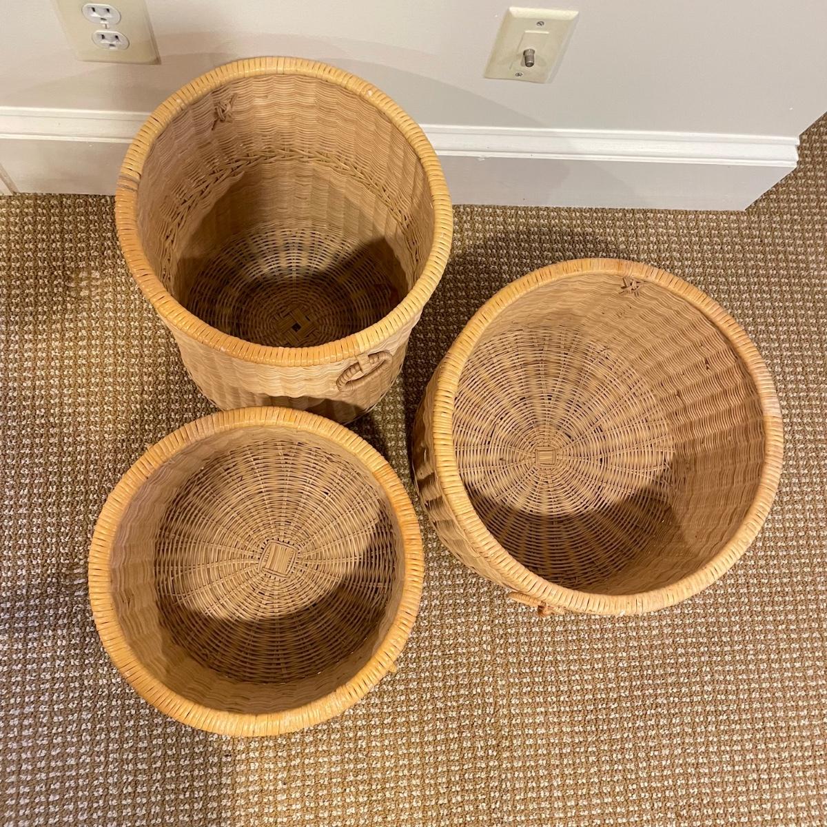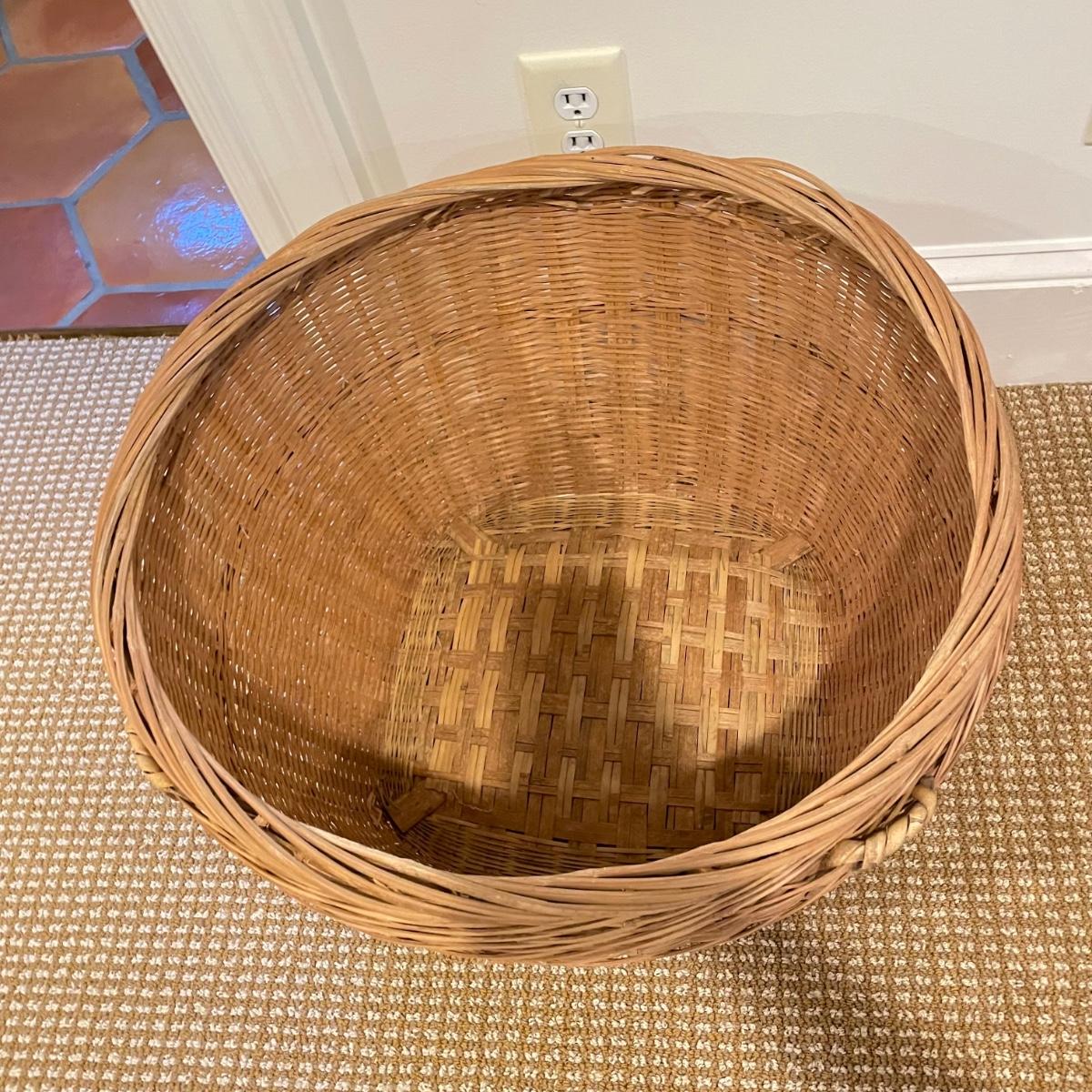 Two large woven baskets and three matching smaller baskets. The basket with small handles in all four “corners” measures 21”D x 14.5”H, the other large basket has a 24”D. Two of the three smaller baskets nest and have a bottom rim, while the third has a no rim. These three are matching in color, style, and handles. See images. Local pick up only.