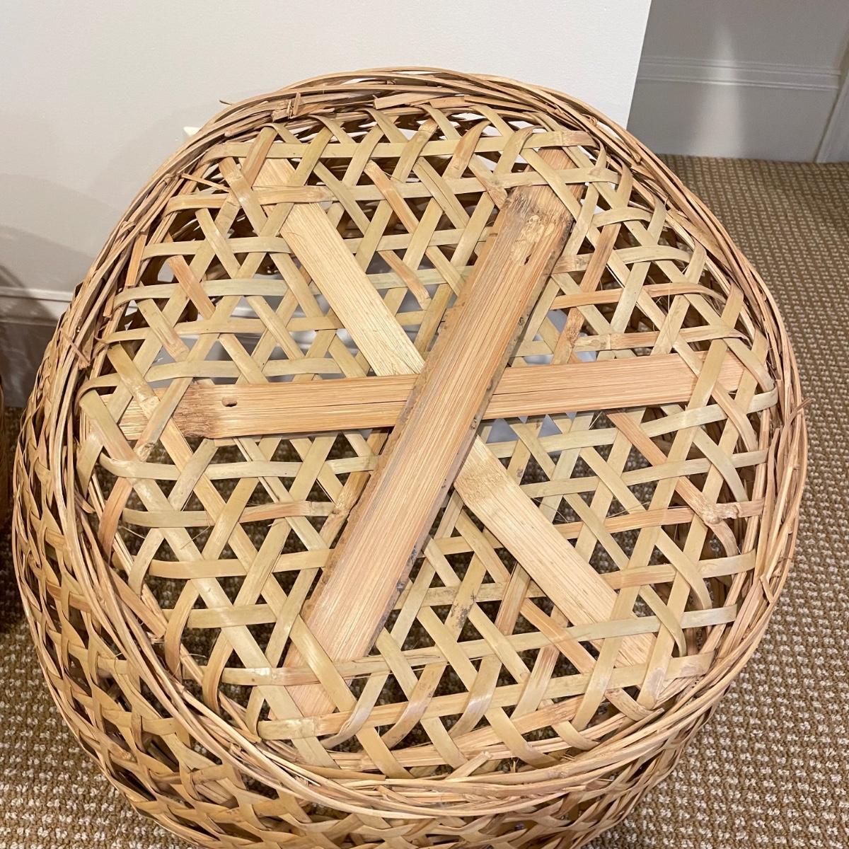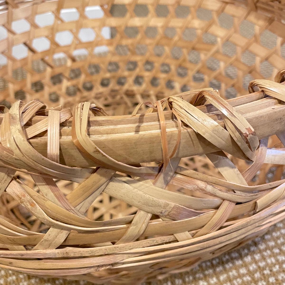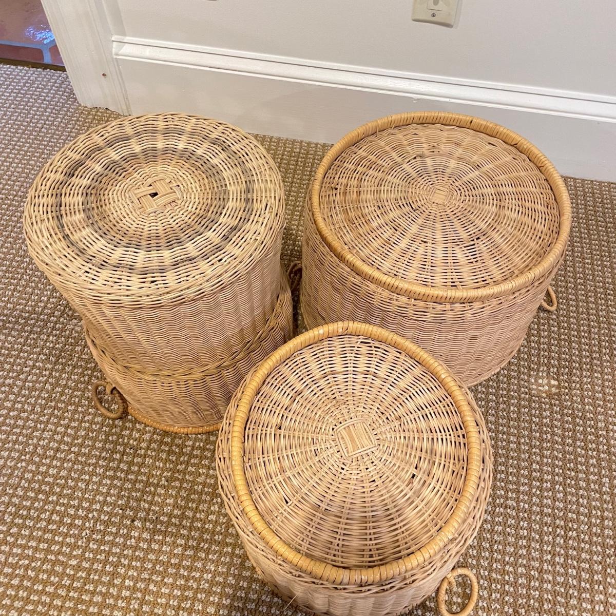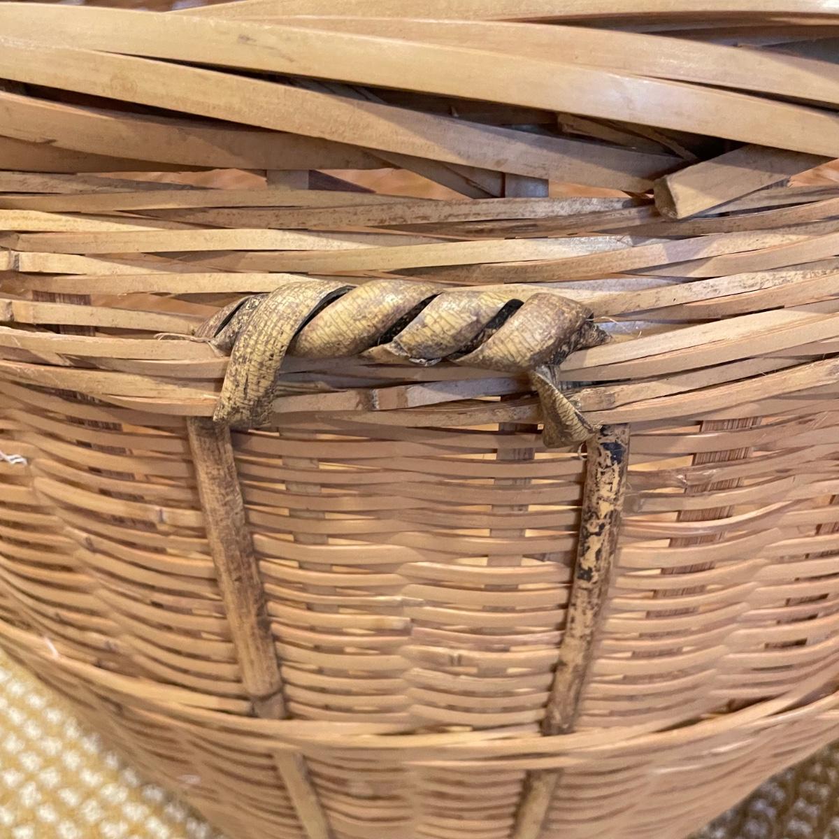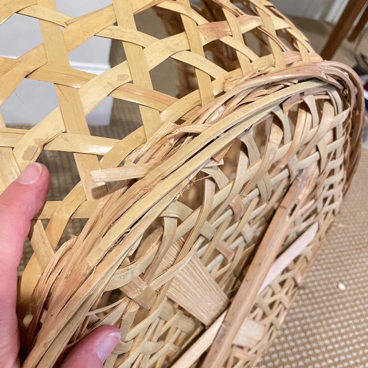Two large woven baskets and three matching smaller baskets. The basket with small handles in all four “corners” measures 21”D x 14.5”H, the other large basket has a 24”D. Two of the three smaller baskets nest and have a bottom rim, while the third has a no rim. These three are matching in color, style, and handles. See images. Local pick up only.