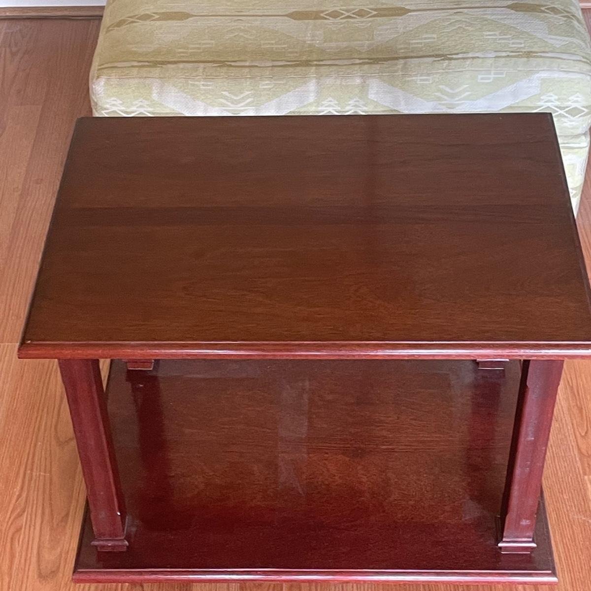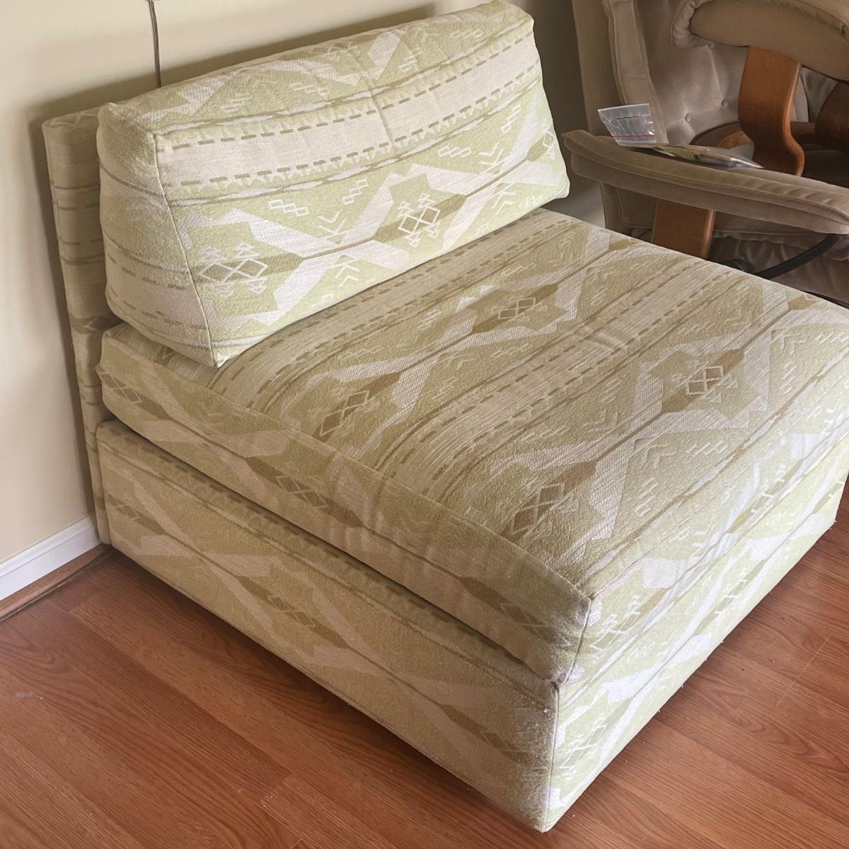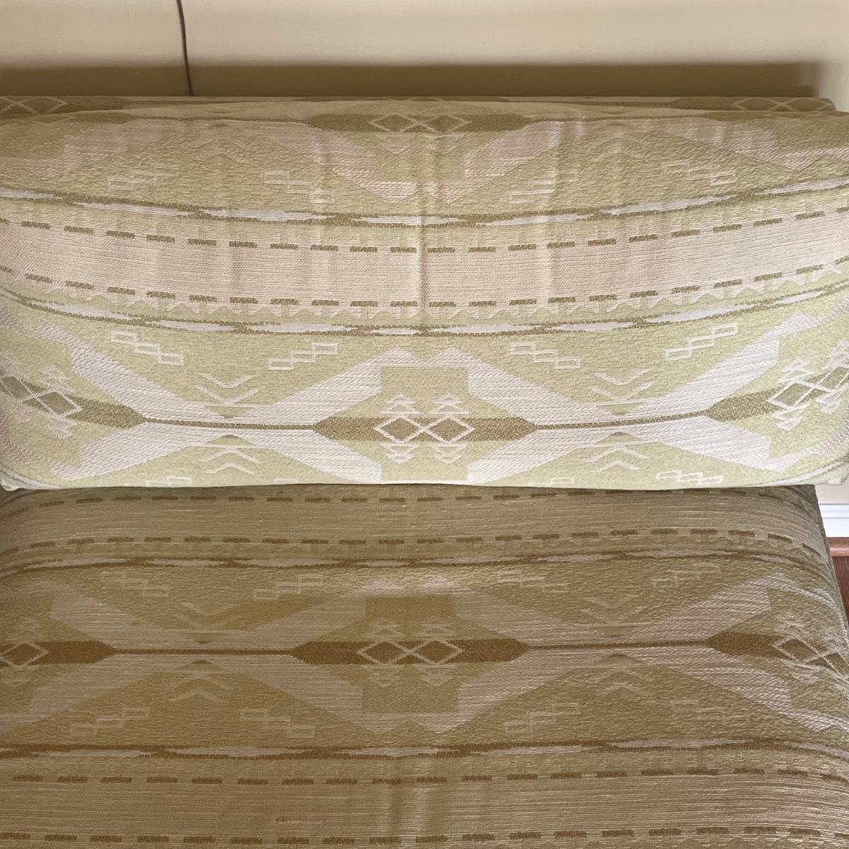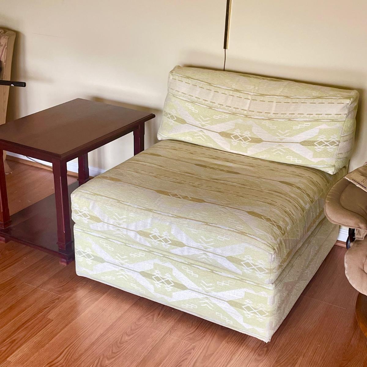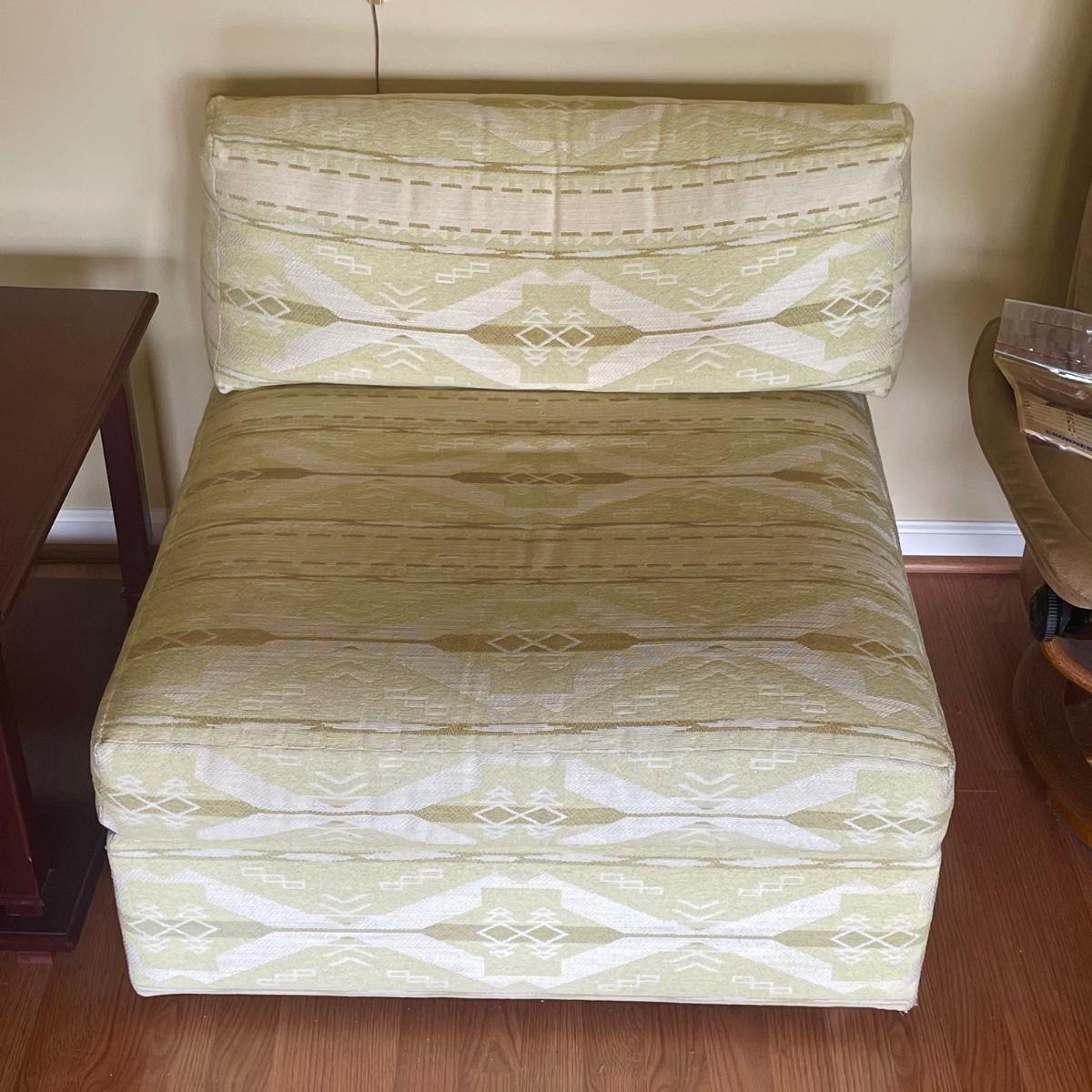 This attractive large chair with brass colored wheels is upholstered in a soft woven fabric that has a southwestern design in pale green and tan. Chair has a stain which is conveniently hidden by the backrest cushion, see image. Chair measures 31” wide x 33” deep x 27” tall with 15” seat height. The accompanying side table is a dark cherry colored solid wood with a lower shelf; table is in great condition and measures 17.5” x 25.5” x 20” tall.