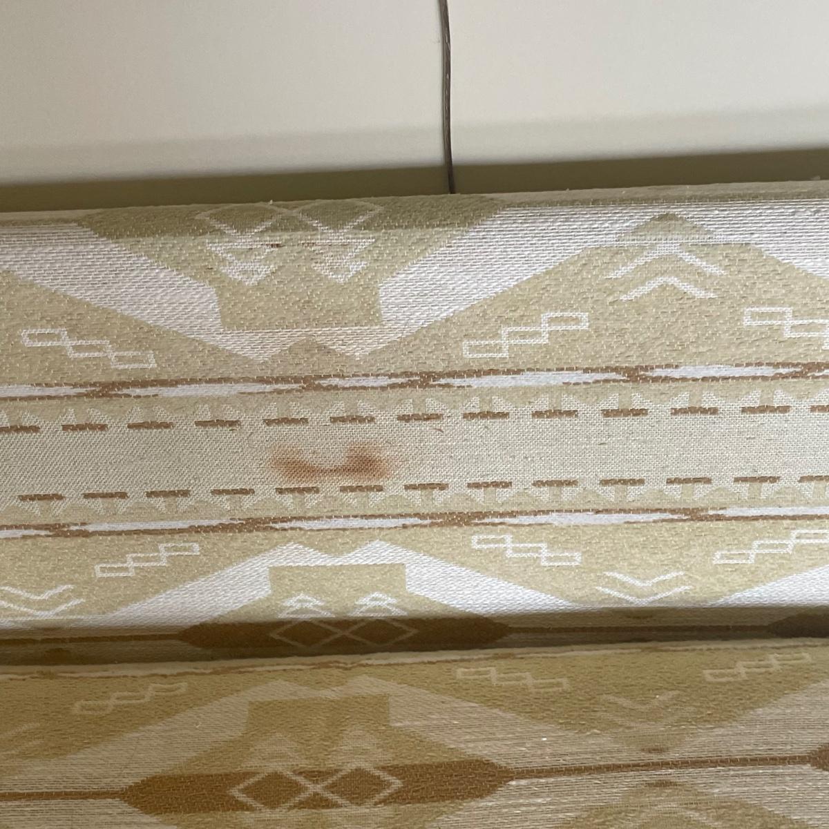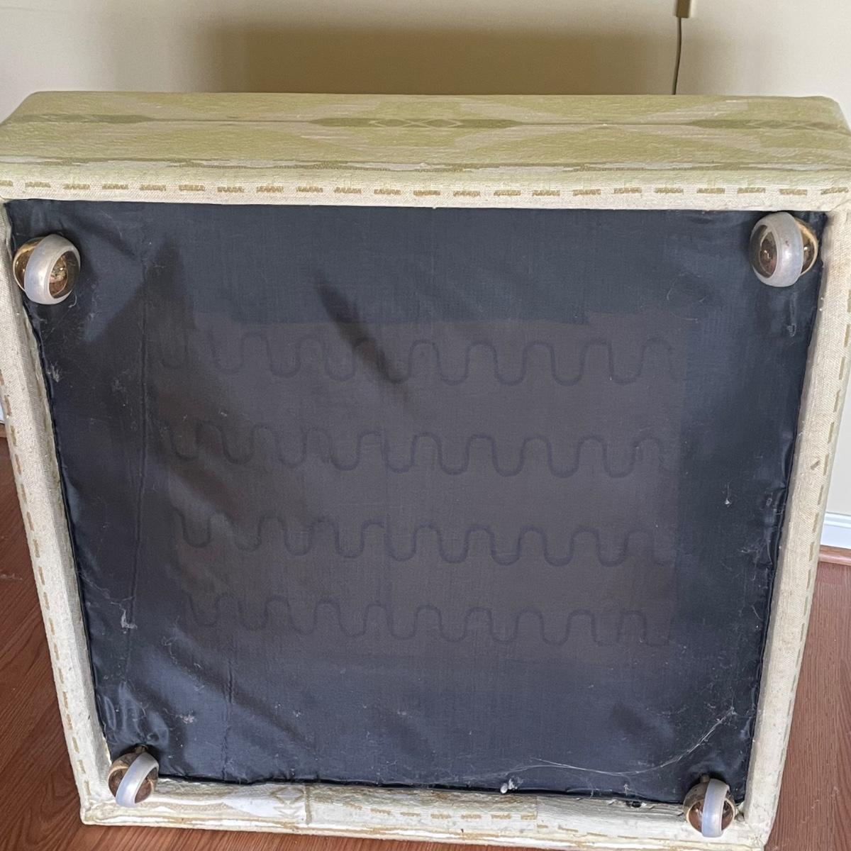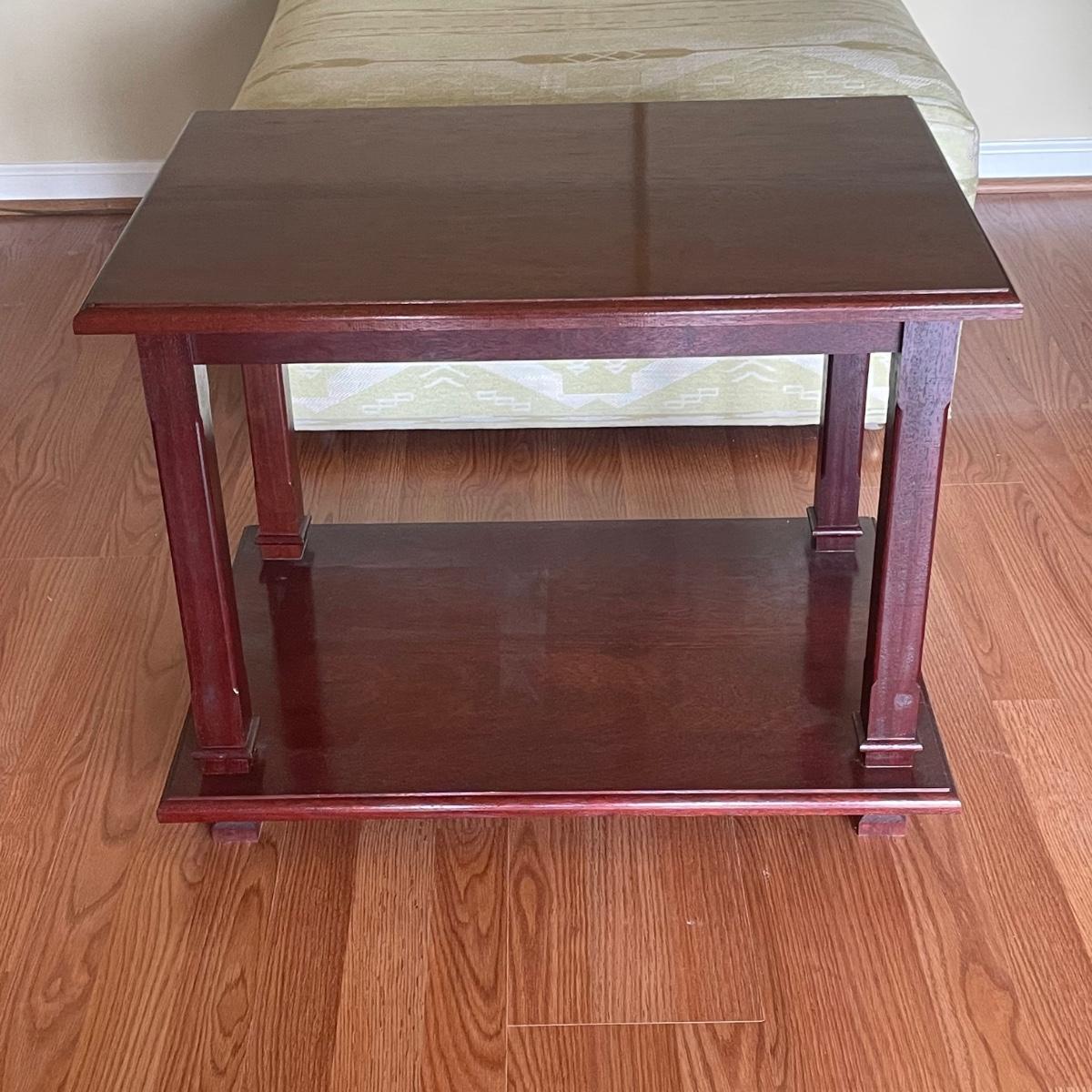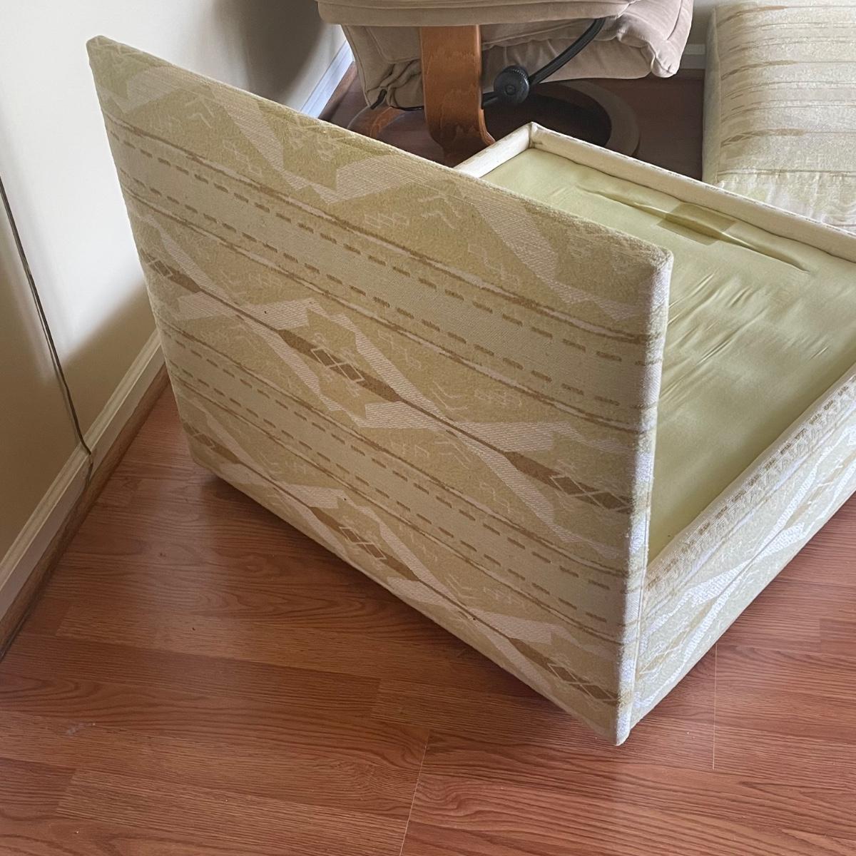 This attractive large chair with brass colored wheels is upholstered in a soft woven fabric that has a southwestern design in pale green and tan. Chair has a stain which is conveniently hidden by the backrest cushion, see image. Chair measures 31” wide x 33” deep x 27” tall with 15” seat height. The accompanying side table is a dark cherry colored solid wood with a lower shelf; table is in great condition and measures 17.5” x 25.5” x 20” tall.