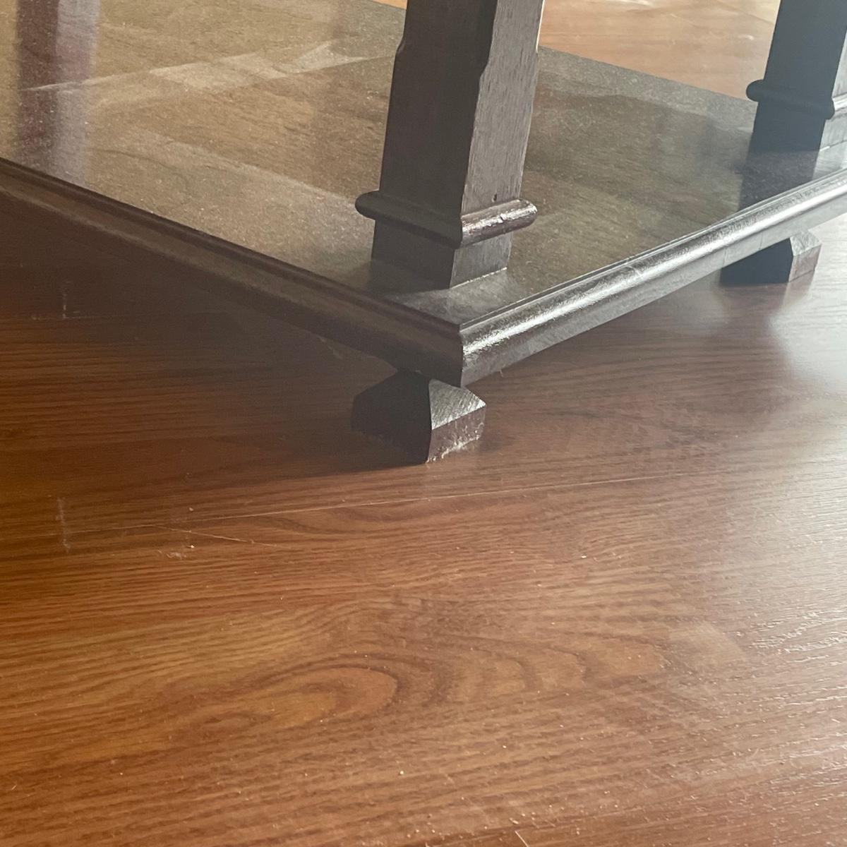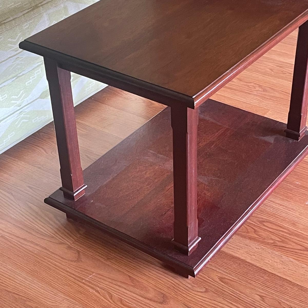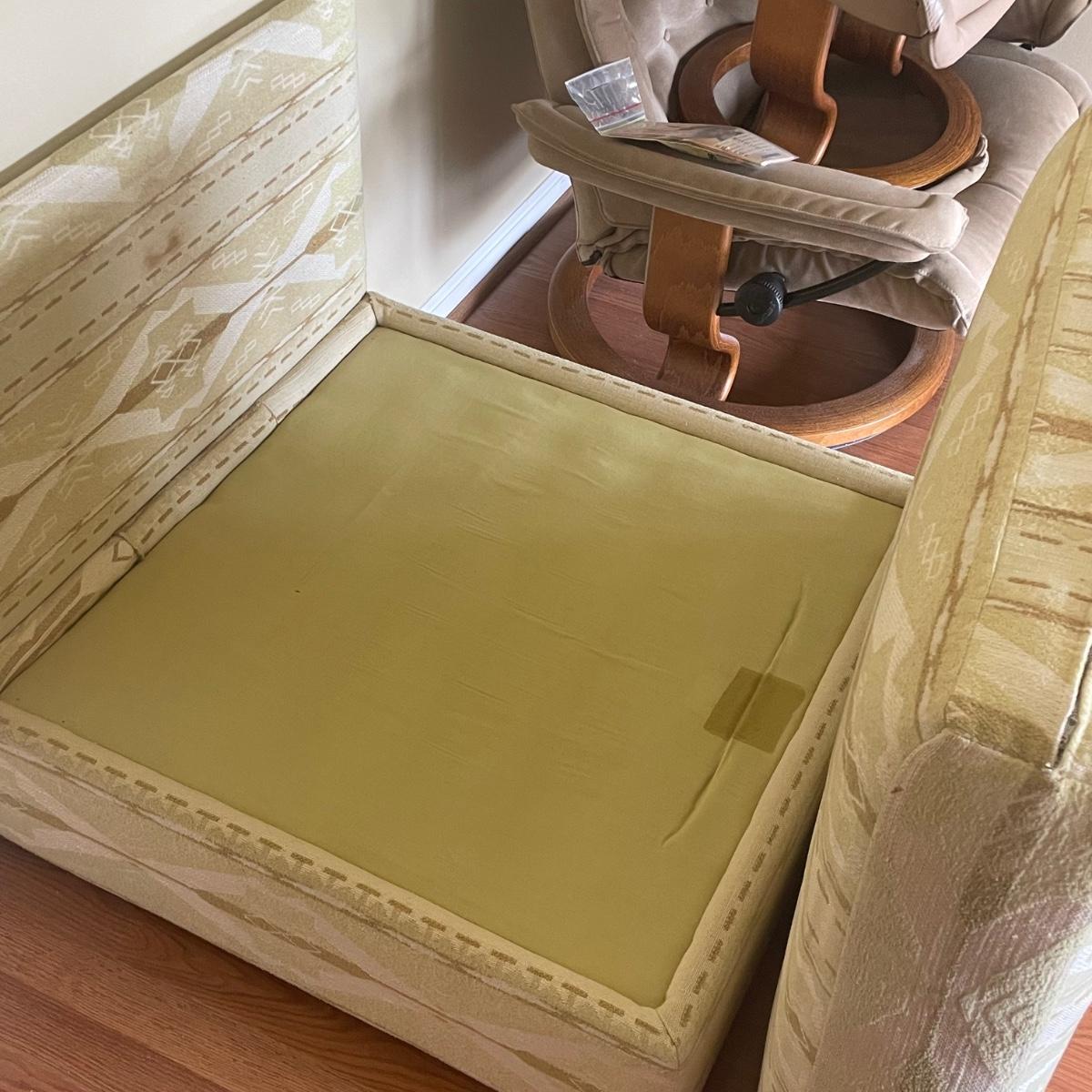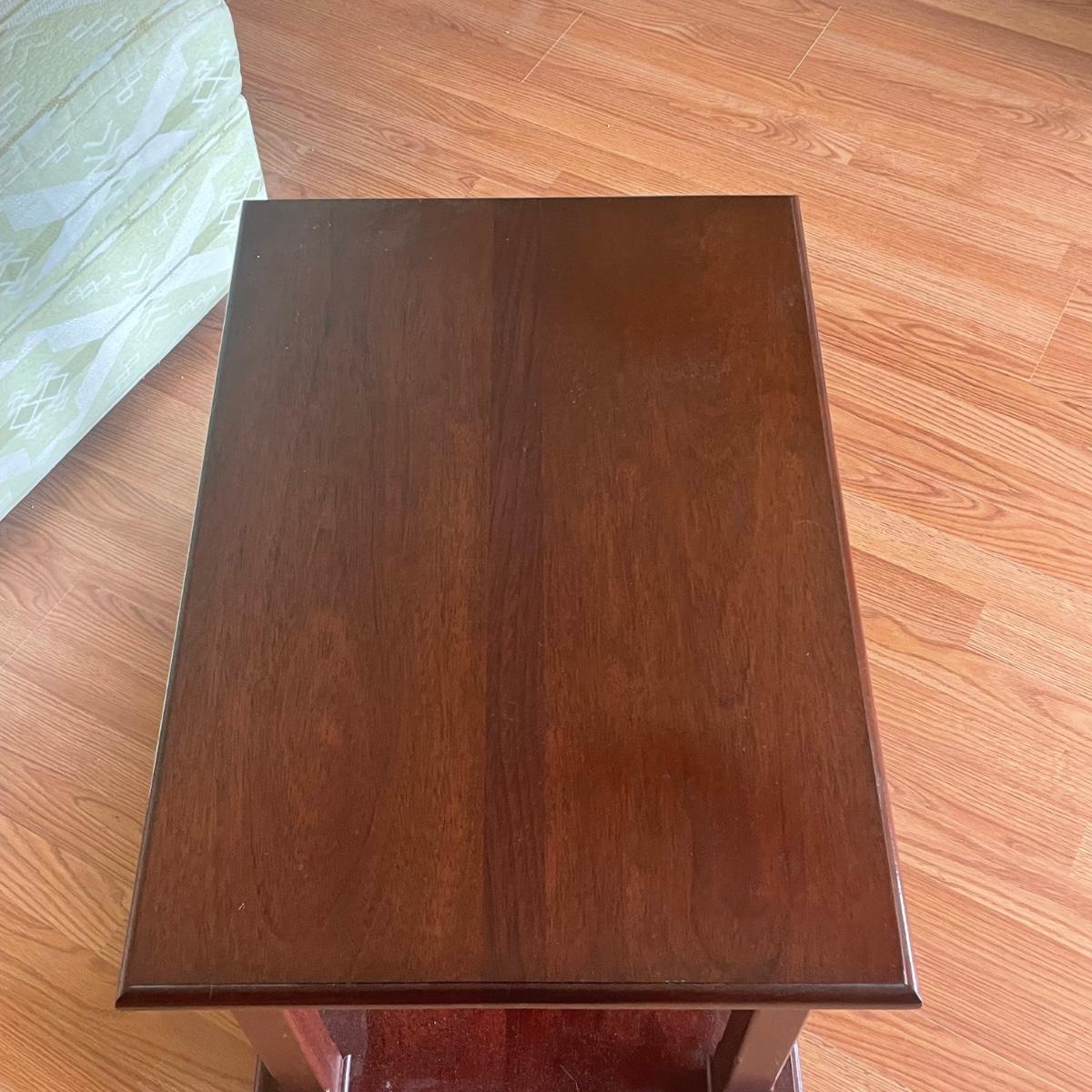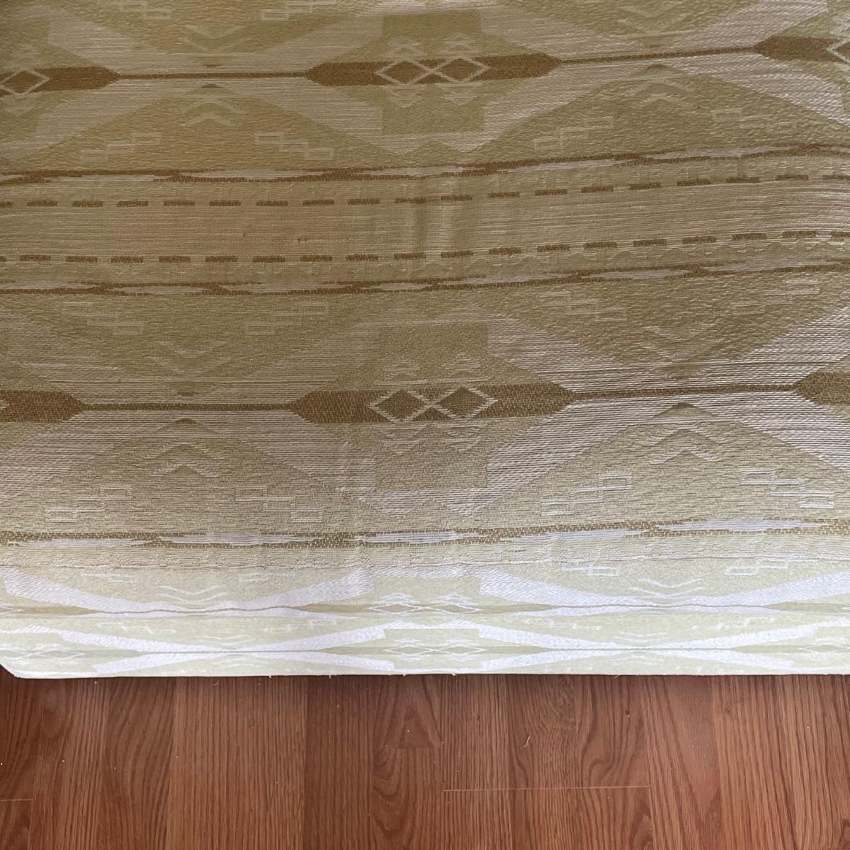 This attractive large chair with brass colored wheels is upholstered in a soft woven fabric that has a southwestern design in pale green and tan. Chair has a stain which is conveniently hidden by the backrest cushion, see image. Chair measures 31” wide x 33” deep x 27” tall with 15” seat height. The accompanying side table is a dark cherry colored solid wood with a lower shelf; table is in great condition and measures 17.5” x 25.5” x 20” tall.
