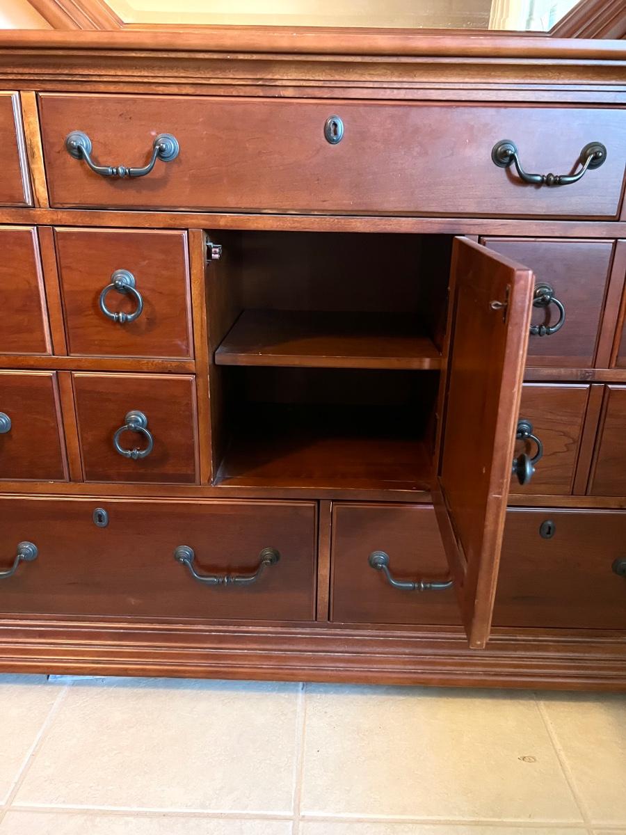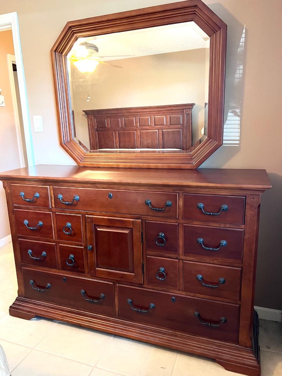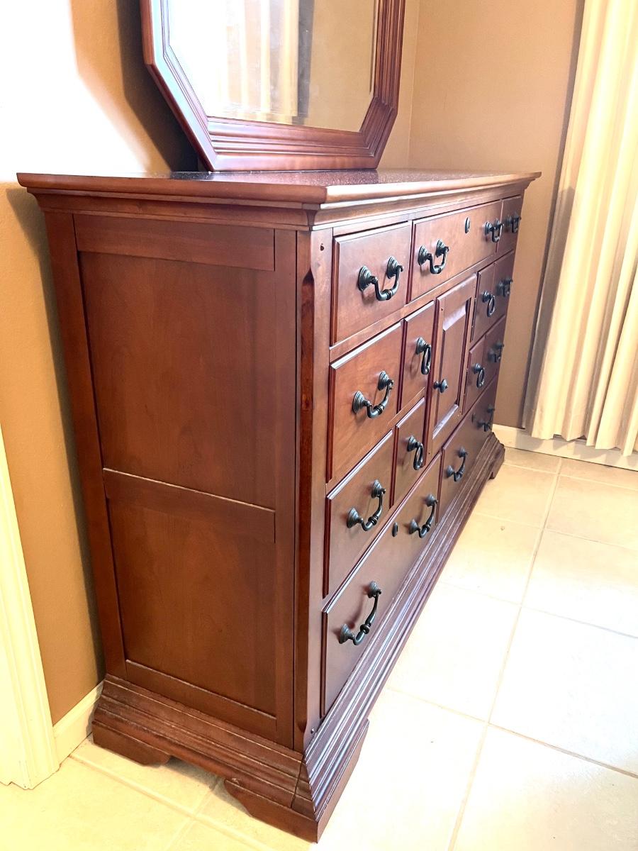 Cherrywood Dresser with 9 drawers and two storage shelves. Dresser only measures 40 inches tall, 64 inches wide and 18 inches deep. Mirror measures 37 inches tall and 45 inches wides.