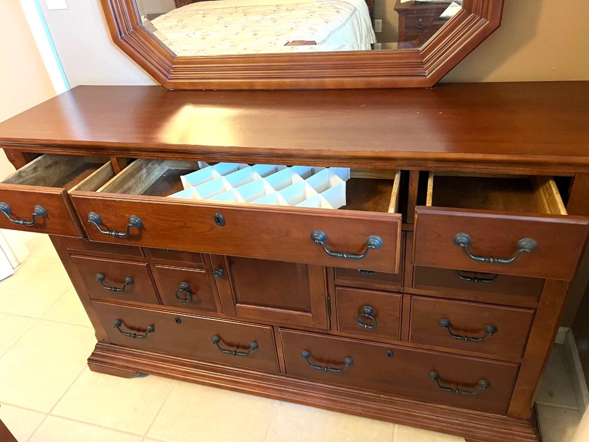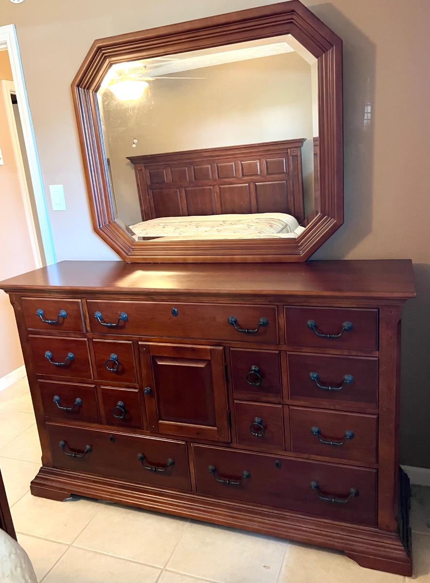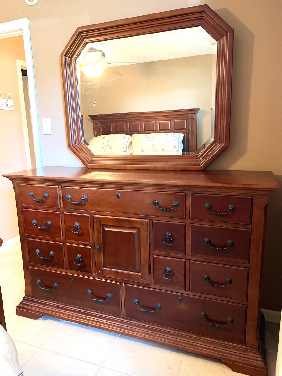 Cherrywood Dresser with 9 drawers and two storage shelves. Dresser only measures 40 inches tall, 64 inches wide and 18 inches deep. Mirror measures 37 inches tall and 45 inches wides.