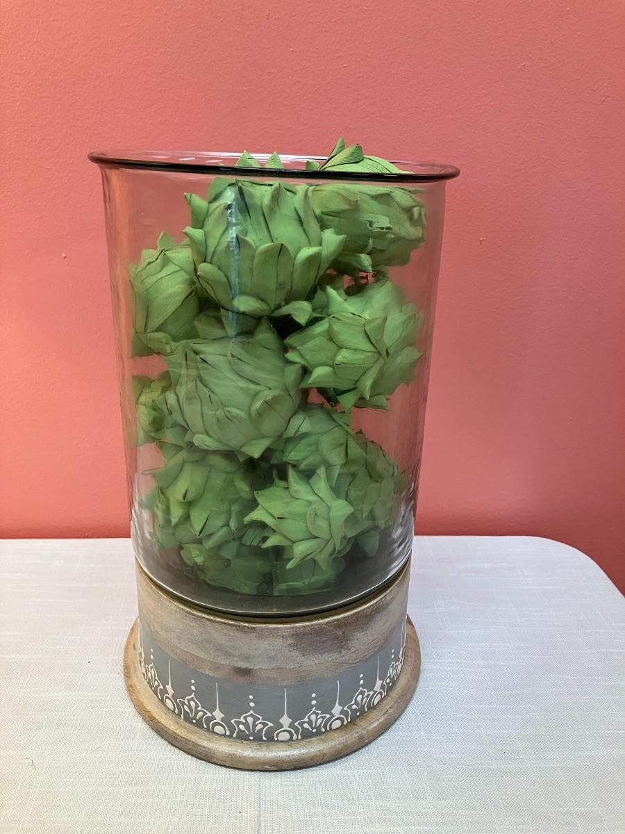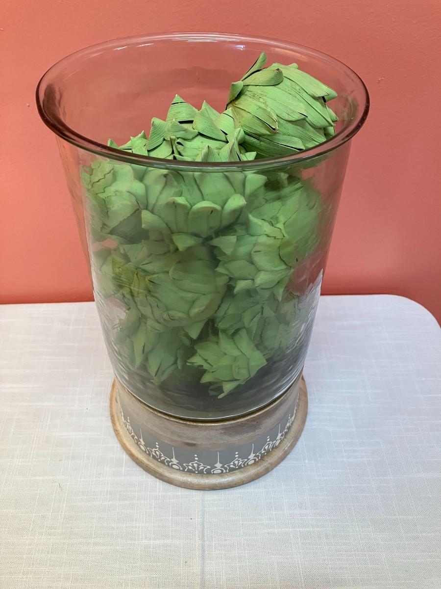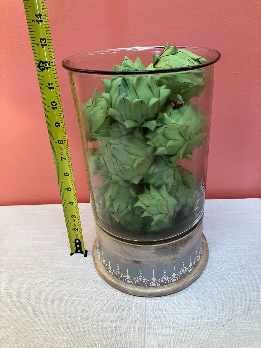 Large oversized glass vase and paper artichoke home decor piece