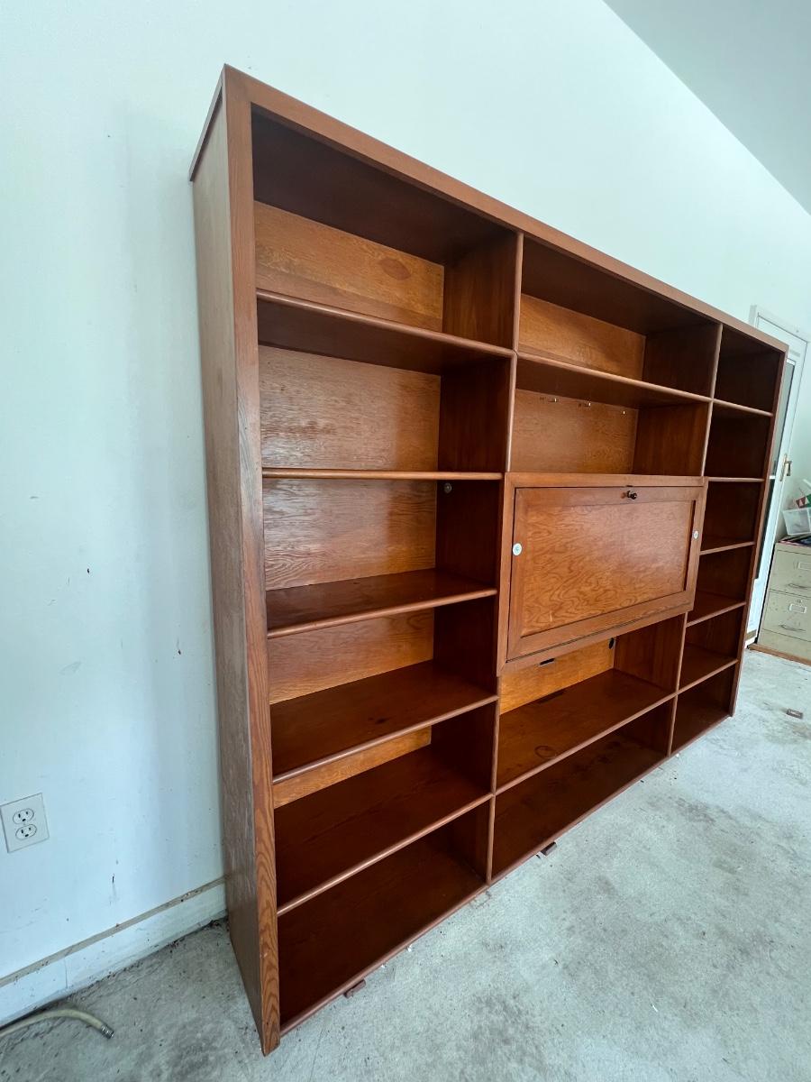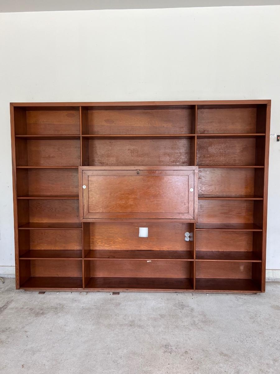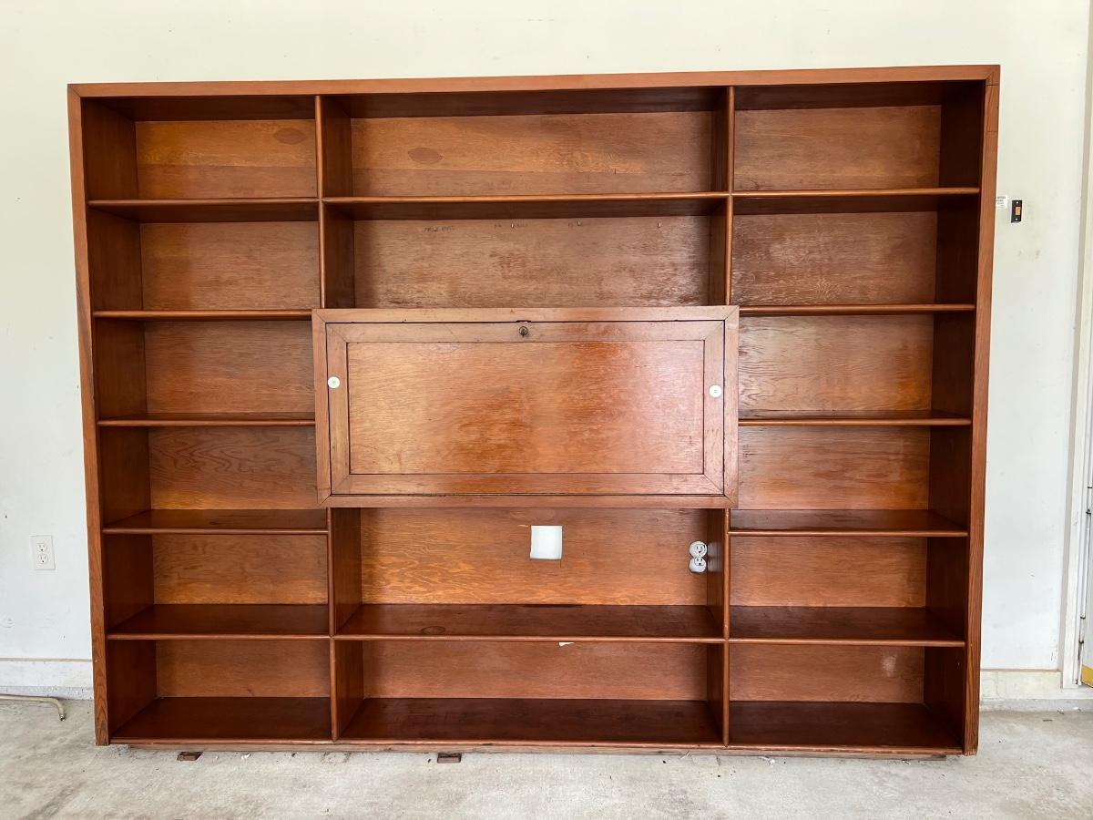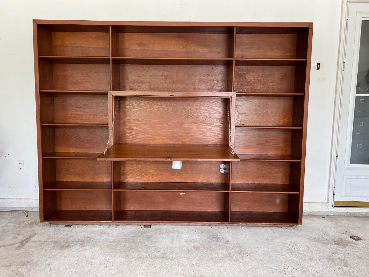 Before bidding please know this is EXTREMELY HEAVY, ONE PIECE, WILL REQUIRE A TRAILER, and you must bring help to load. We can not help. This wall unit has multiple shelves for storage and storage space that locks. Does have some writing on one of the shelves, see pictures. Measure 74 inches tall, 97 inches wide and 12 inches deep.