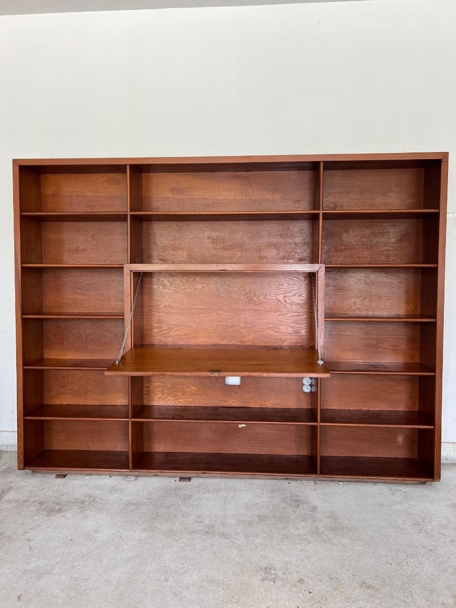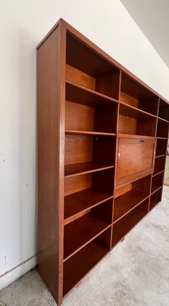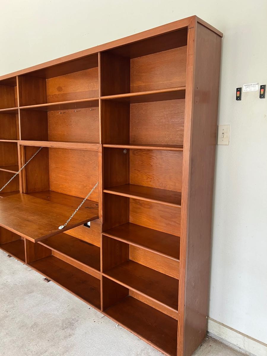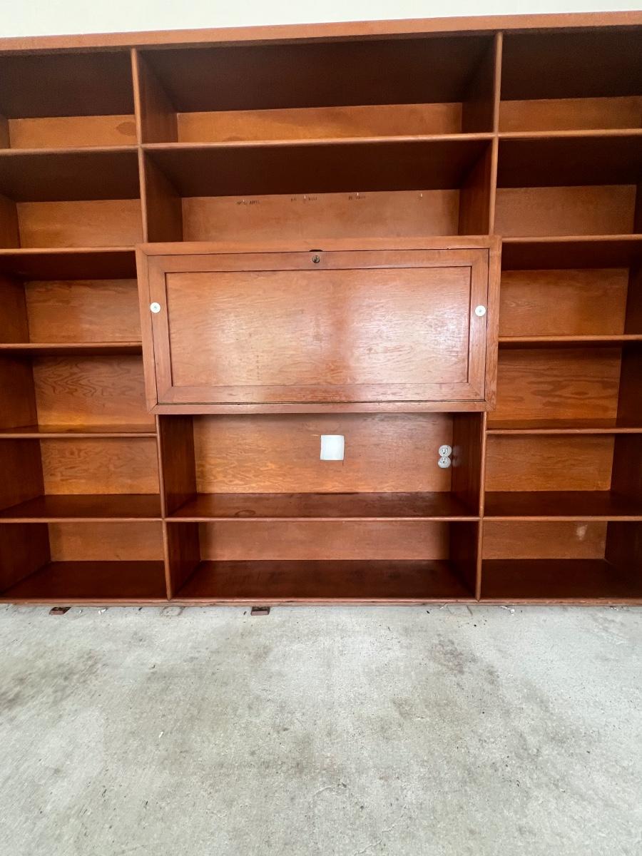 Before bidding please know this is EXTREMELY HEAVY, ONE PIECE, WILL REQUIRE A TRAILER, and you must bring help to load. We can not help. This wall unit has multiple shelves for storage and storage space that locks. Does have some writing on one of the shelves, see pictures. Measure 74 inches tall, 97 inches wide and 12 inches deep.