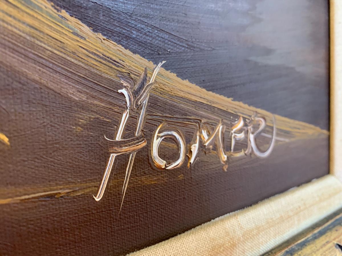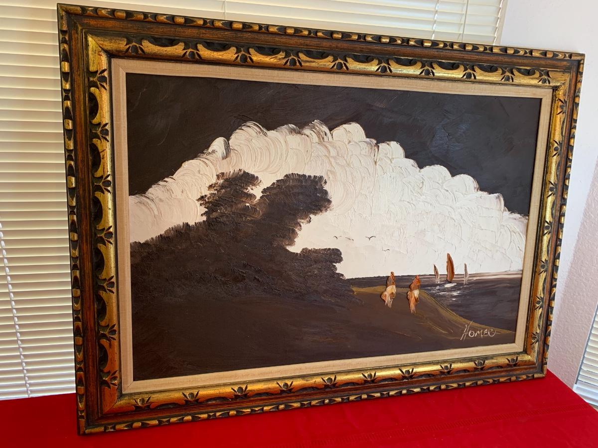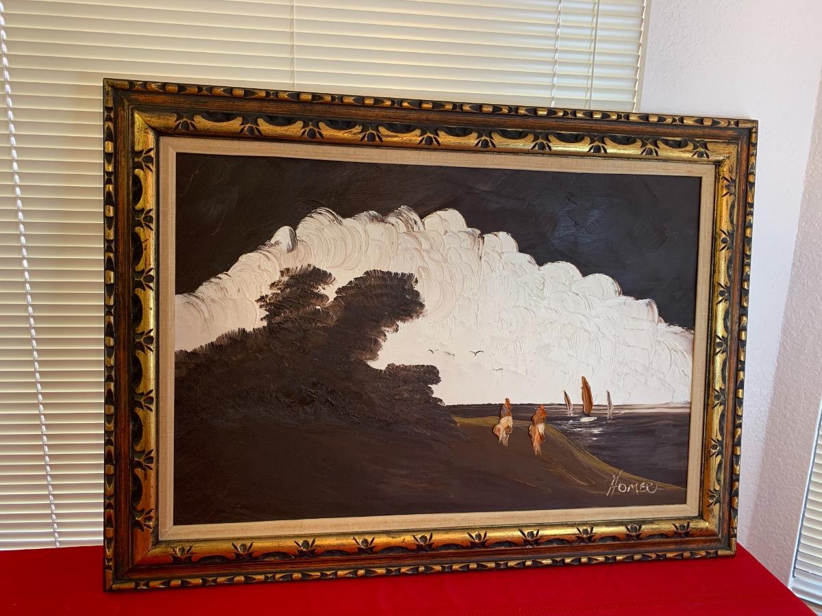Very large Homer Costello original oil painting in impasto style. Landscape with figures on a beach. Signed Homer. Frame measures 44” by 32”
