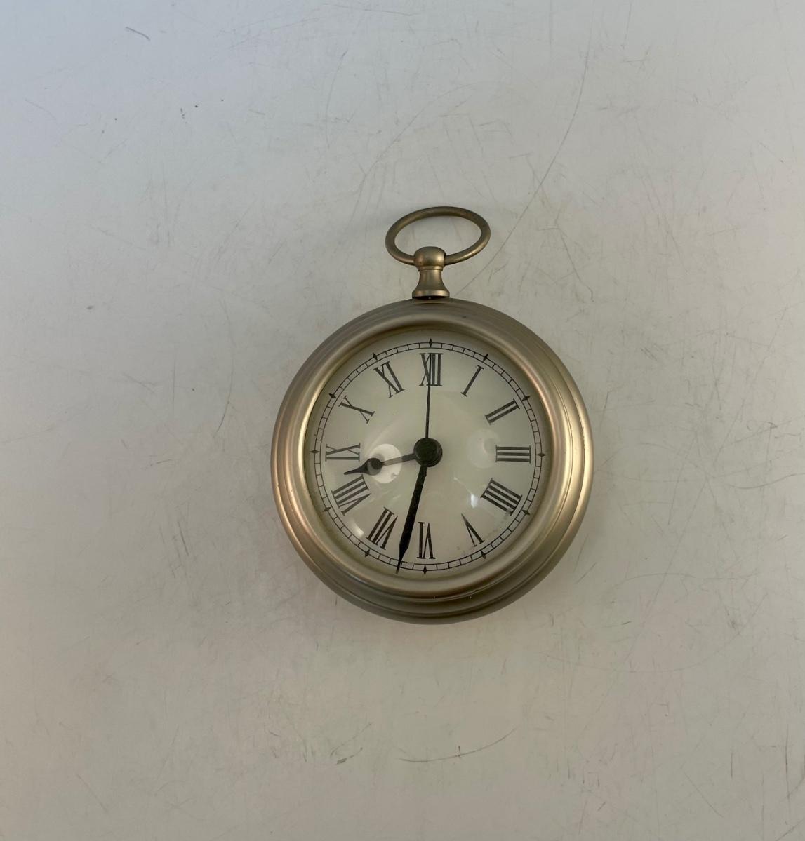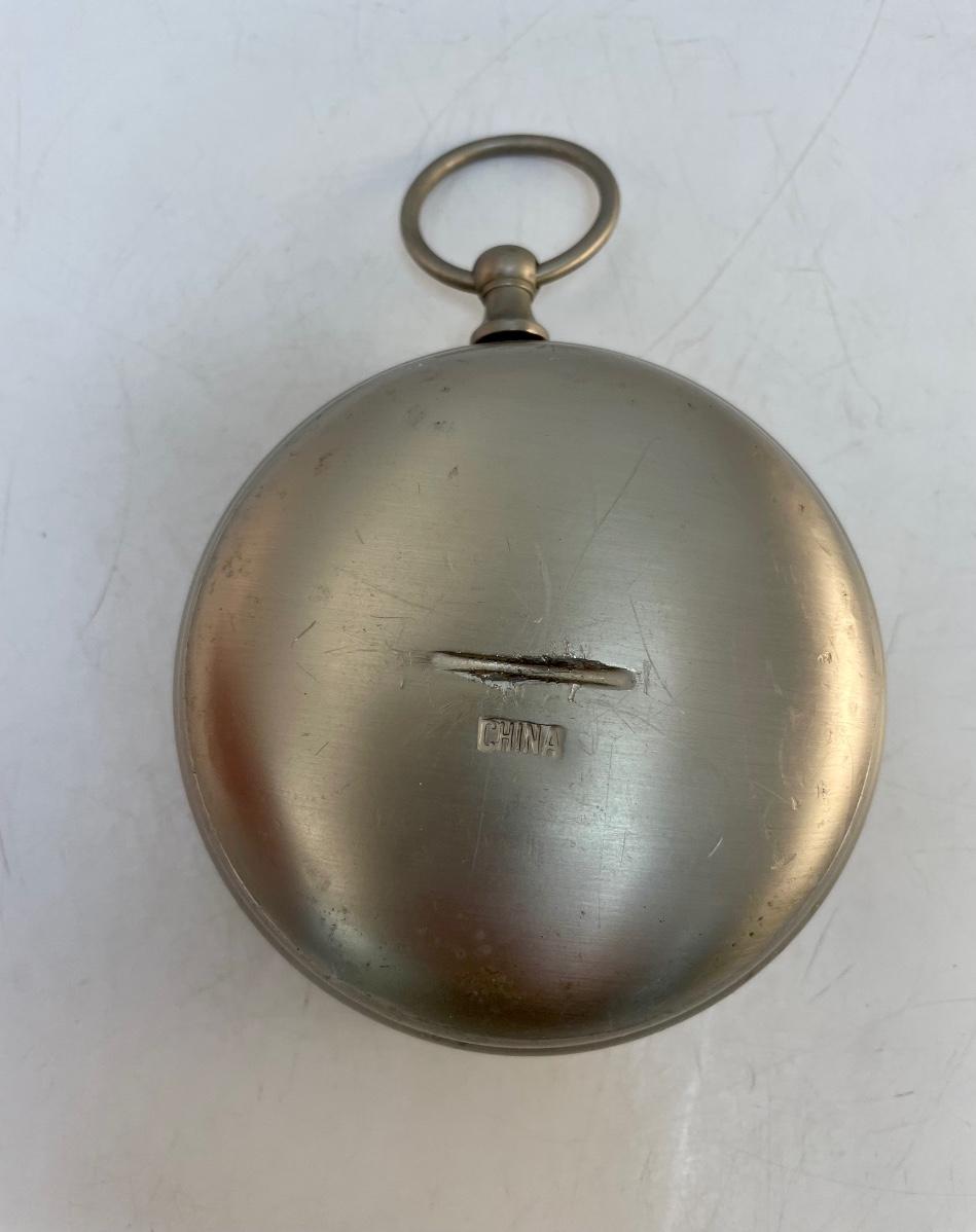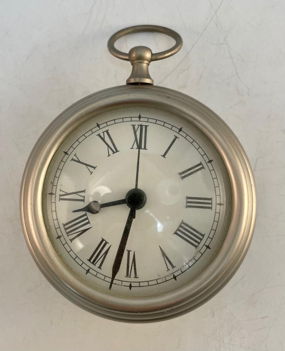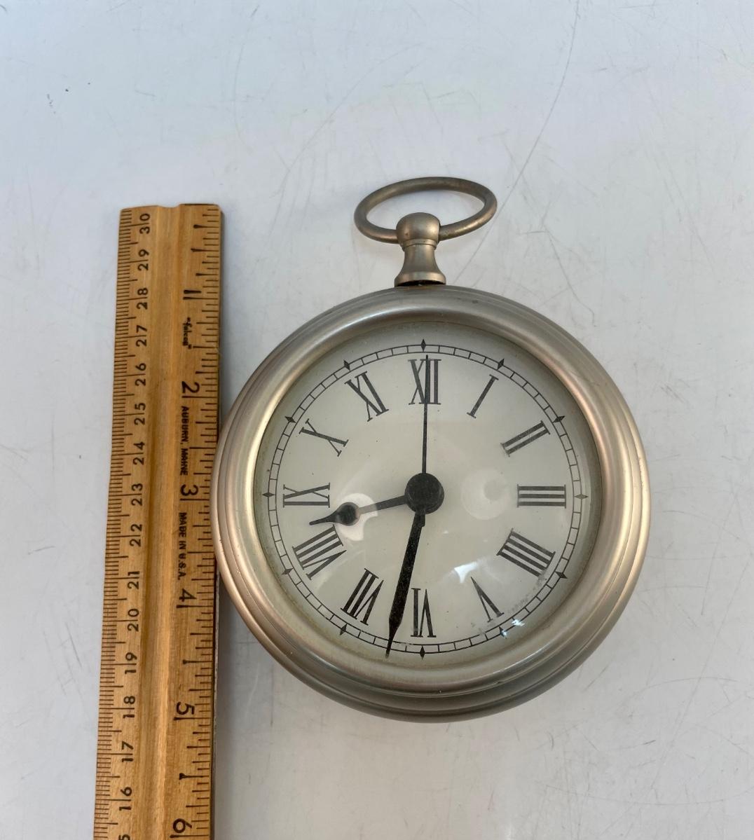 Battery powered, but was unable to get it to run. Great for display or as home decor. Brushed nickel case. Made in China. Approx. 5" tall.