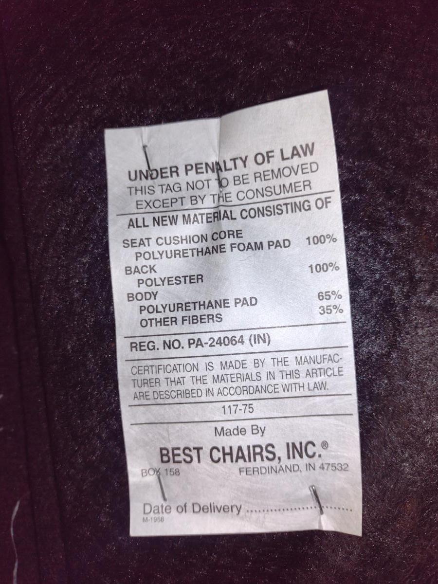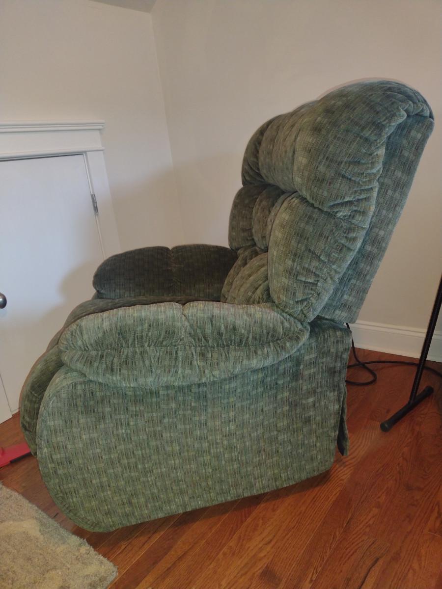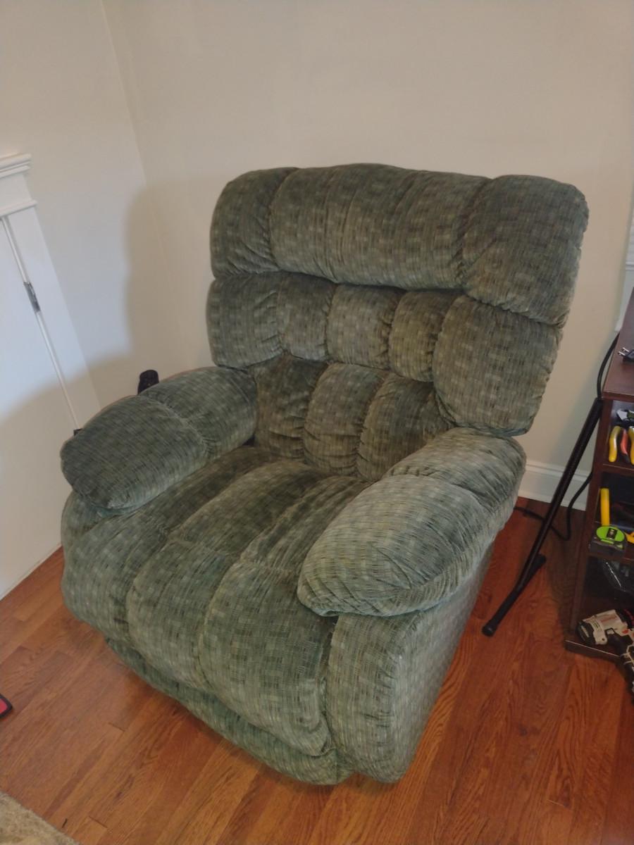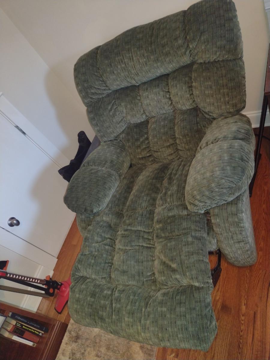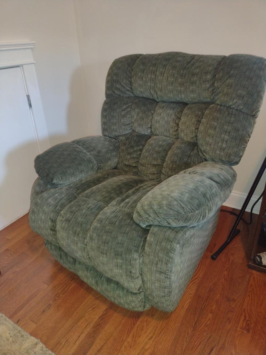 Oversized Rocker Reclining Chair. Item may need to be cleaned. Back removes from item for easier removal. Item is located upstairs. Please bring help for safe removal.
