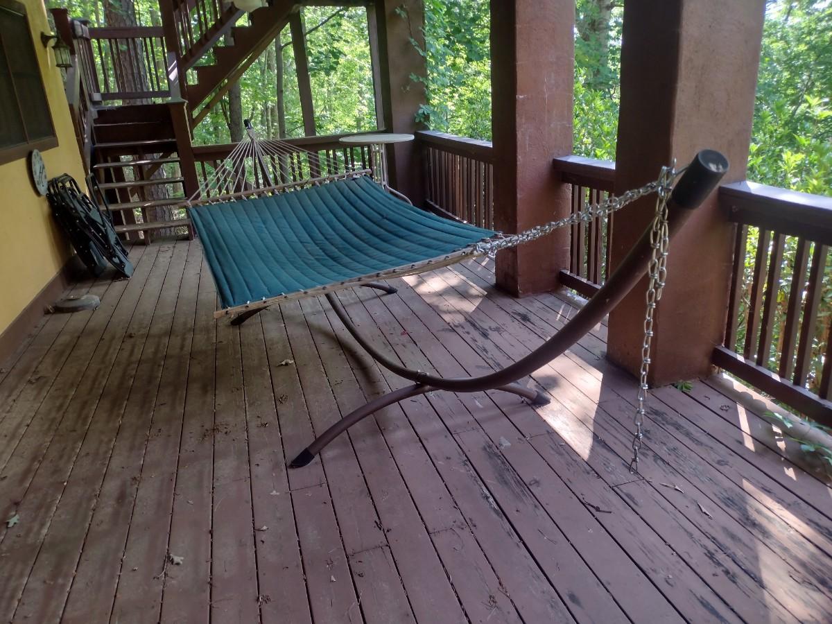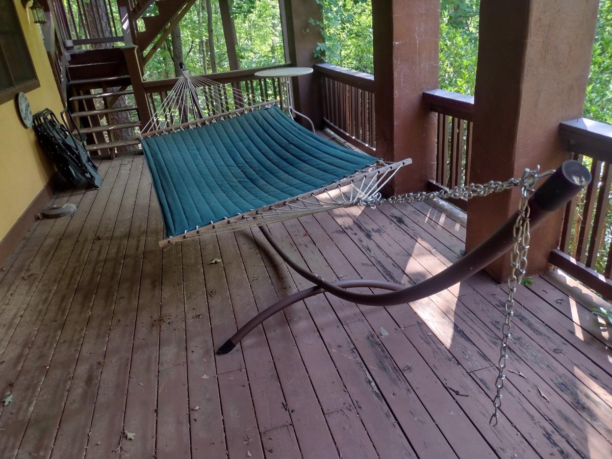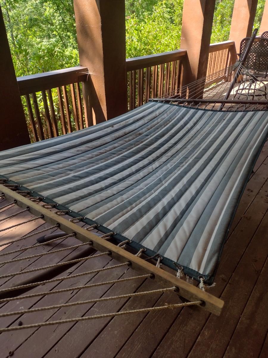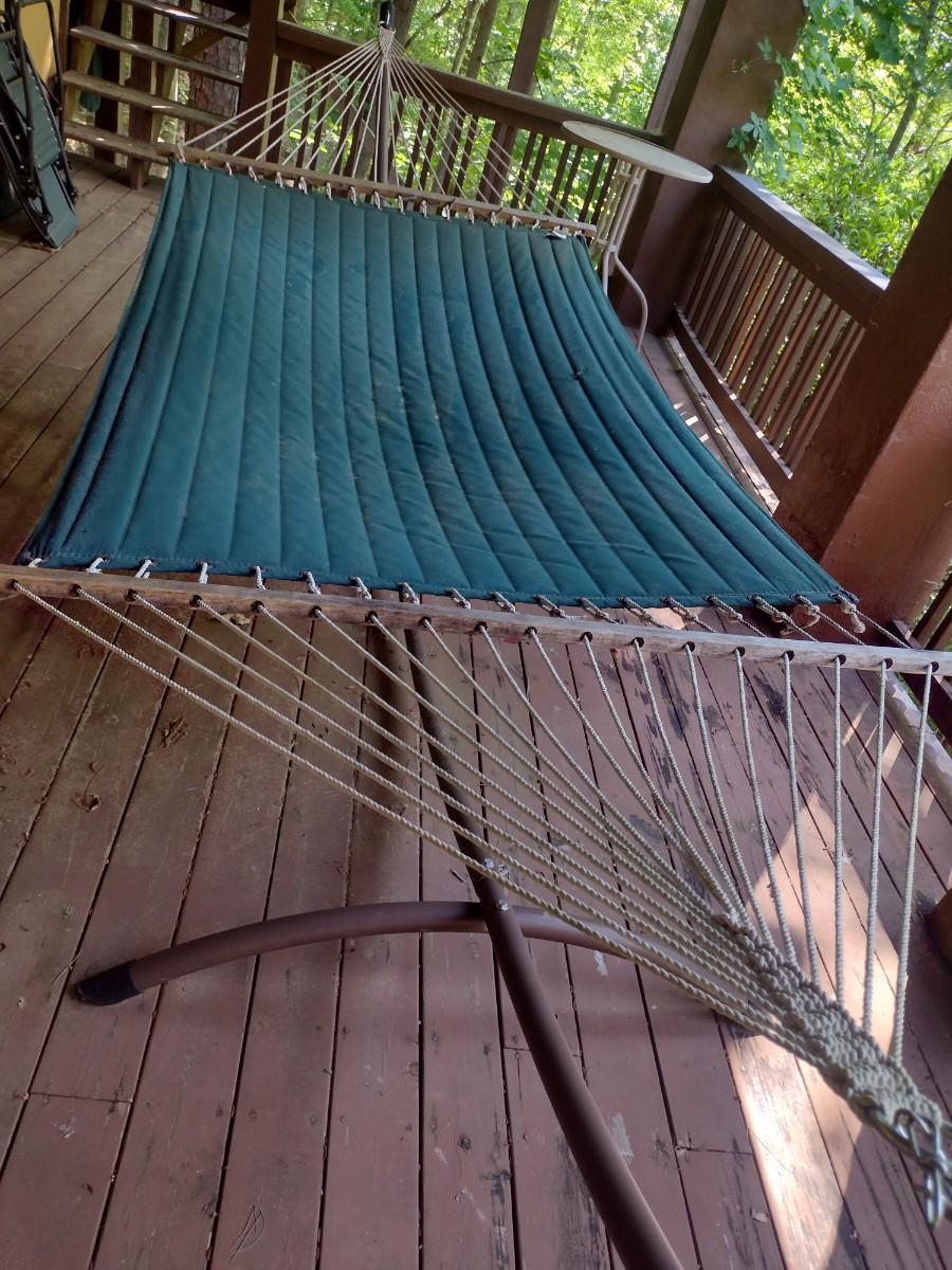 Oversized Swing Hammock with Metal Frame. Will need cleaning. Lower-level item. Bring tools to break down and assistance to carry up the stairs to the main floor.