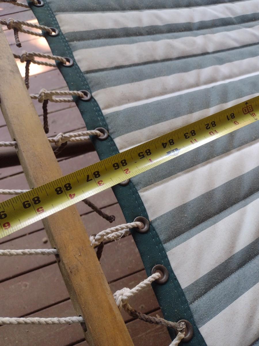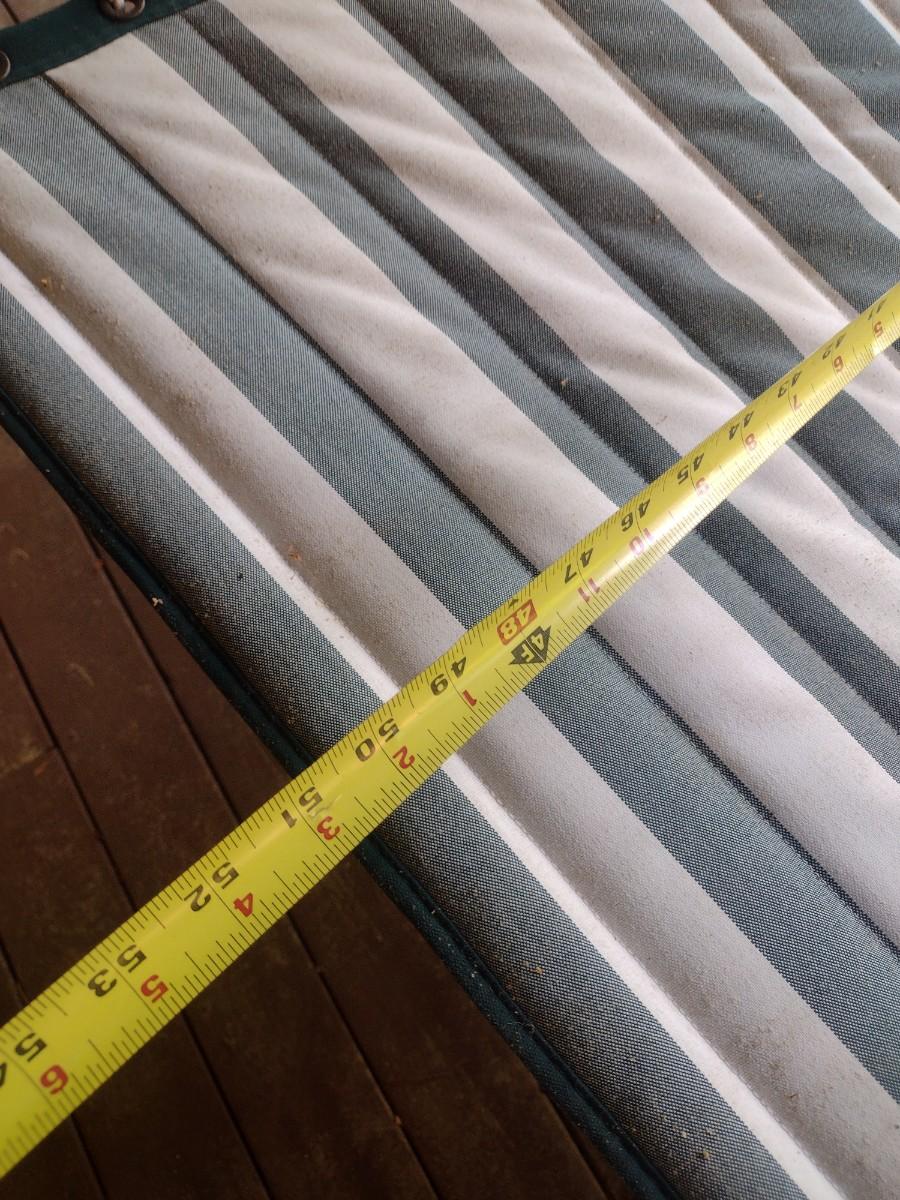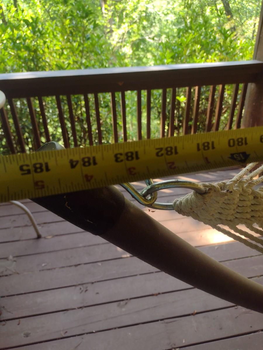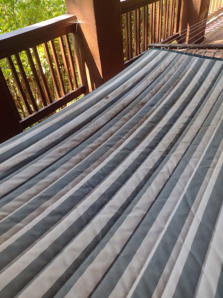 Oversized Swing Hammock with Metal Frame. Will need cleaning. Lower-level item. Bring tools to break down and assistance to carry up the stairs to the main floor.