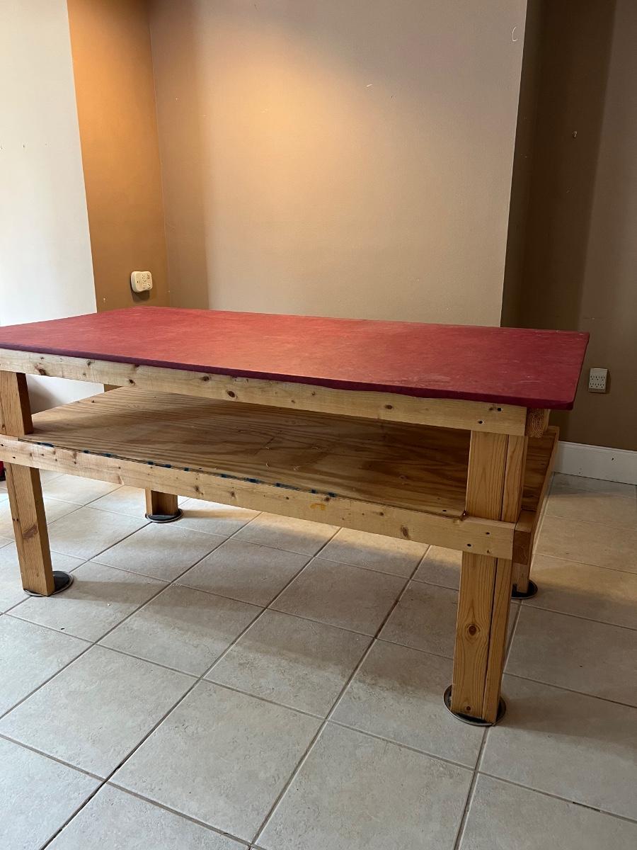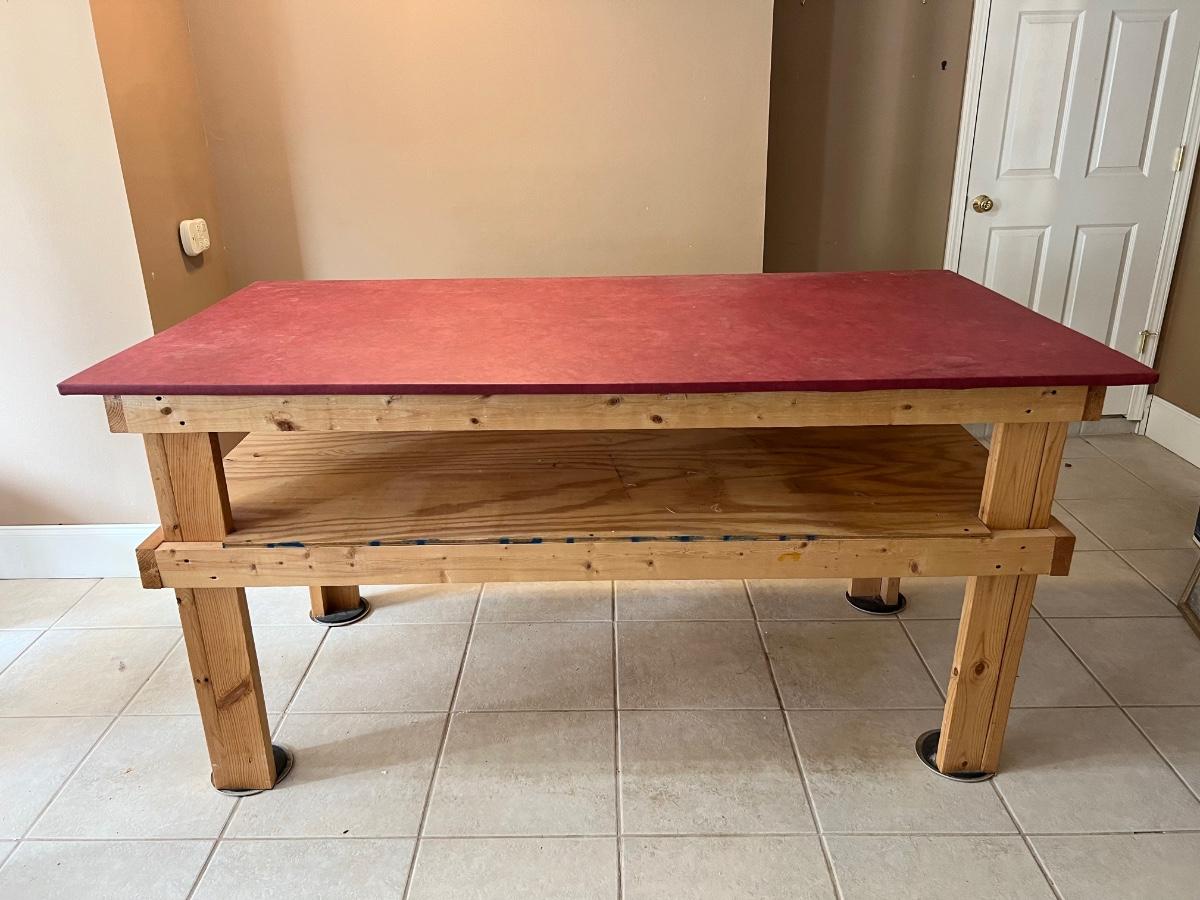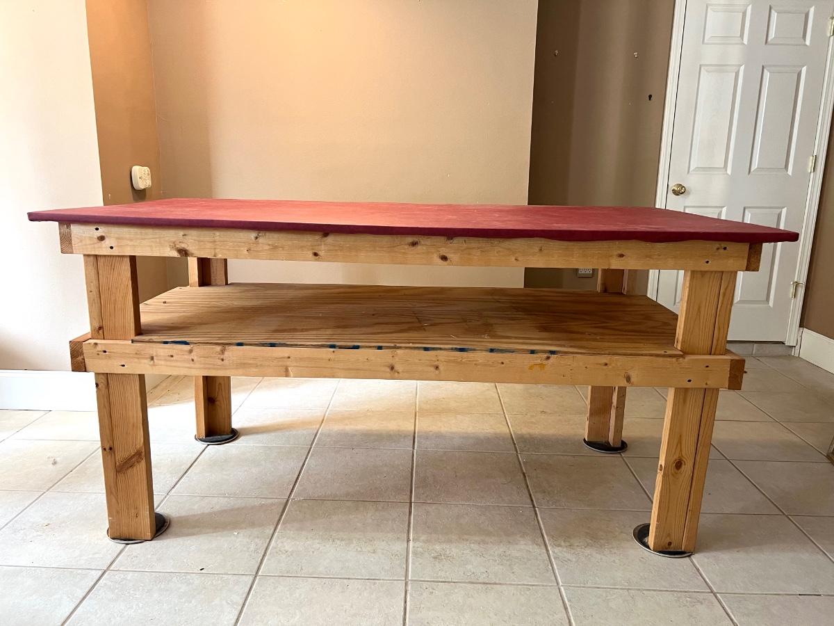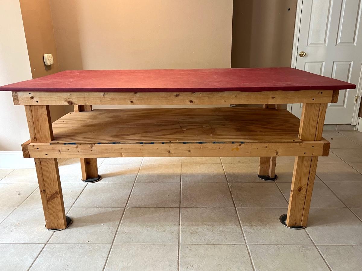 Huge Wooden work table with storage. You will need two strong people to move this. Measures 38 inches tall, 76 inches wide and 40 1/2 inches deep.