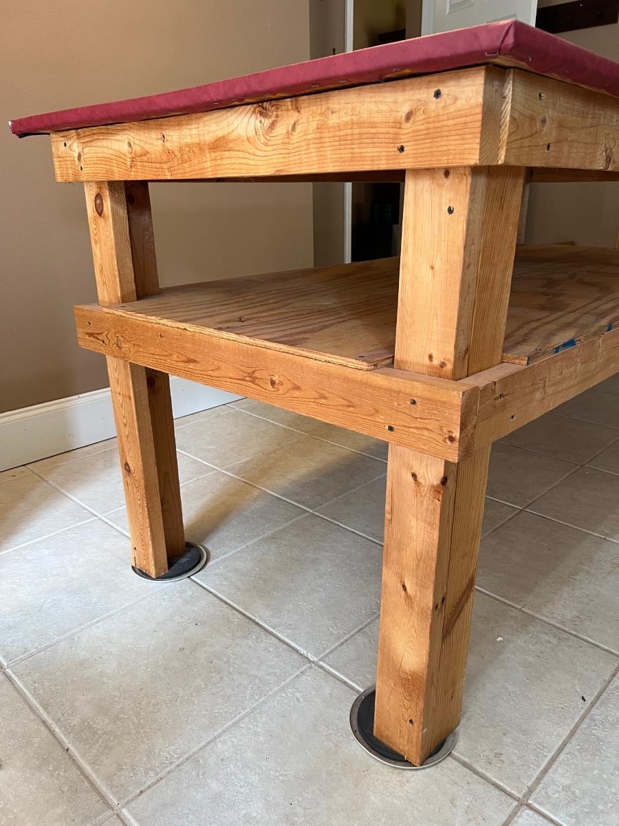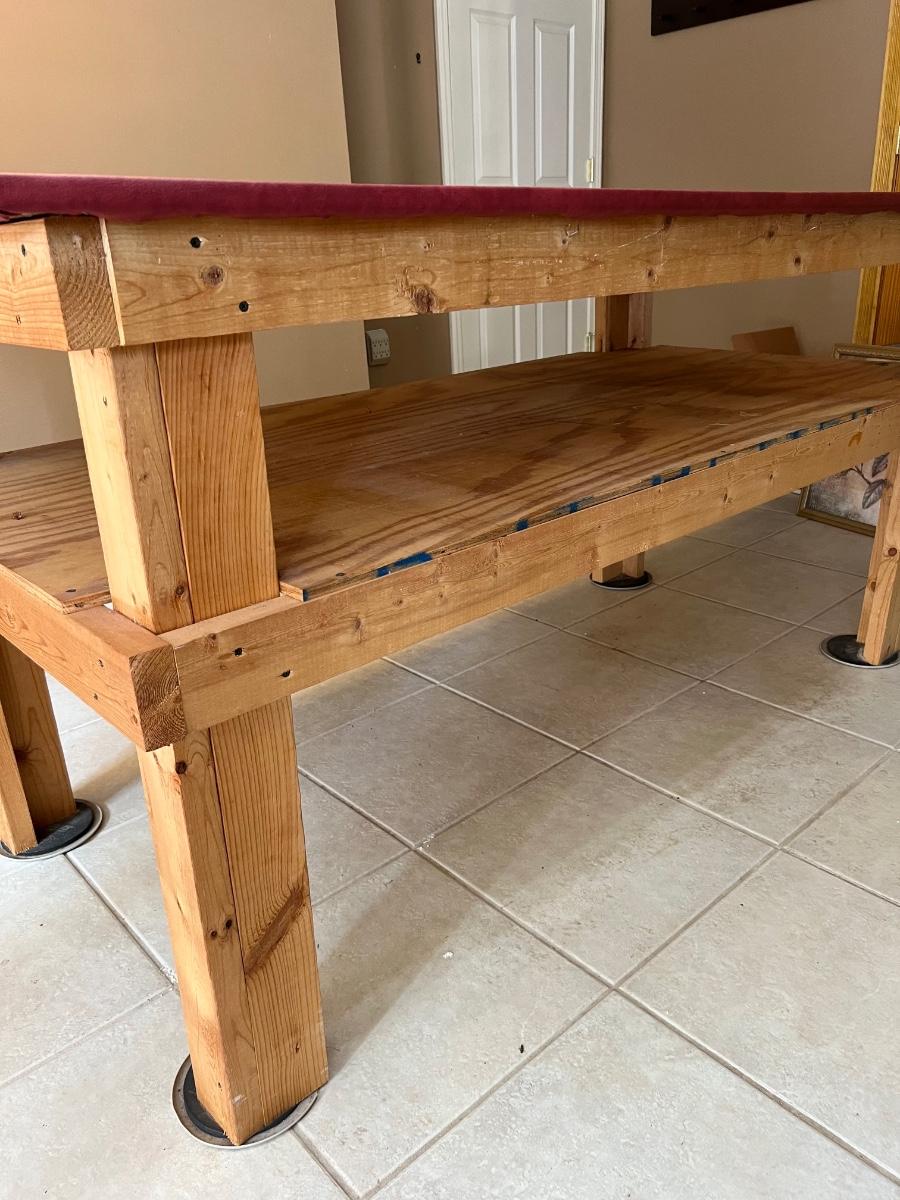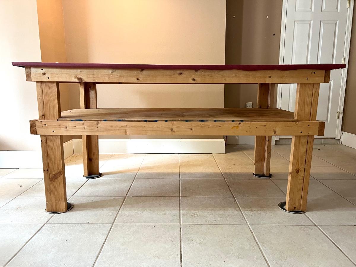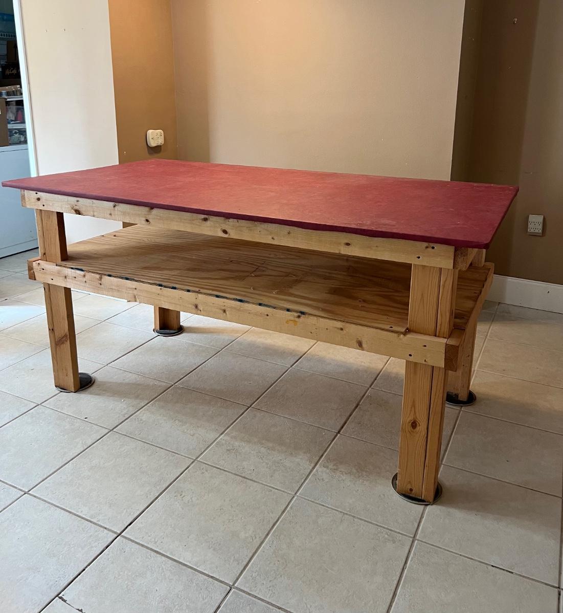 Huge Wooden work table with storage. You will need two strong people to move this. Measures 38 inches tall, 76 inches wide and 40 1/2 inches deep.