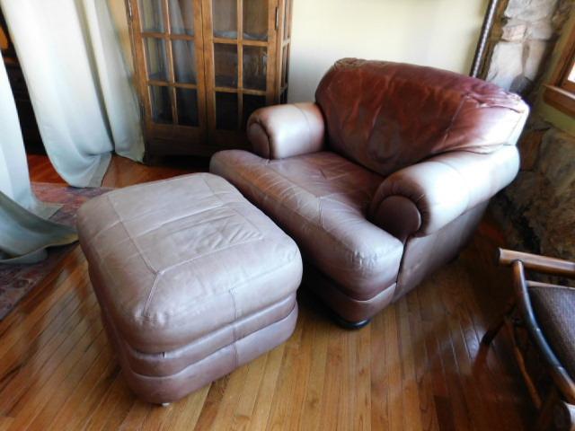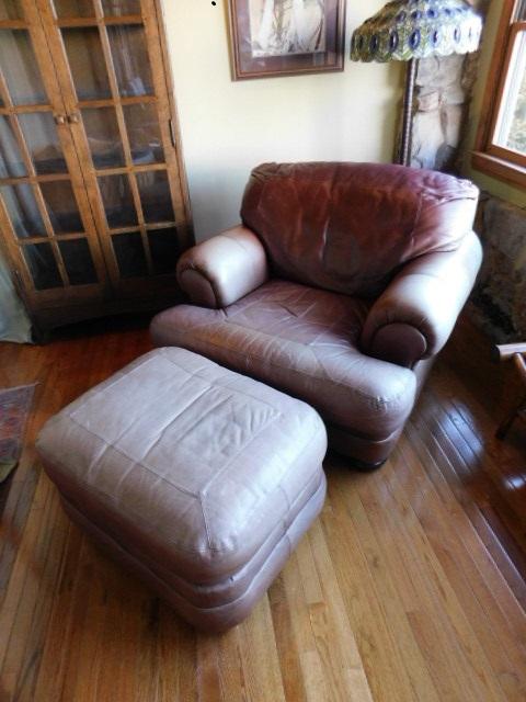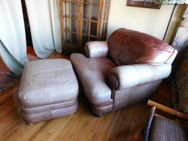 Overstuffed Leather Chair and Ottoman leather has been sun faded on both pieces but extremely comfortable with no rips or tears.