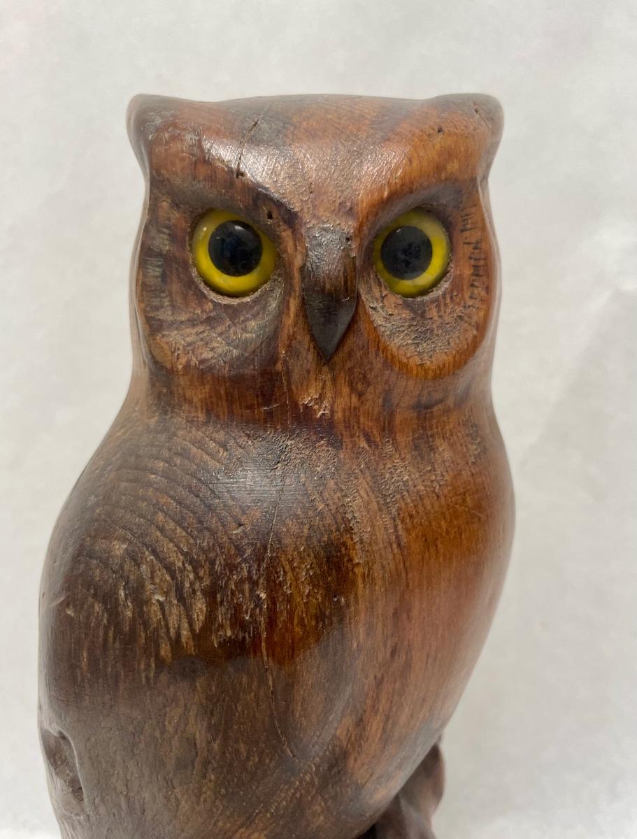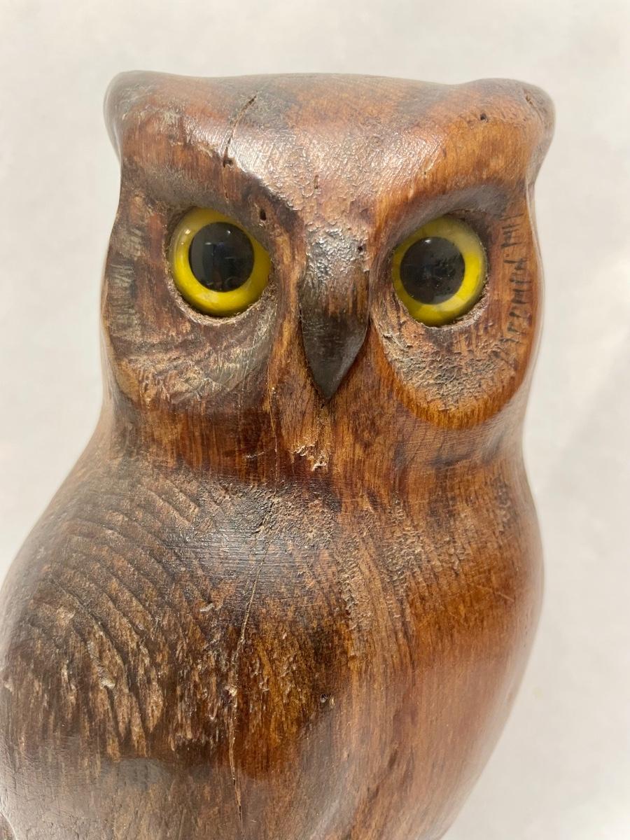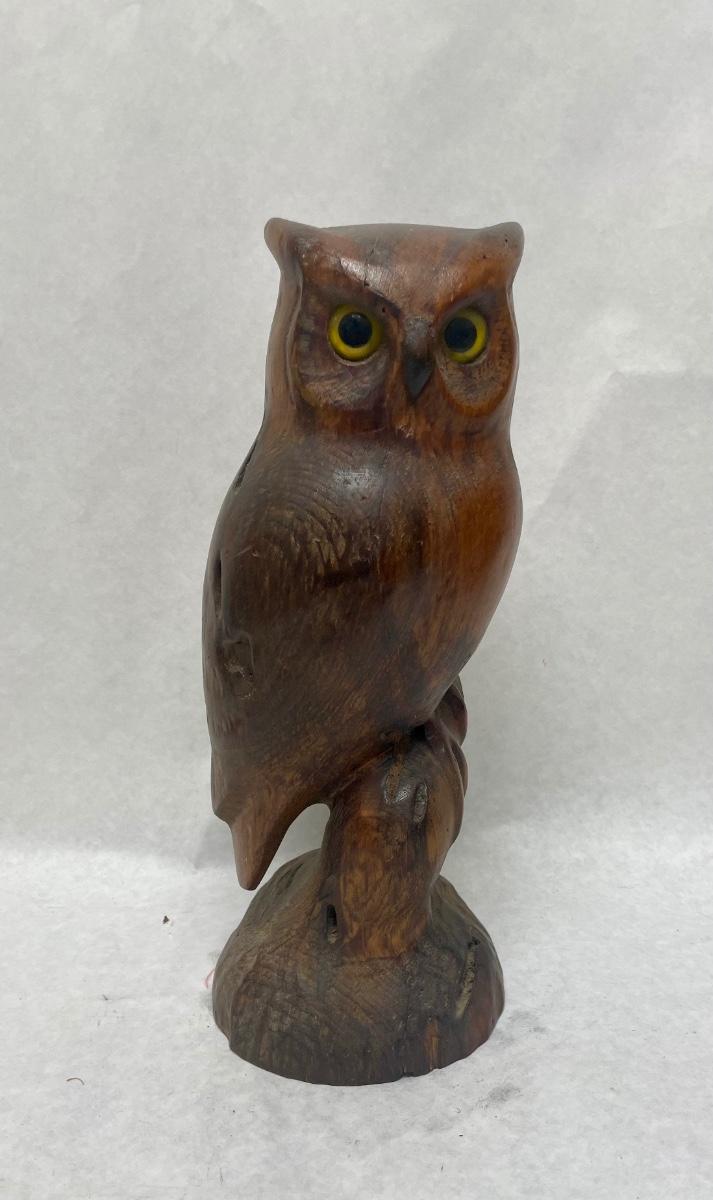 Carved wood perched owl with bright yellow and black eyes. Approx. 12" tall, good condition.