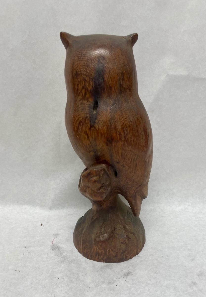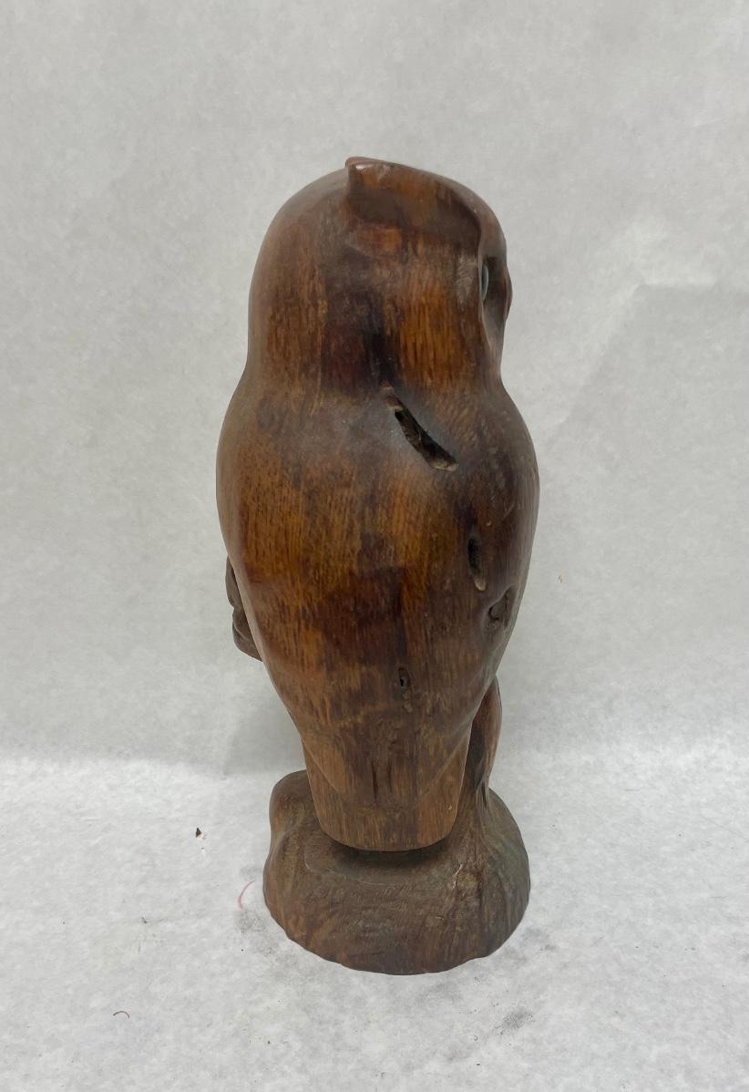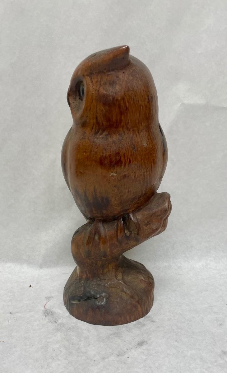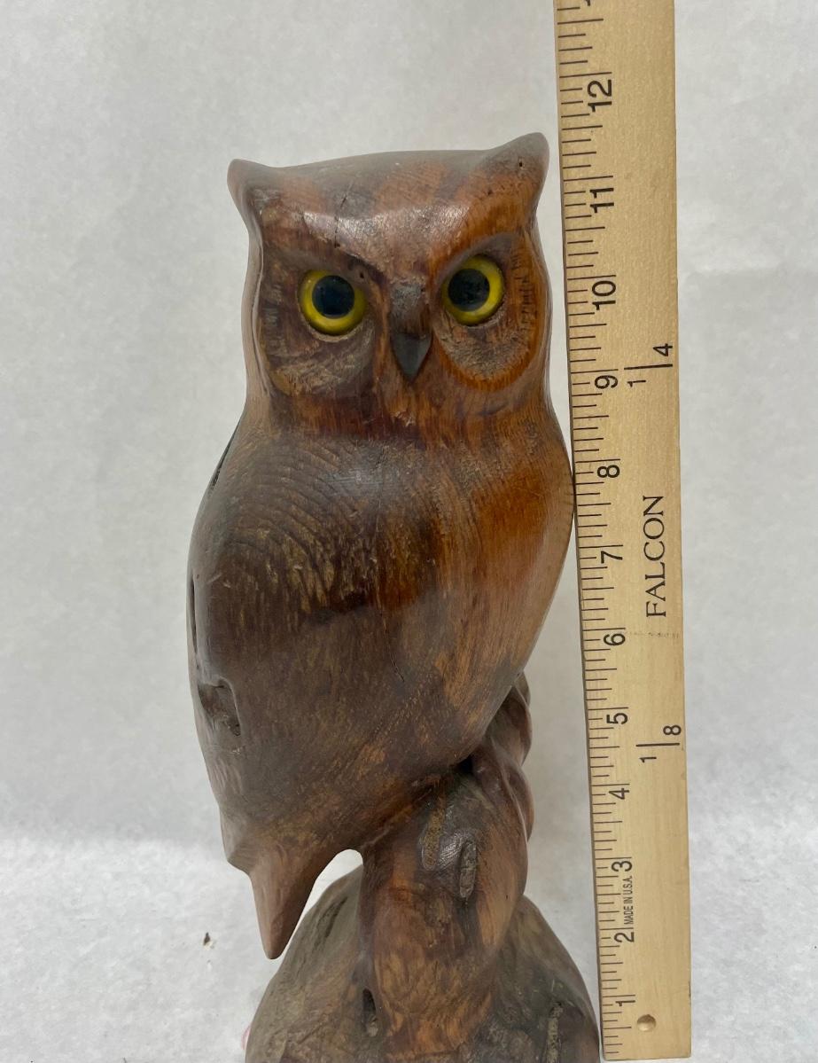 Carved wood perched owl with bright yellow and black eyes. Approx. 12" tall, good condition.