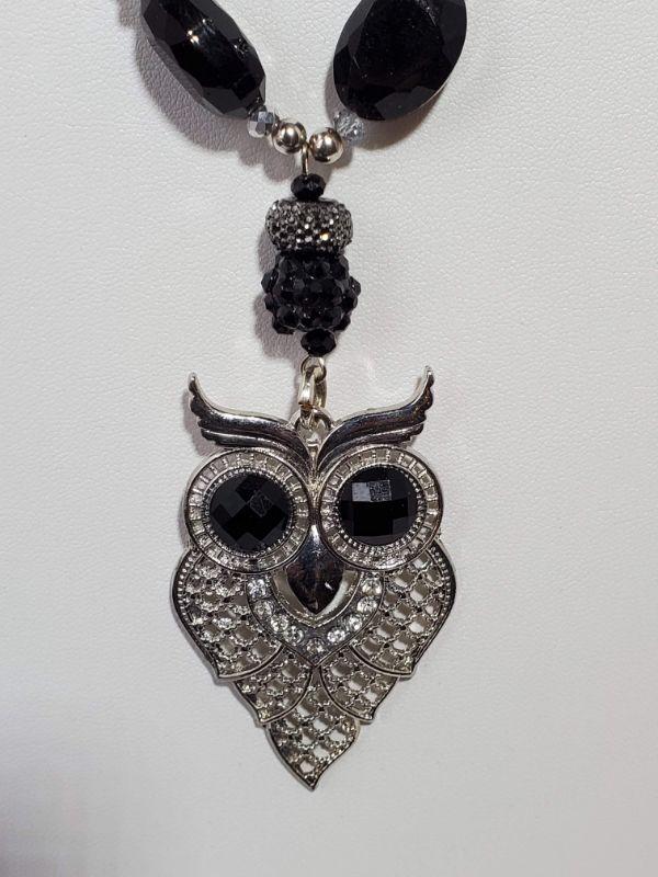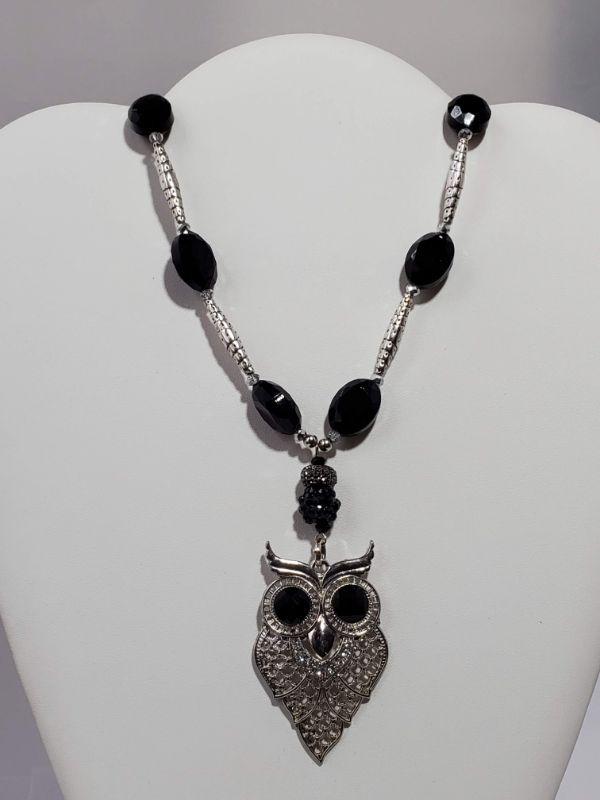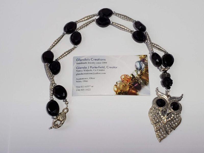 Handmade (Glenda's Creations) Owl Necklace w/ Black Glass Beads