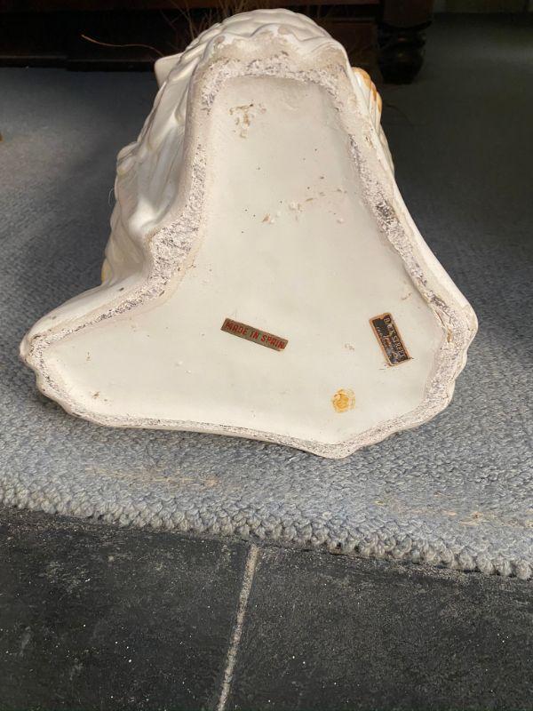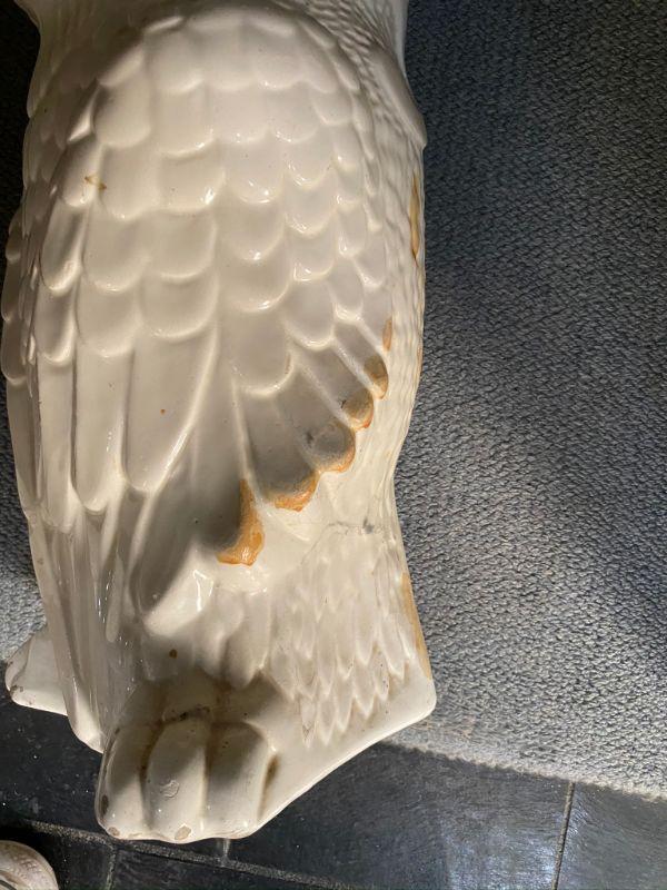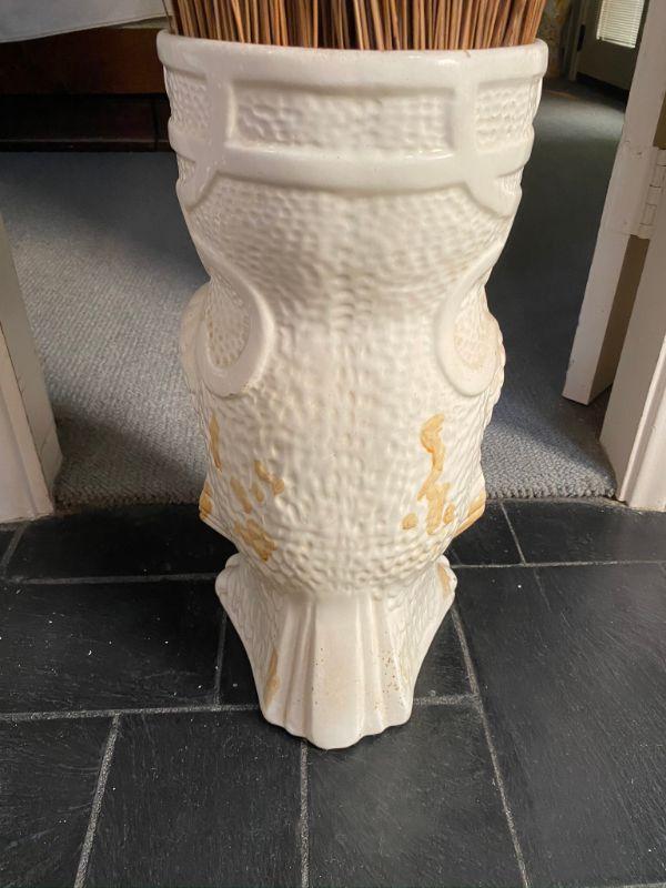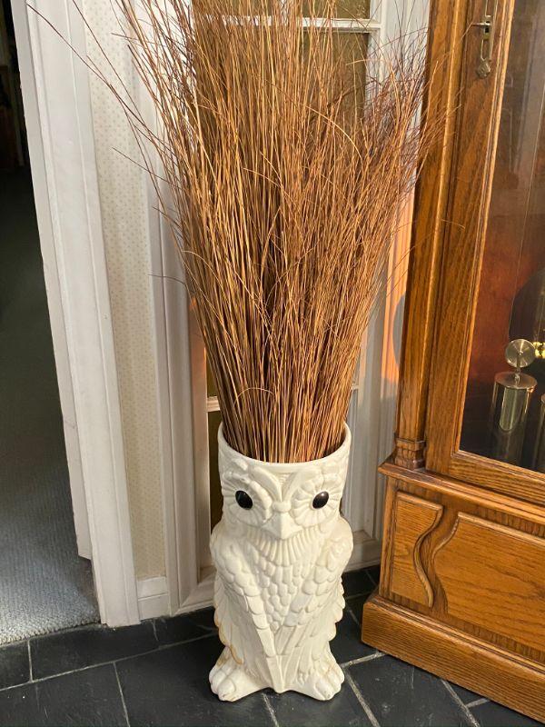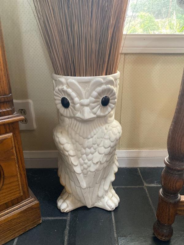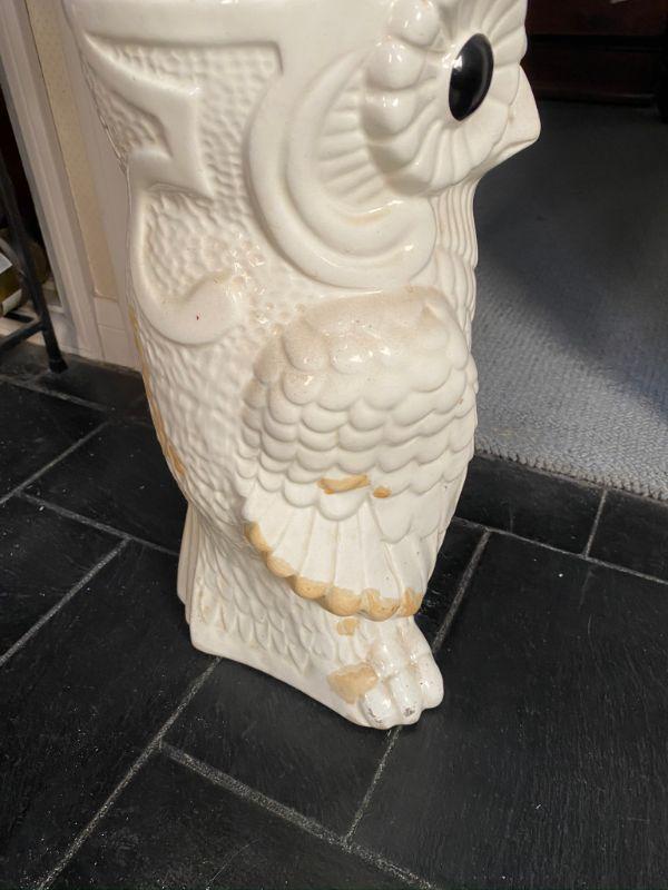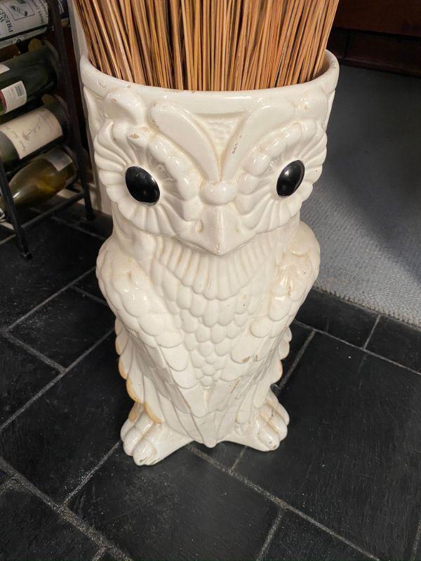 Vintage Owl umbrella stand planter vase. White with black eyes. Stands 19” tall and is about 10” wide. There is some discoloration along the edge of wings and on the back. Did not notice any other damage. Made in Spain. Comes with the reeds currently in it.