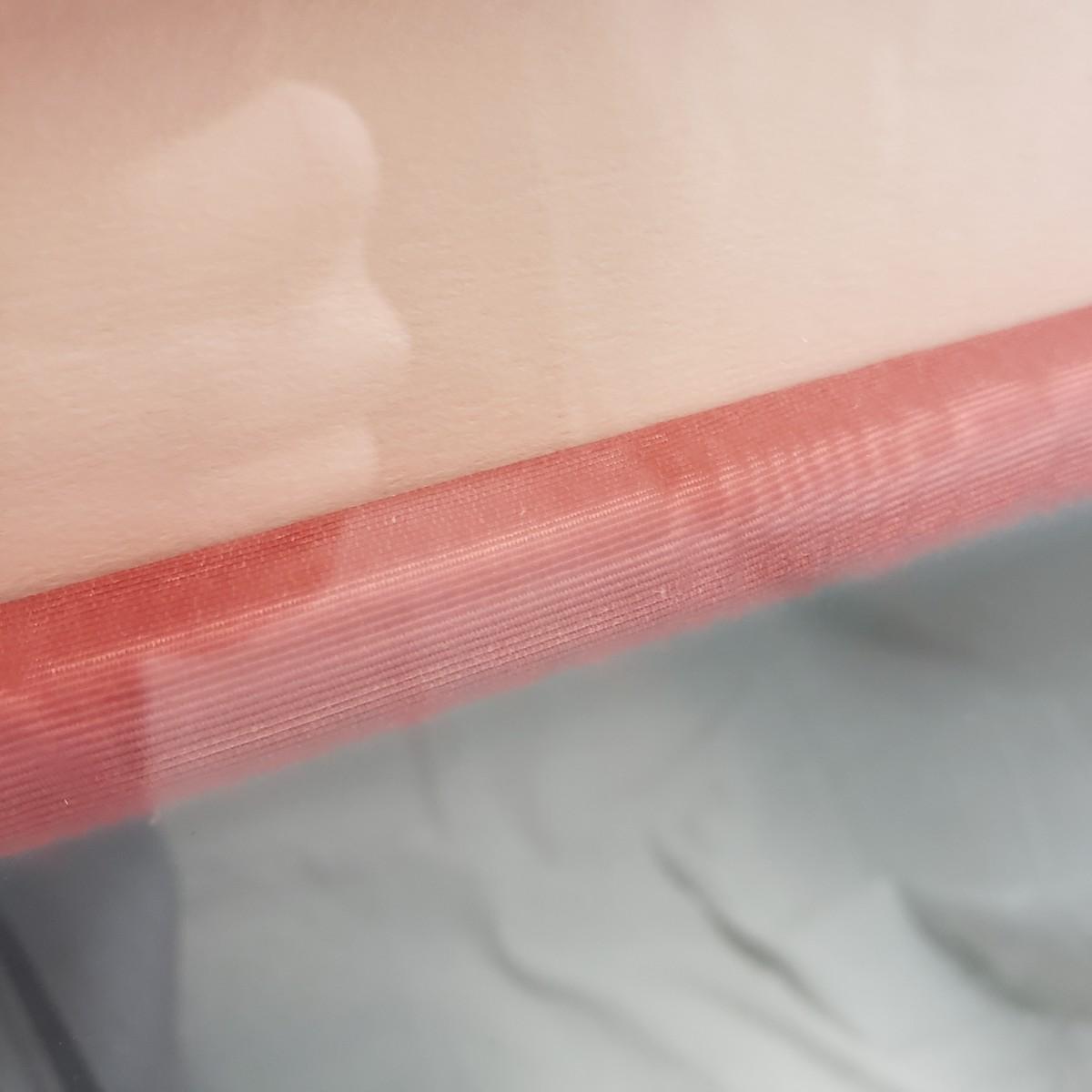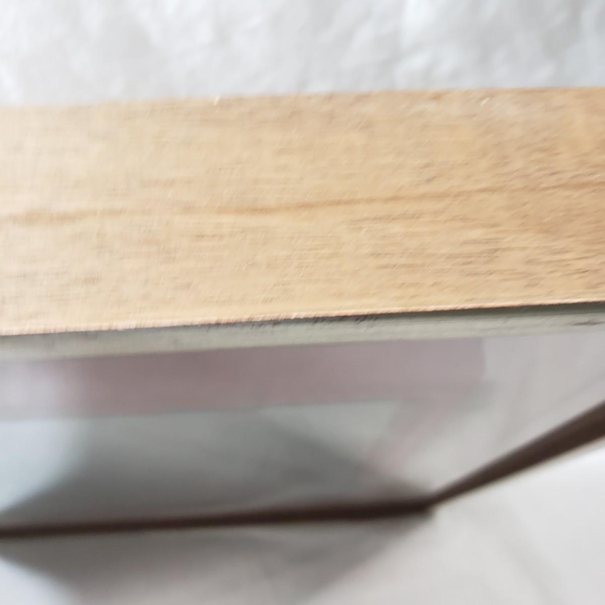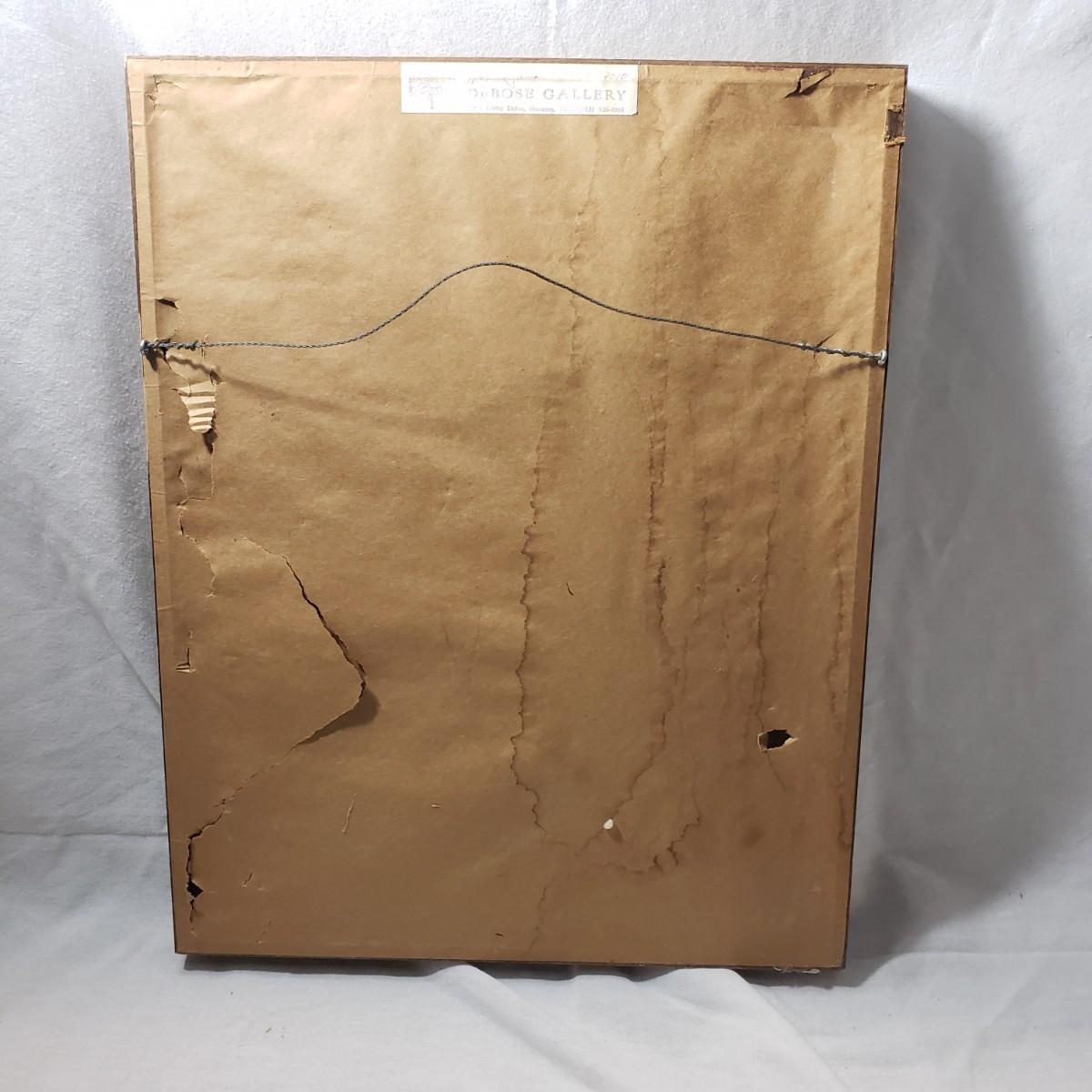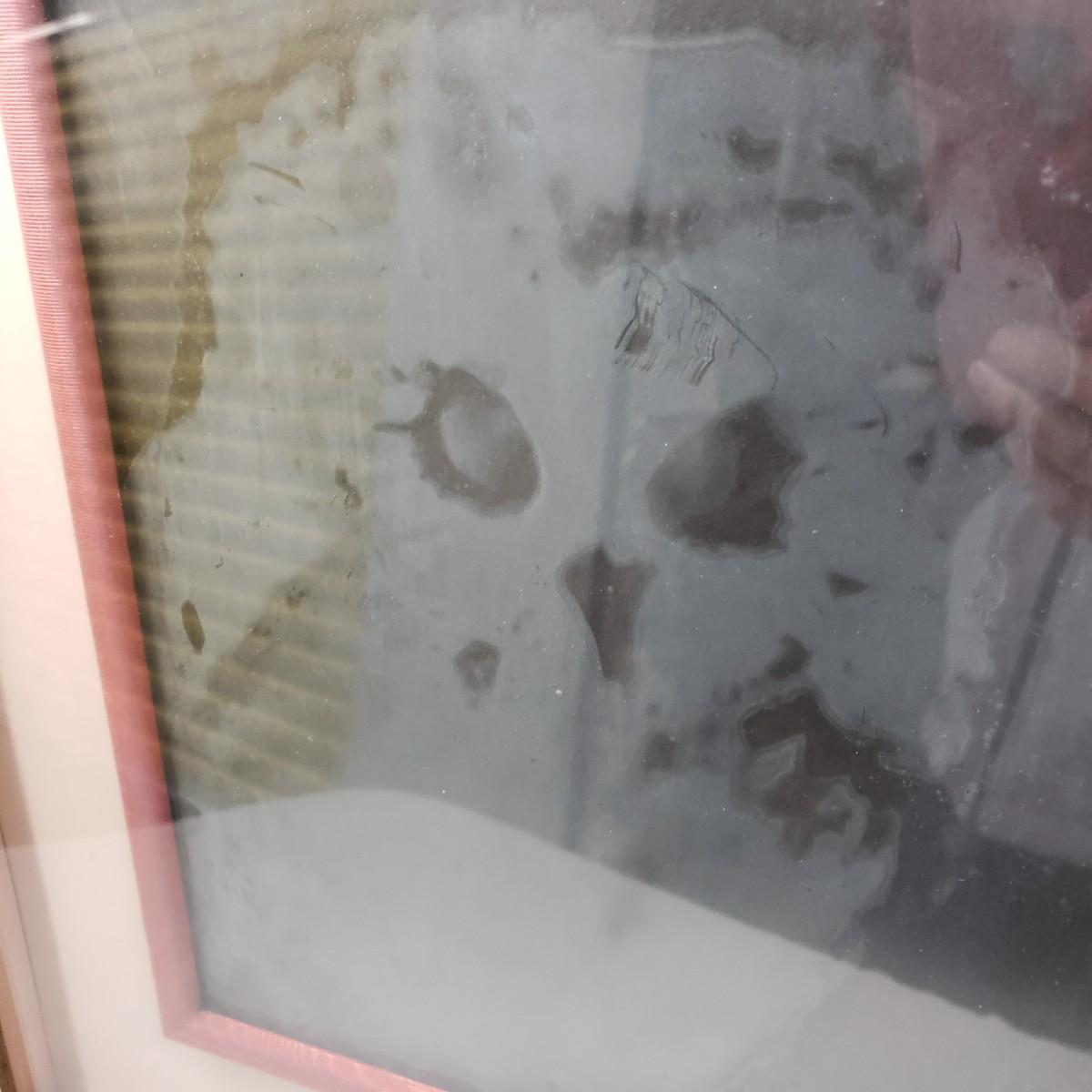 This is a 16" x 20" wooden frame with silver painted front is in glass. The owl appears to be a negative photograph in a pink ribbon frame set in a matted base. The picture is ready to hang.