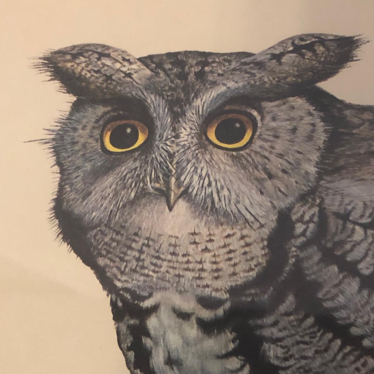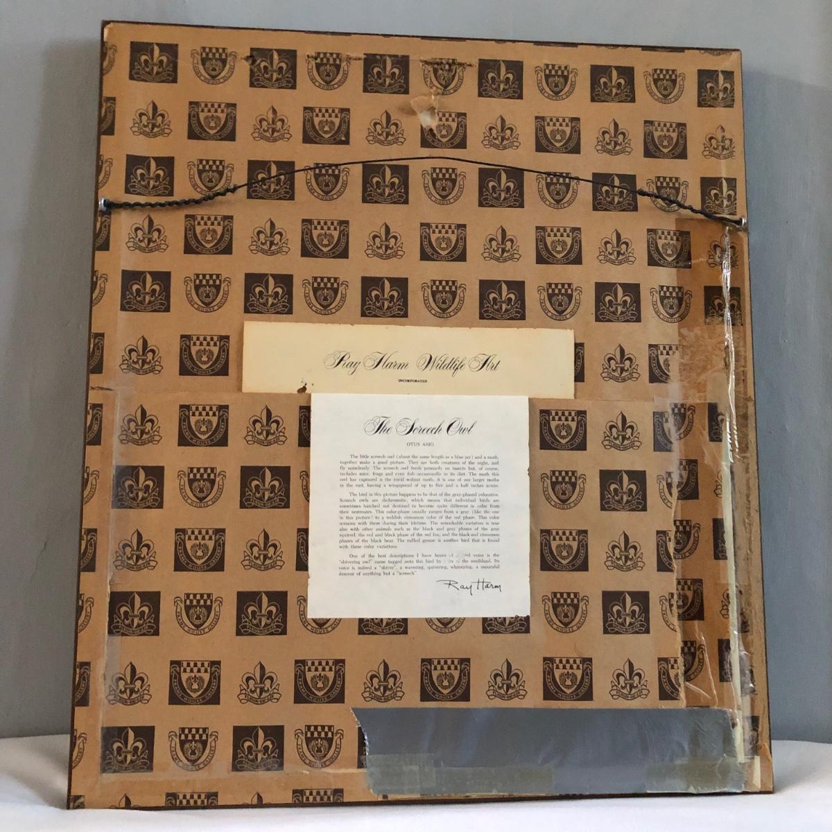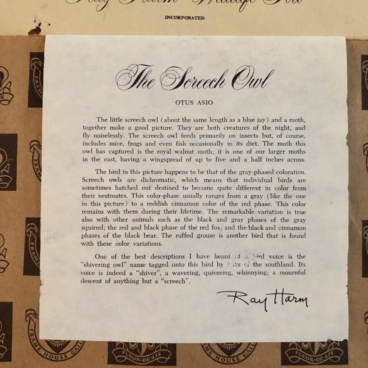 In its talons a grey screech owl grasps a royal walnut moth in this print of a painting by Ray Harm. Information about the artwork is attached to the back as pictured. The frame measures 17” x 19.5” x 1” and the print has blue mats. The wooden frame does have some small surface dings. Shipping available. Shipping art can be costly. Please contact the local UPS store to get a shipping quote.
