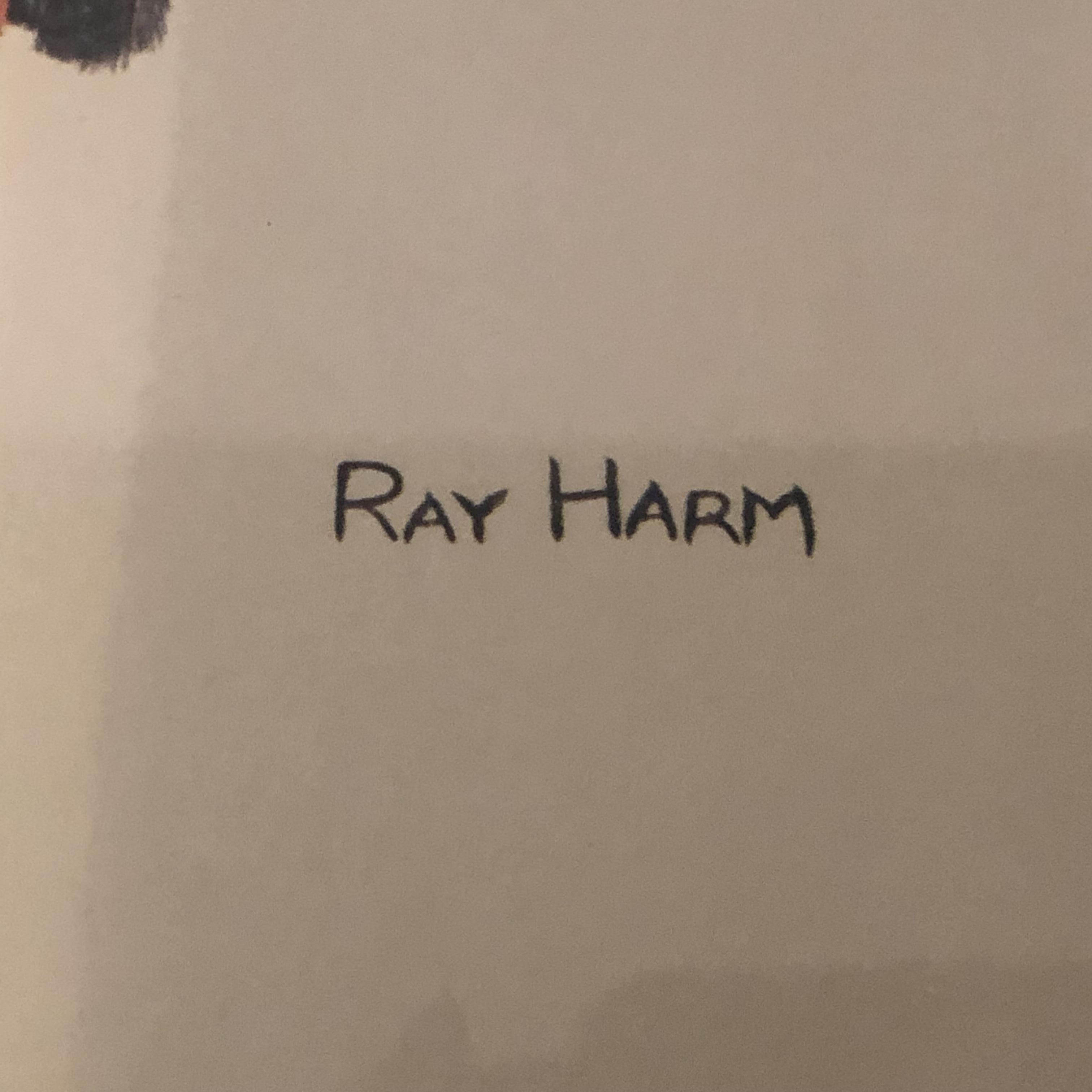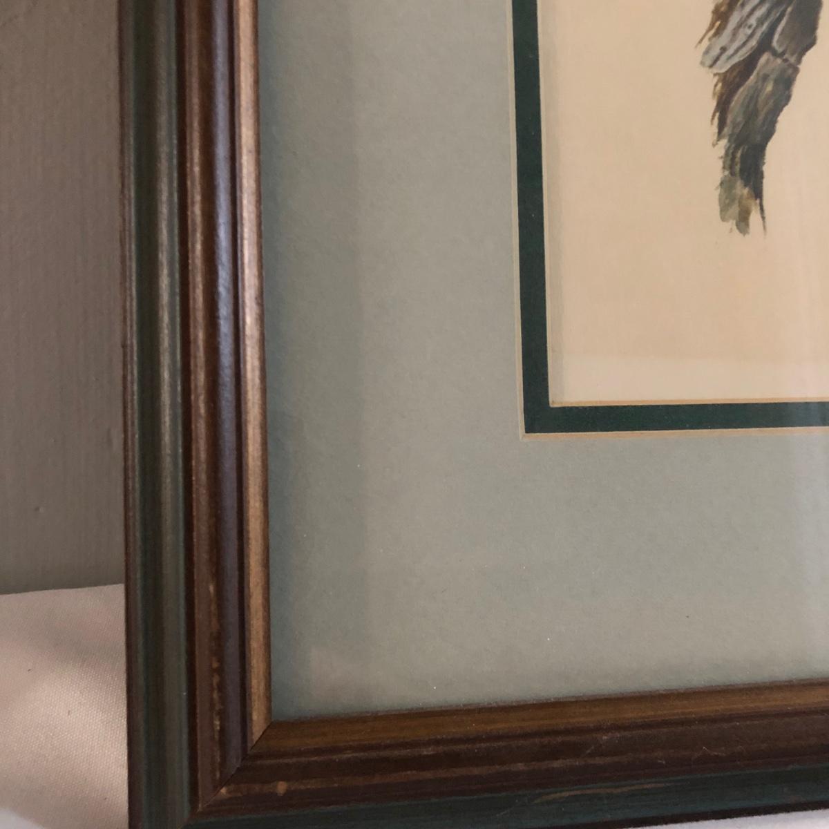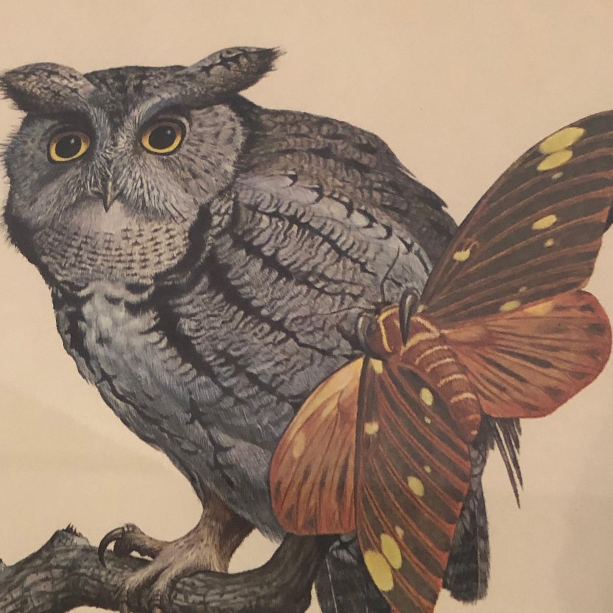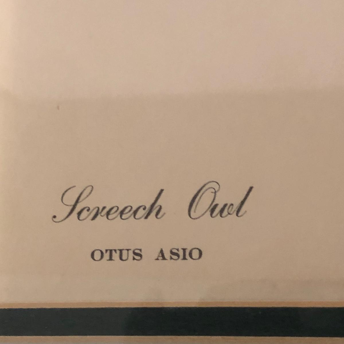In its talons a grey screech owl grasps a royal walnut moth in this print of a painting by Ray Harm. Information about the artwork is attached to the back as pictured. The frame measures 17” x 19.5” x 1” and the print has blue mats. The wooden frame does have some small surface dings. Shipping available. Shipping art can be costly. Please contact the local UPS store to get a shipping quote.