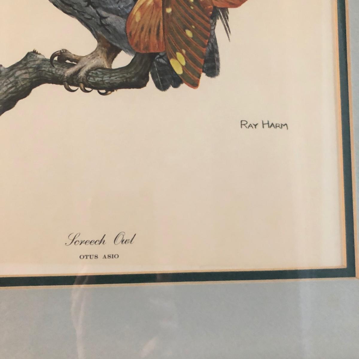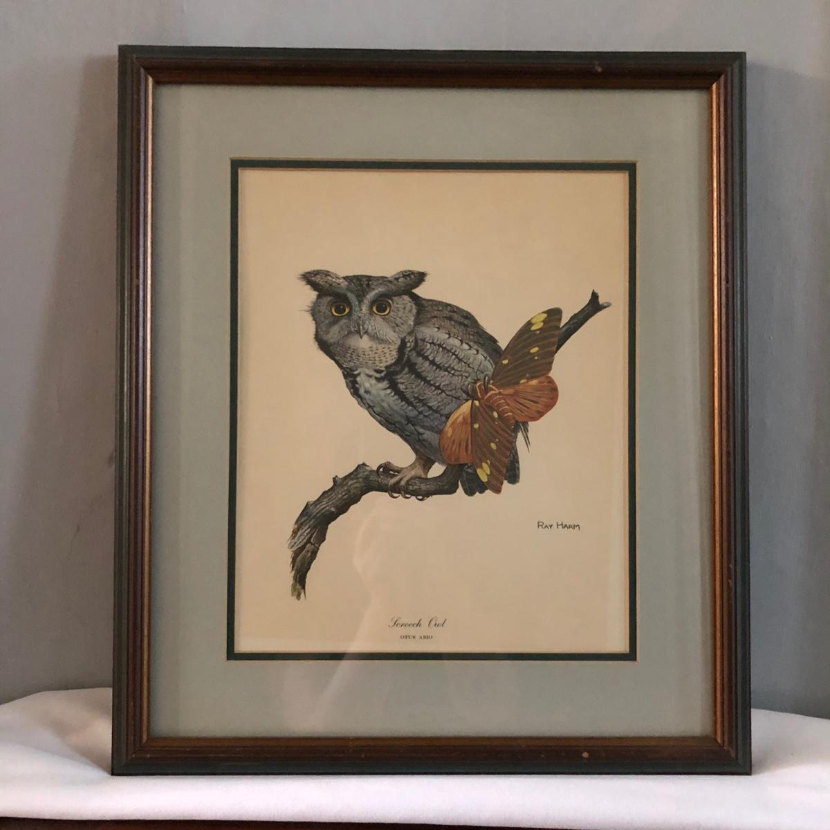 Signed Ray Harm Print of “The Screech Owl” Grasping Moth, in Wooden Frame (DR-JF)