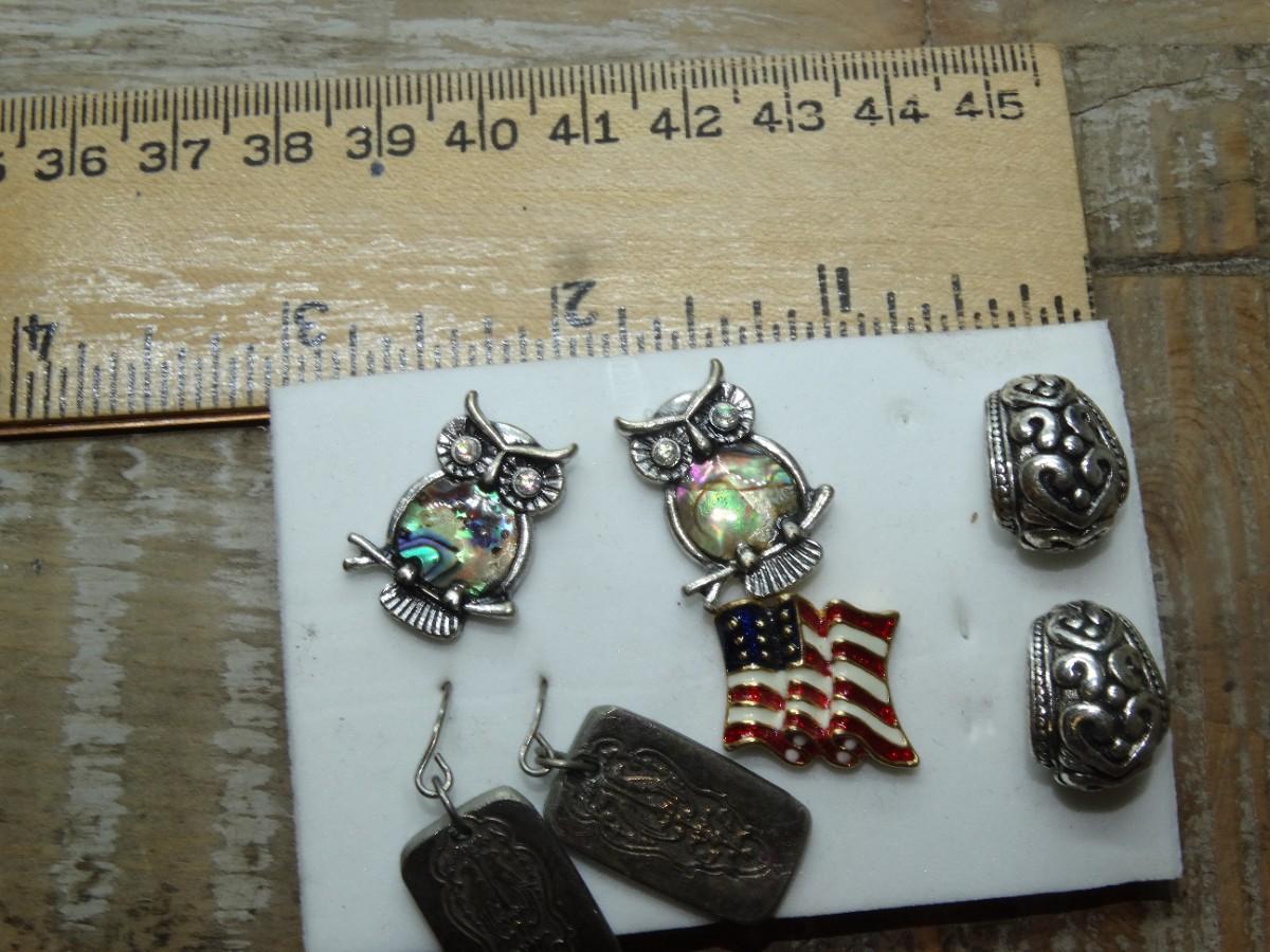 Owls, USA Flag Silver & Copper Tone Earrings & Pin