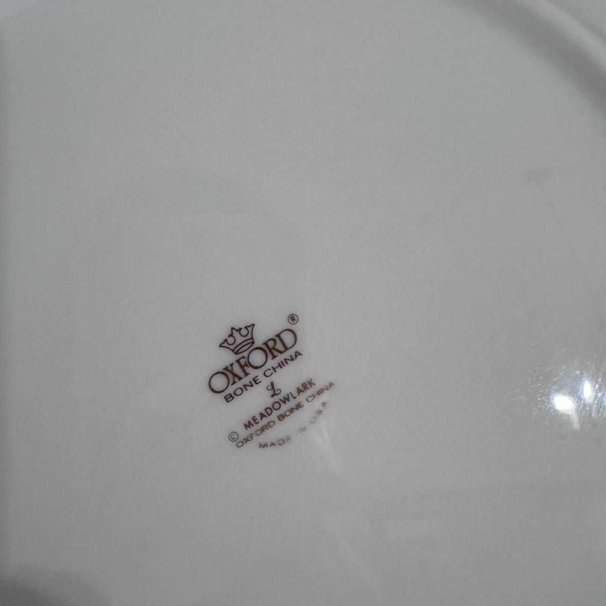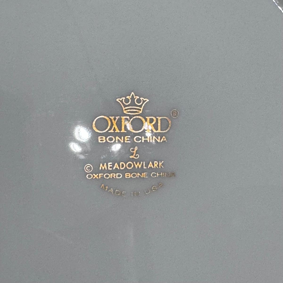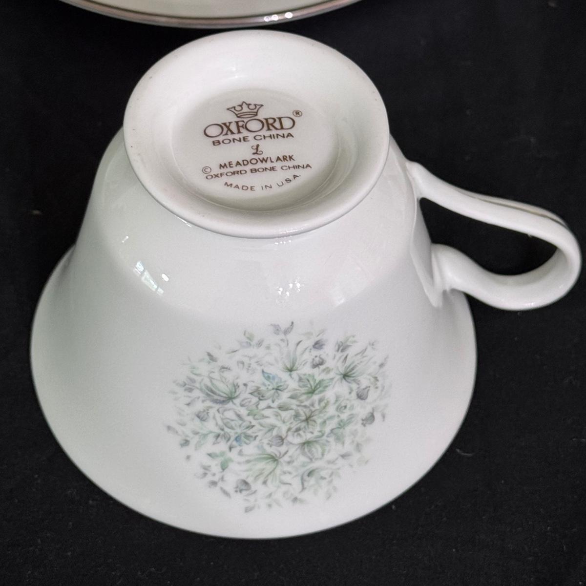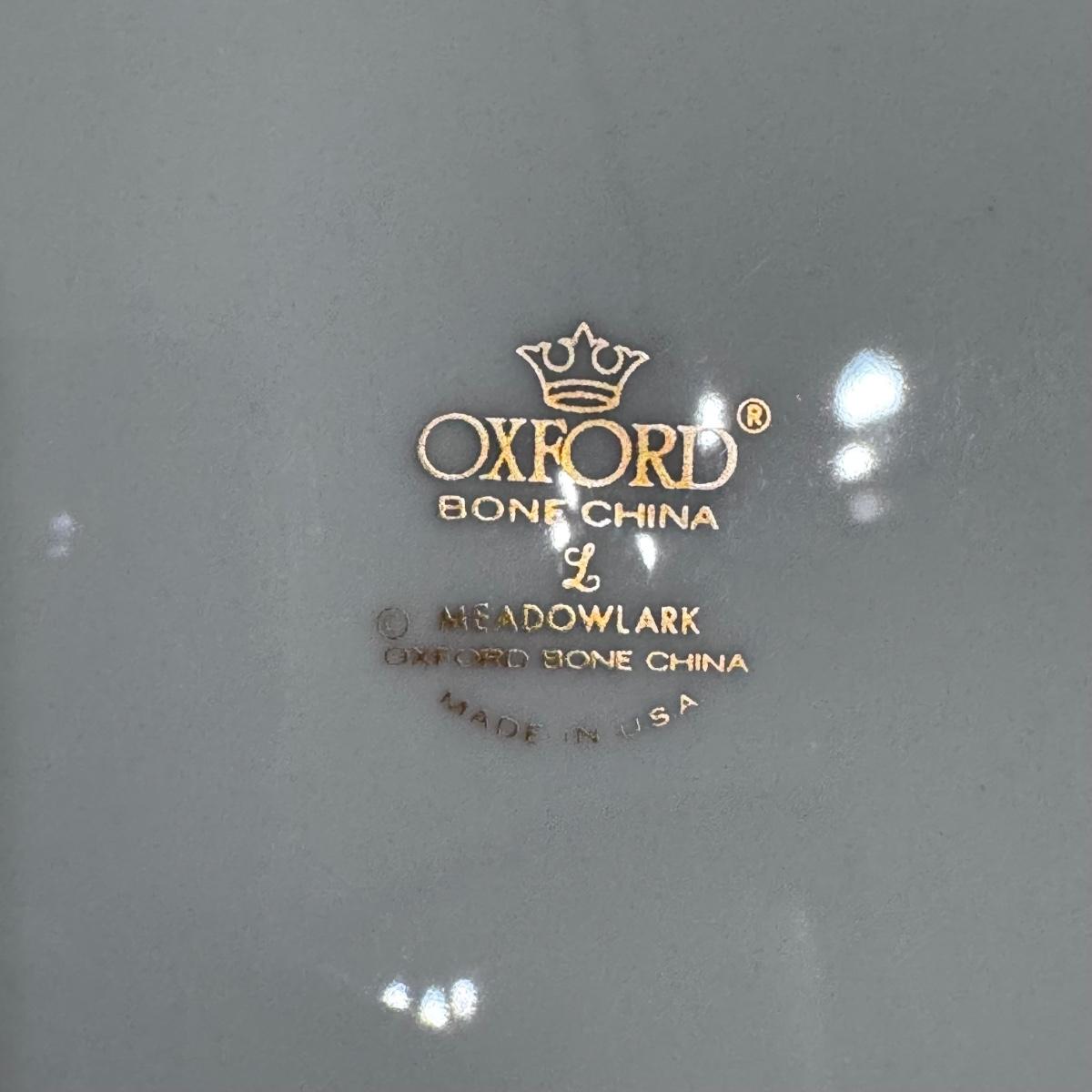 This lot of Oxford bone China in the Meadowlark pattern includes eight dinner plates, eight salad plates, eight appetizer plates, eight saucers, and eight teacups. See pictures for details. The largest plates individually measure 10.5”D. All pieces come in a zip-up storage bag. Shipping available.