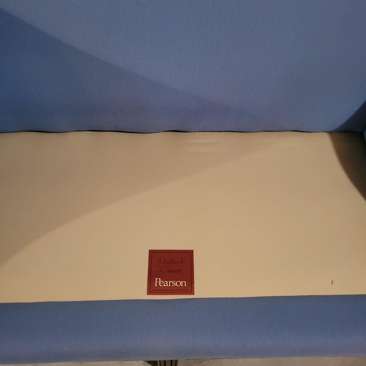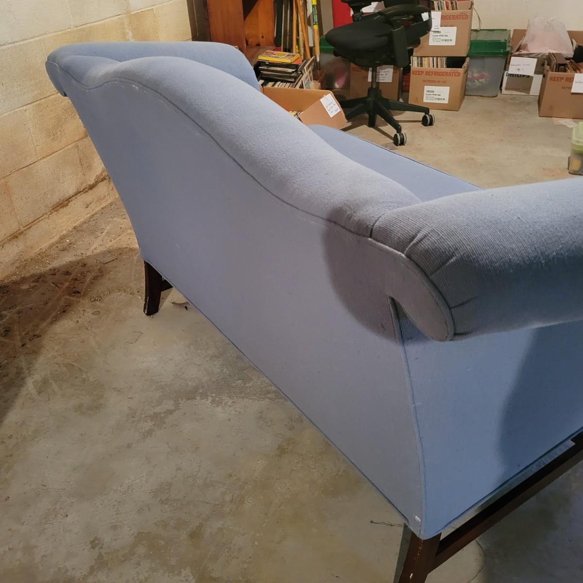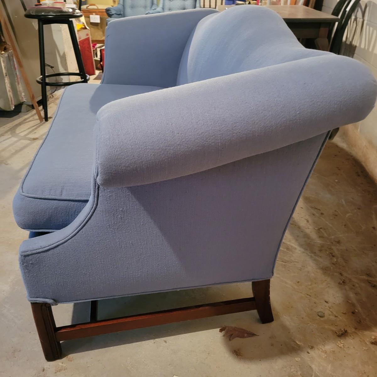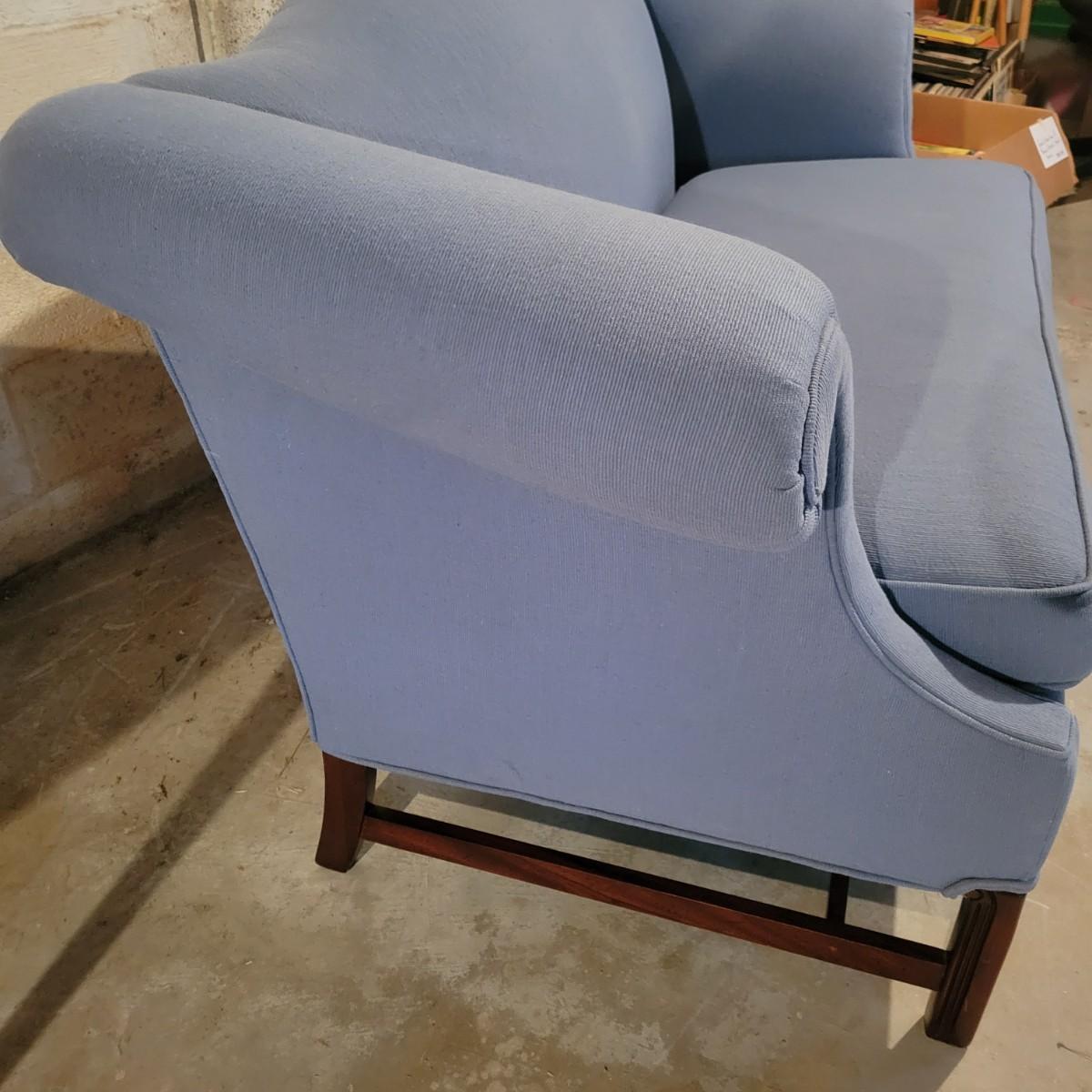 A blue upholstered sofa in good condition with some minor blemishes. This sofa has one large cushion and wooden frame and legs. It was manufactured by Oxford Court and measures approximately 62" x 32" x 34" with a seat height of 21". Winning bidder will need to bring assistance to move and load. Local pickup only