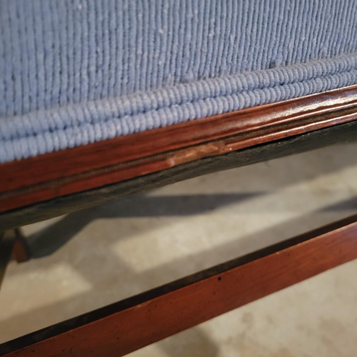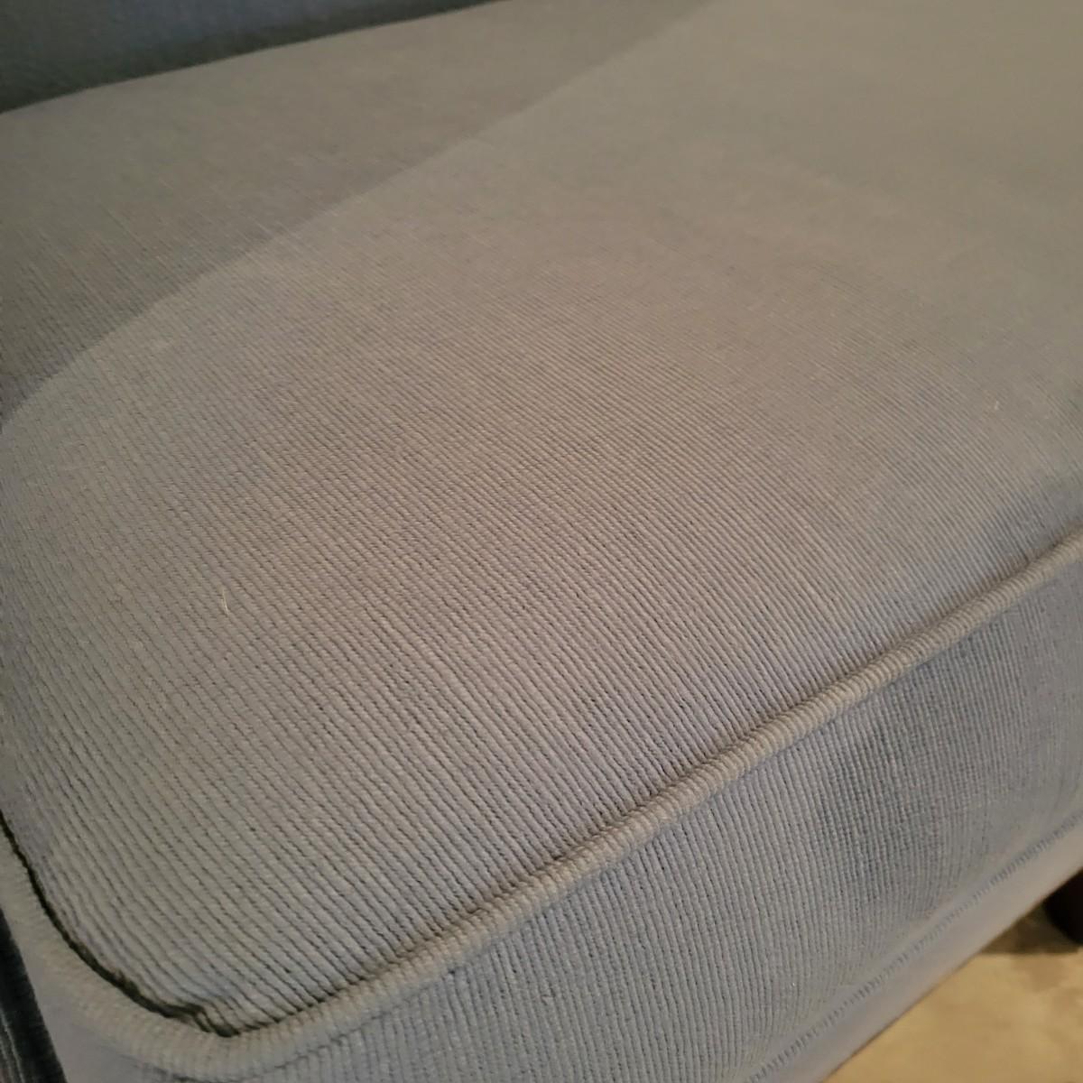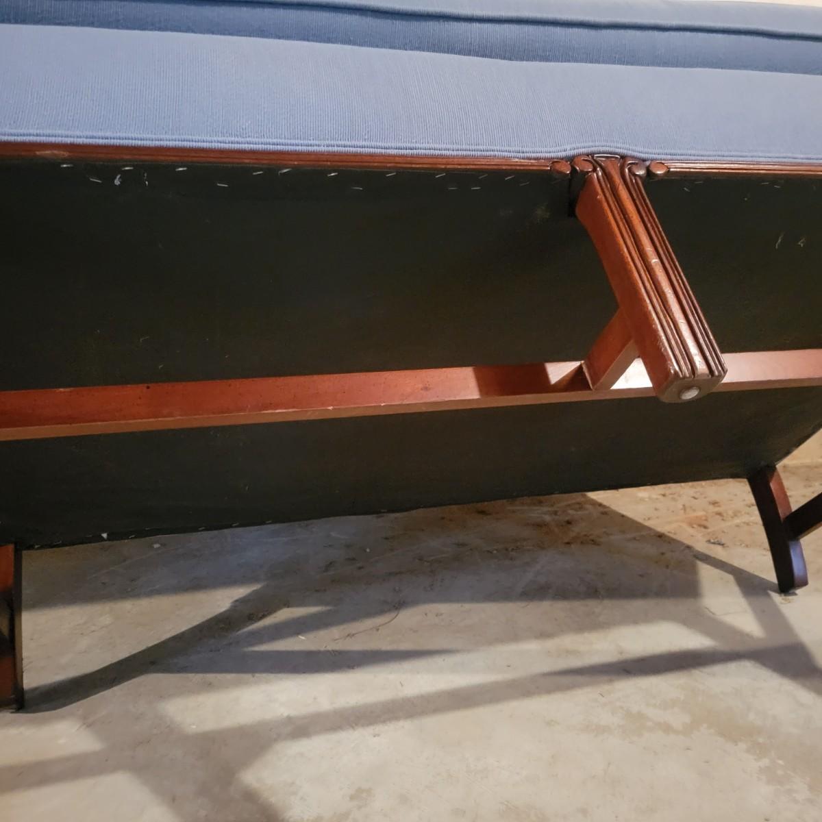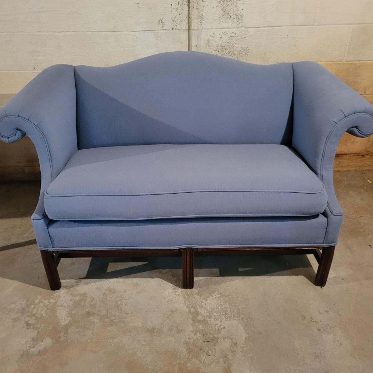 A blue upholstered sofa in good condition with some minor blemishes. This sofa has one large cushion and wooden frame and legs. It was manufactured by Oxford Court and measures approximately 62" x 32" x 34" with a seat height of 21". Winning bidder will need to bring assistance to move and load. Local pickup only
