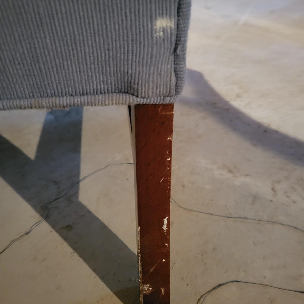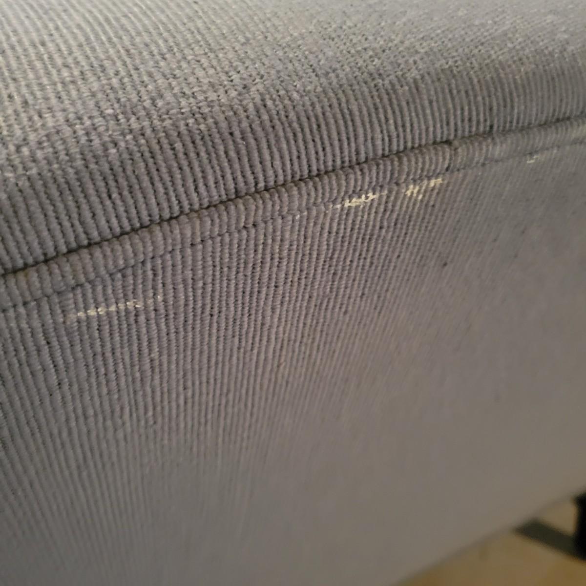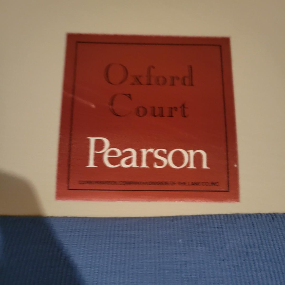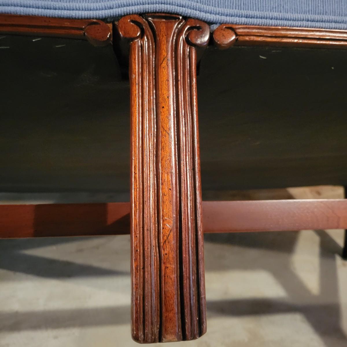 A blue upholstered sofa in good condition with some minor blemishes. This sofa has one large cushion and wooden frame and legs. It was manufactured by Oxford Court and measures approximately 62" x 32" x 34" with a seat height of 21". Winning bidder will need to bring assistance to move and load. Local pickup only