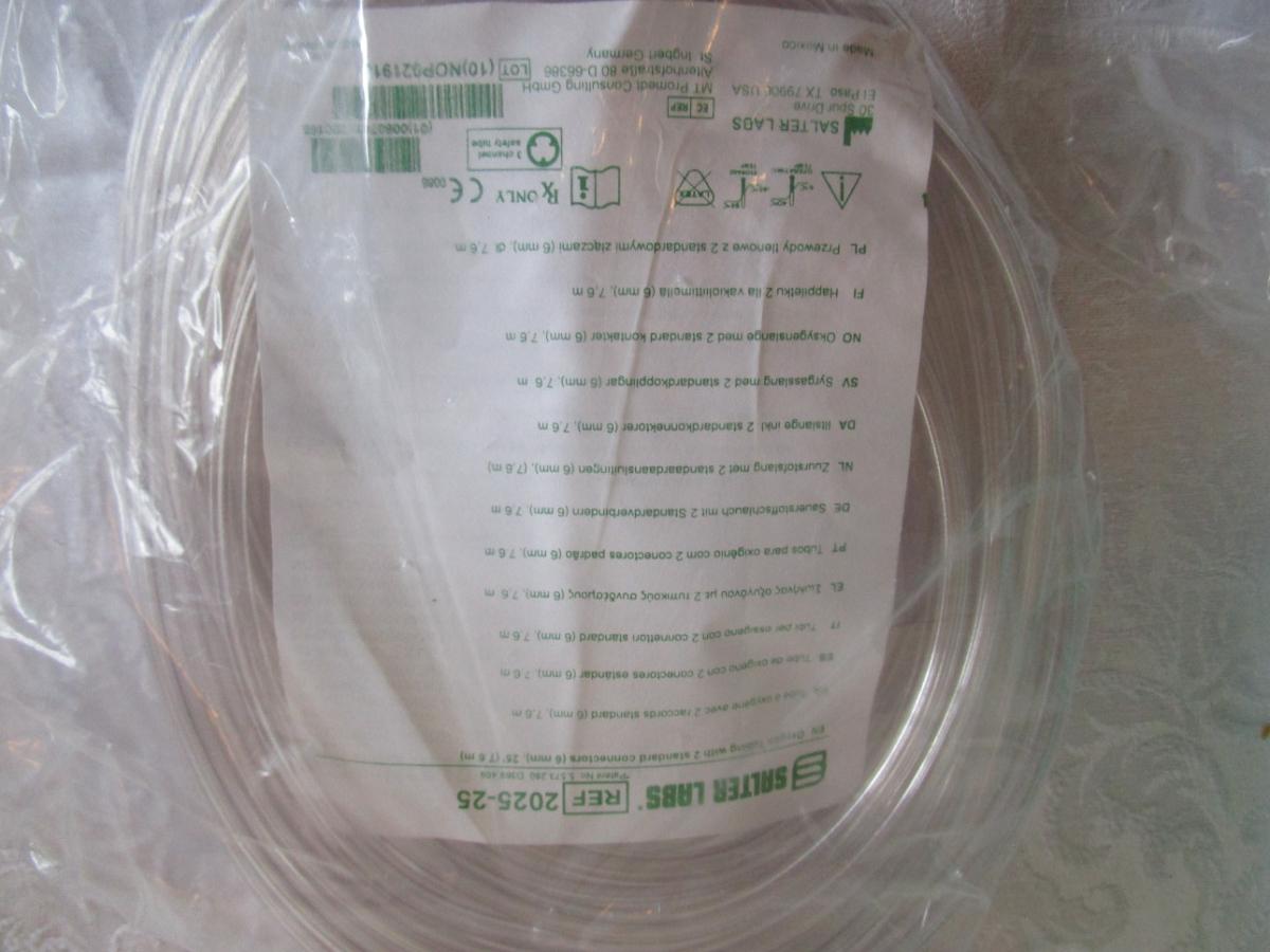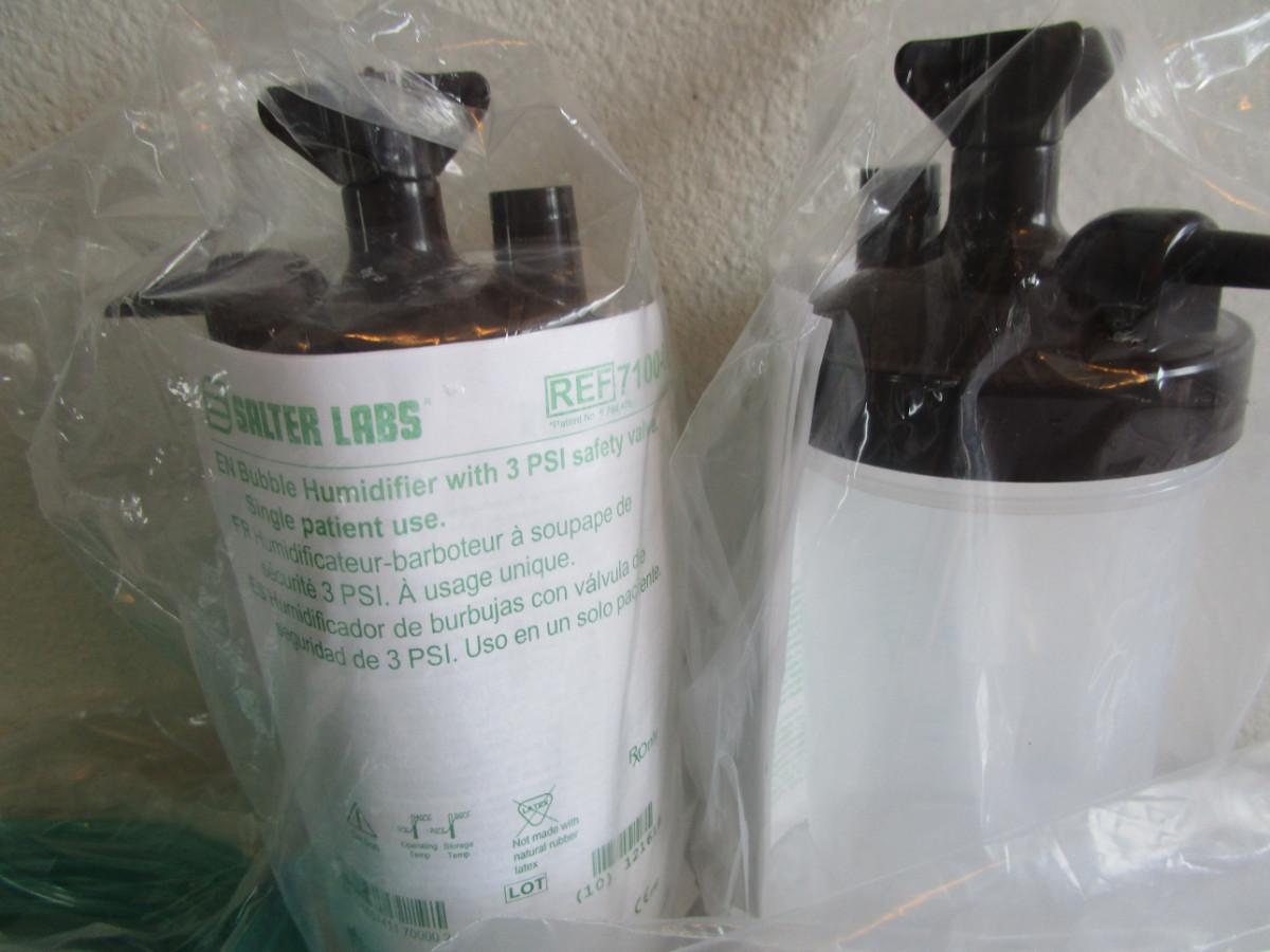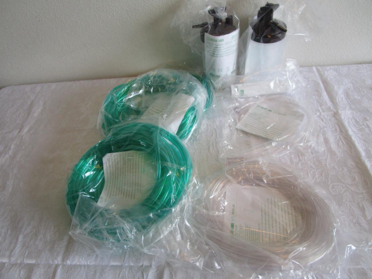 1-oxygen tubing 25' (clear), 2-oxygen t (green), 1- oxygen tubing with 1 standard connector (6mm) and 1 male thread grip connector, 15" (0.4mm), water trap, 2-bubble humidifier with 3 psi safety valve