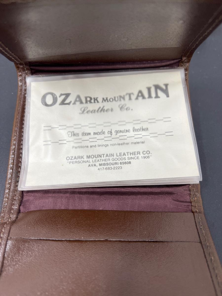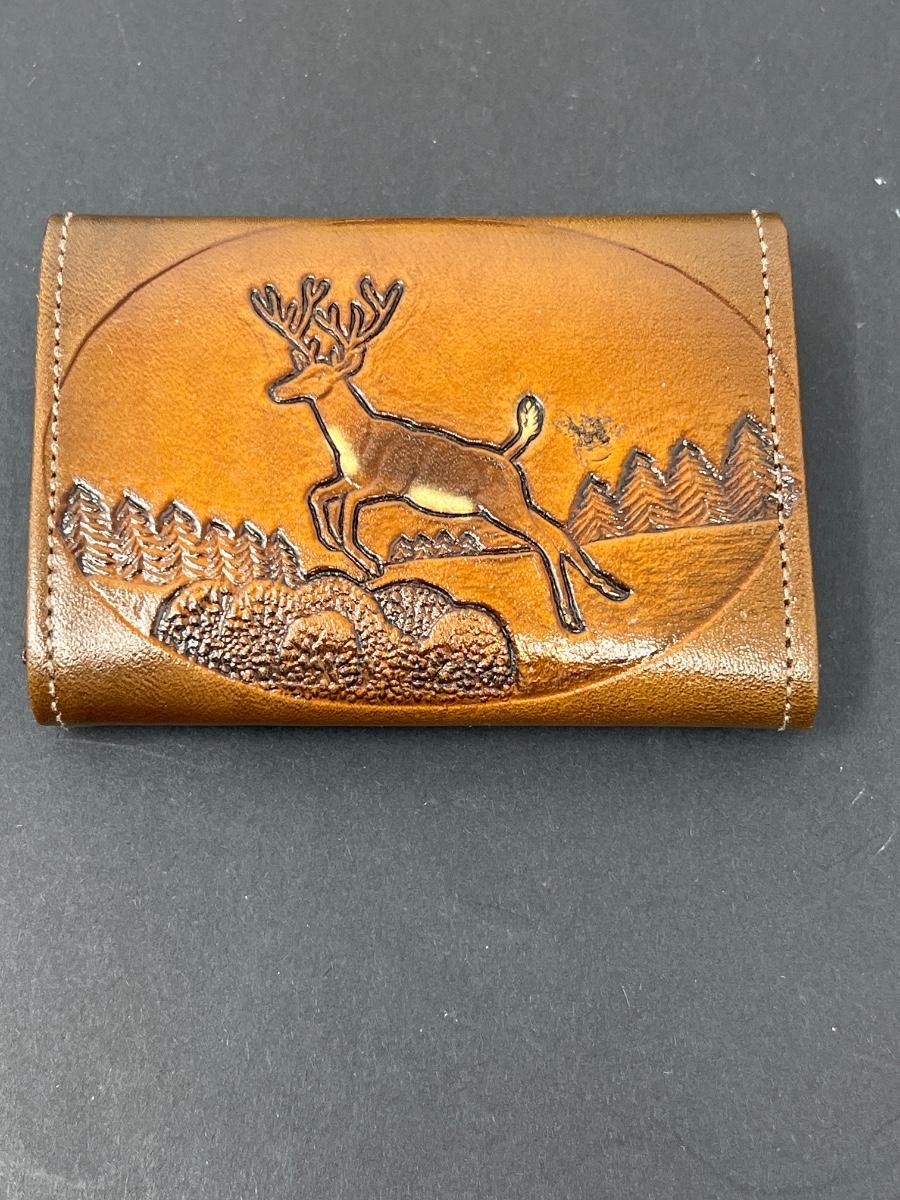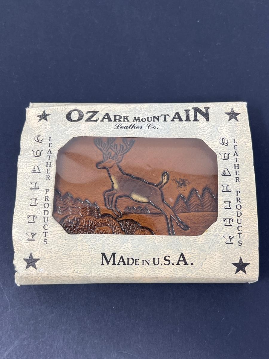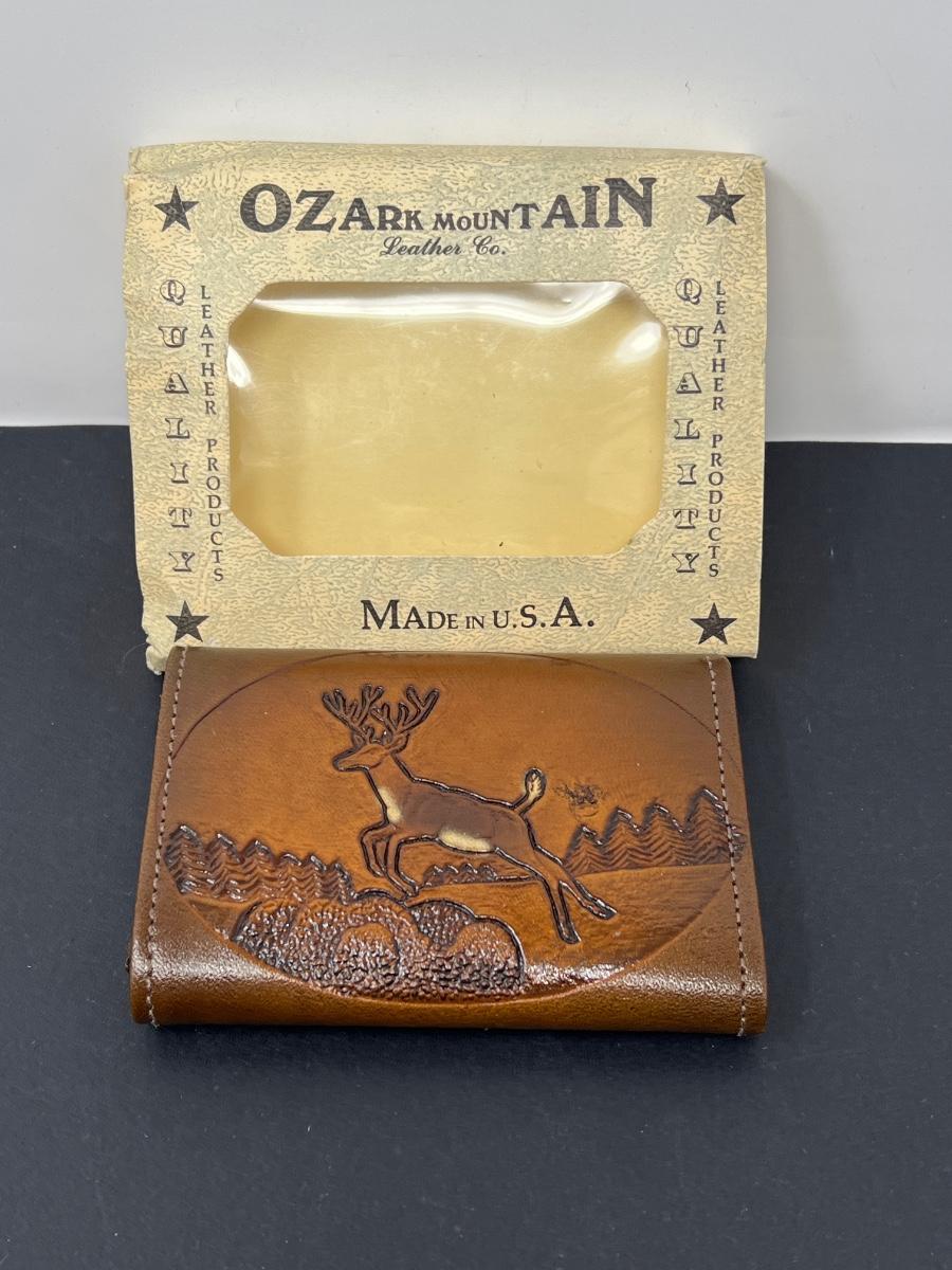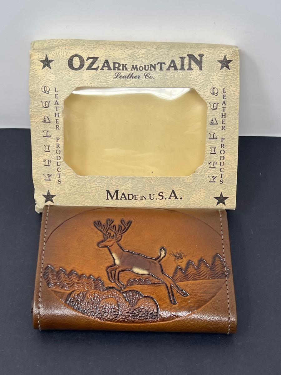 Wallet has never been used. Tooled design of deer and mountains on front. Made in USA by Ozark Mountain Leather Co. Various shades of brown.
