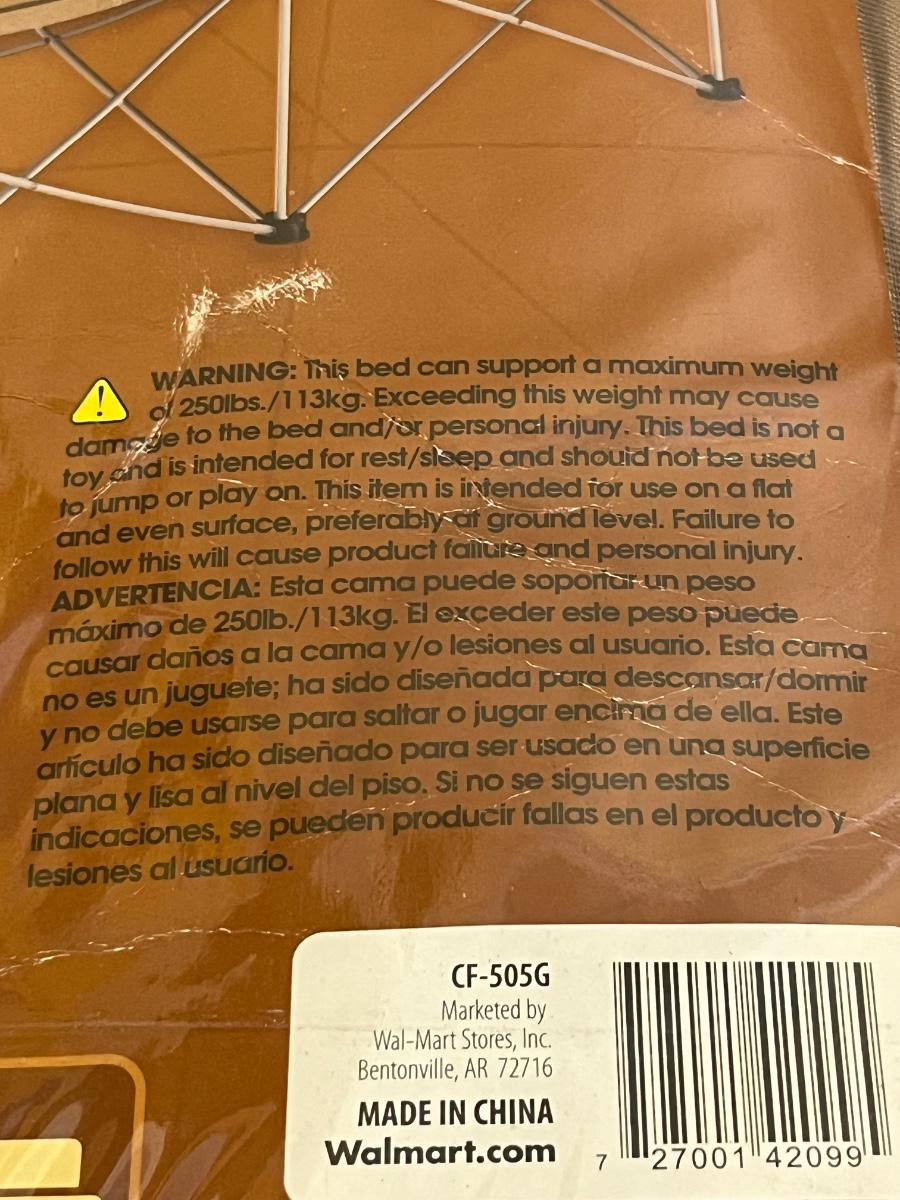 Bed can support a max weight of 250lbs. ~ One bed never used the other only used once