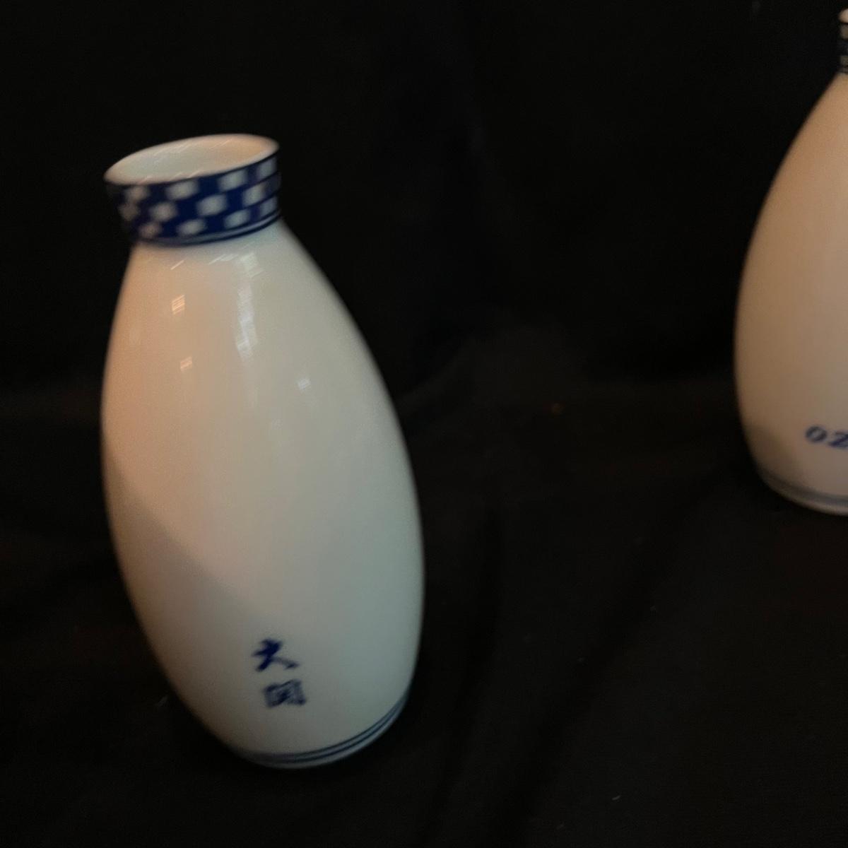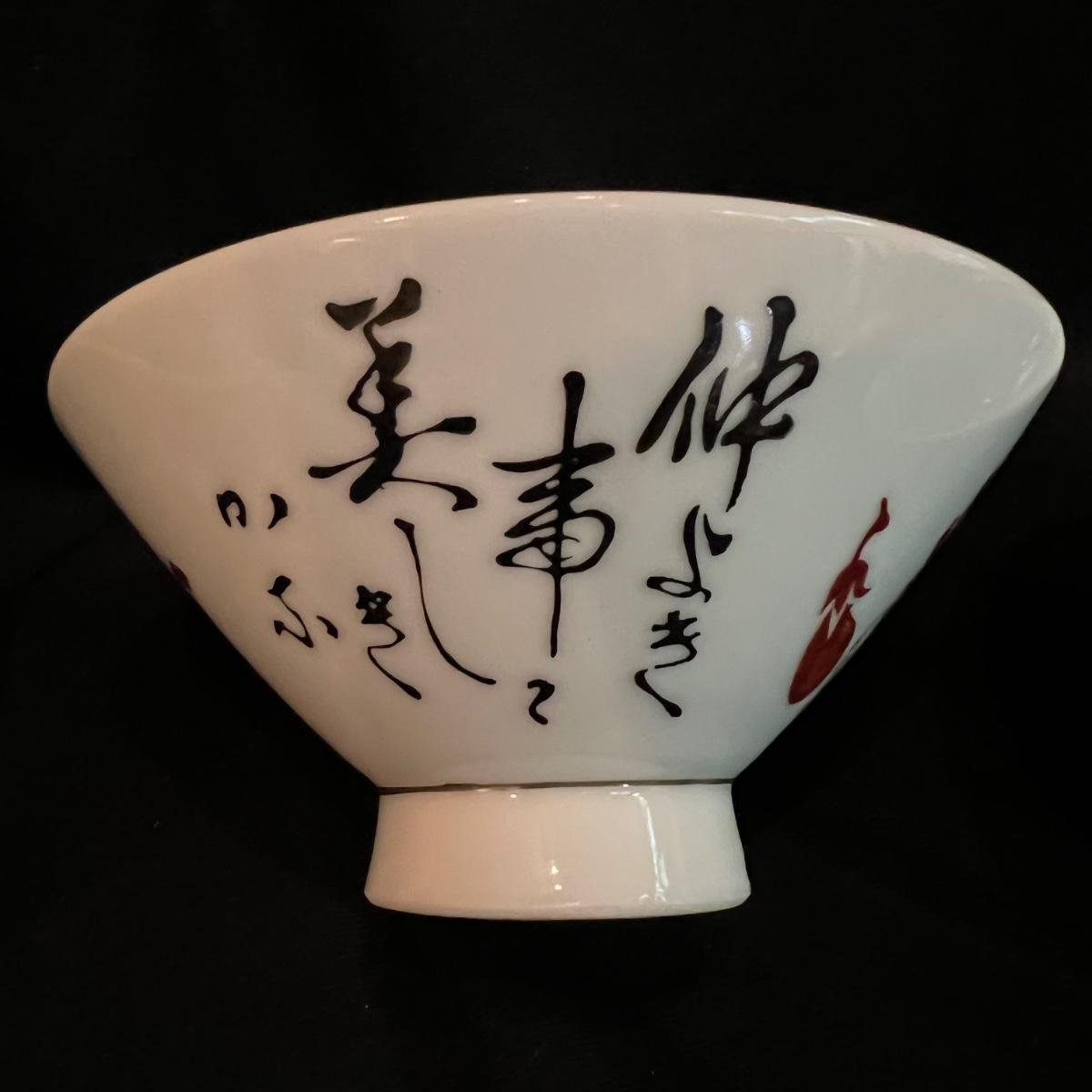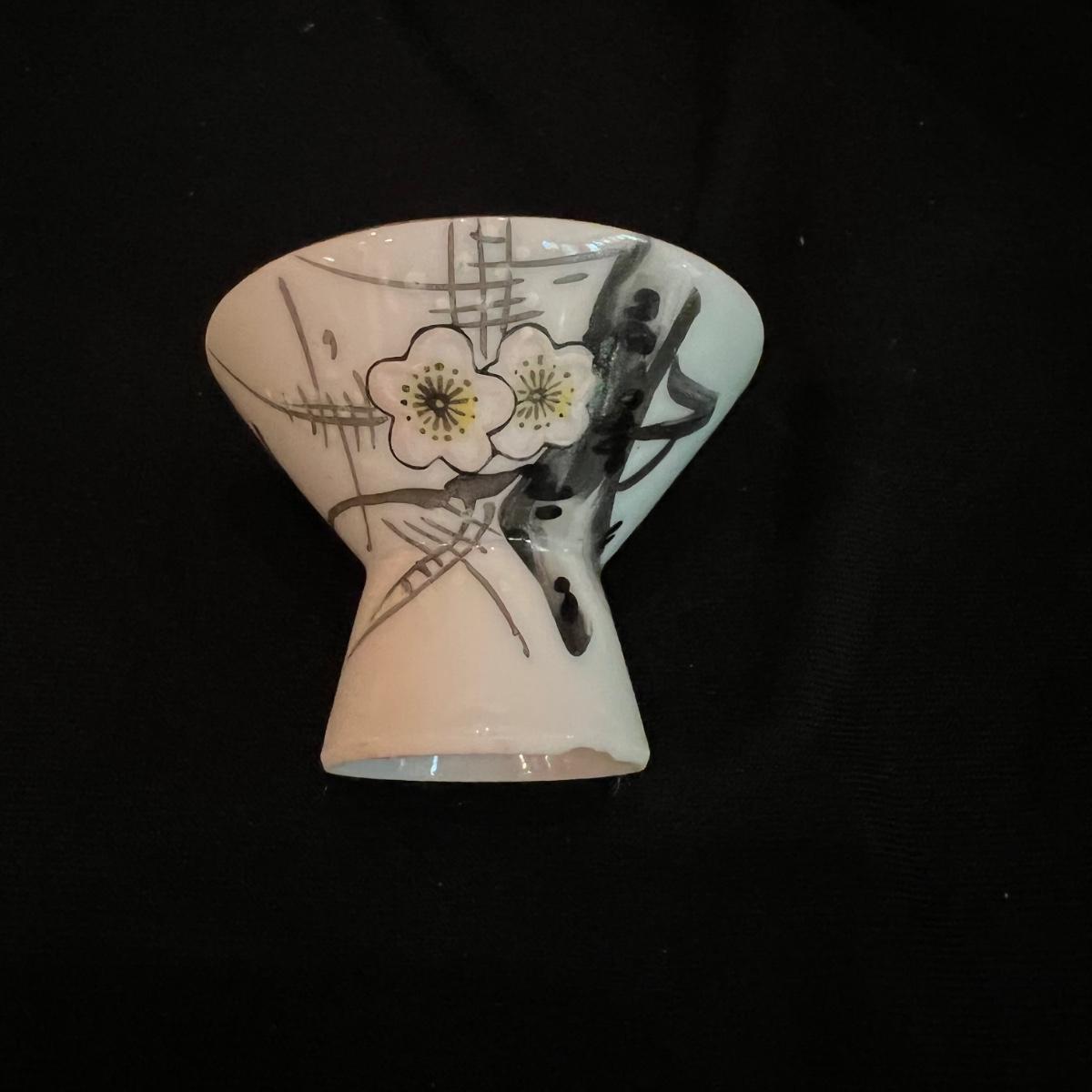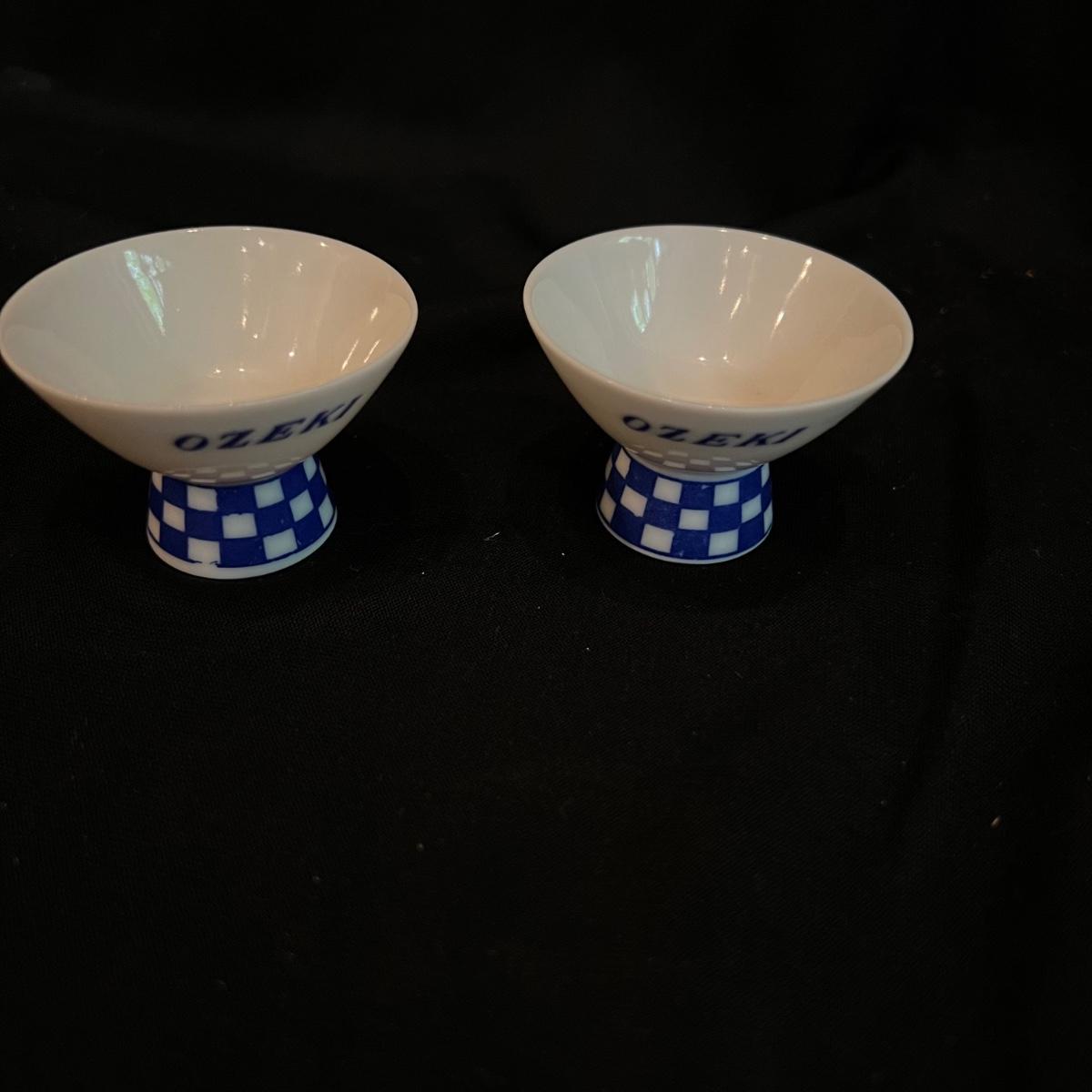Blue and white sake set and red and black bowls. Two decanters measuring approximately 2”D x 4.75”H and four matching cups measuring 2”D x 1.5” H and one gold-rimmed black and yellow flower paint design also measuring 2”D x 1.5” H. Four ceramic rice bowls measuring 4.75”D x 2.25”H. Shipping available.