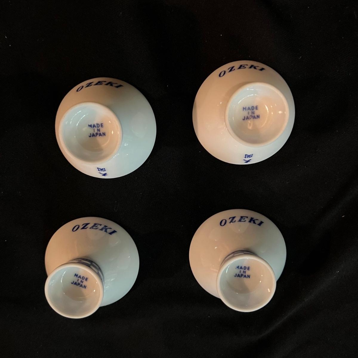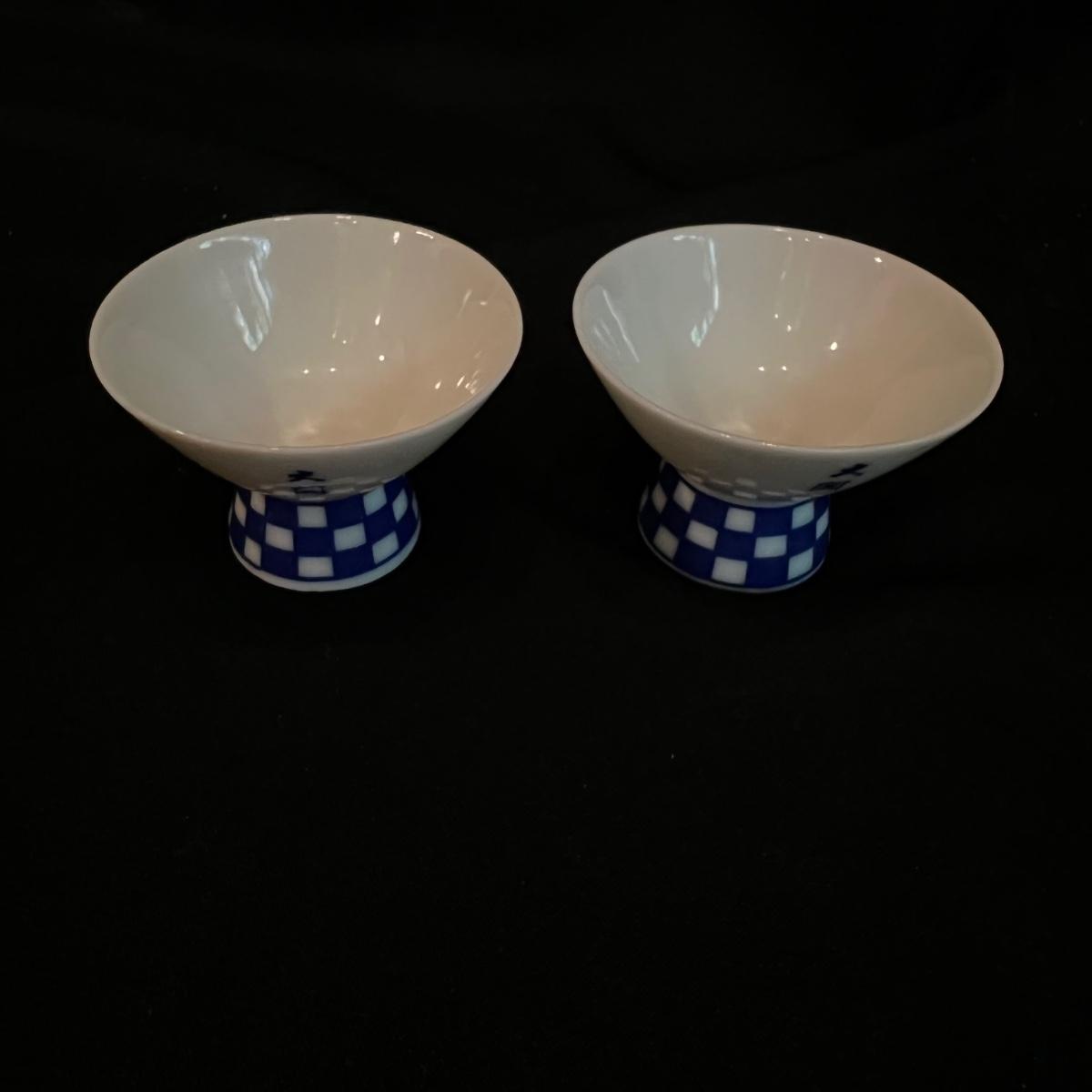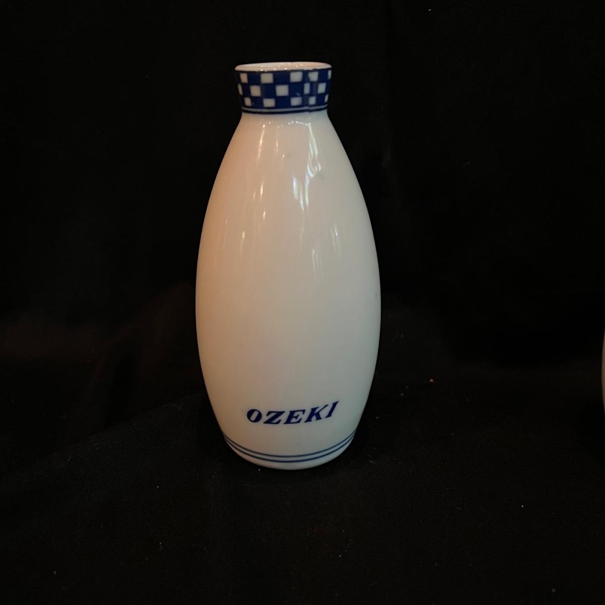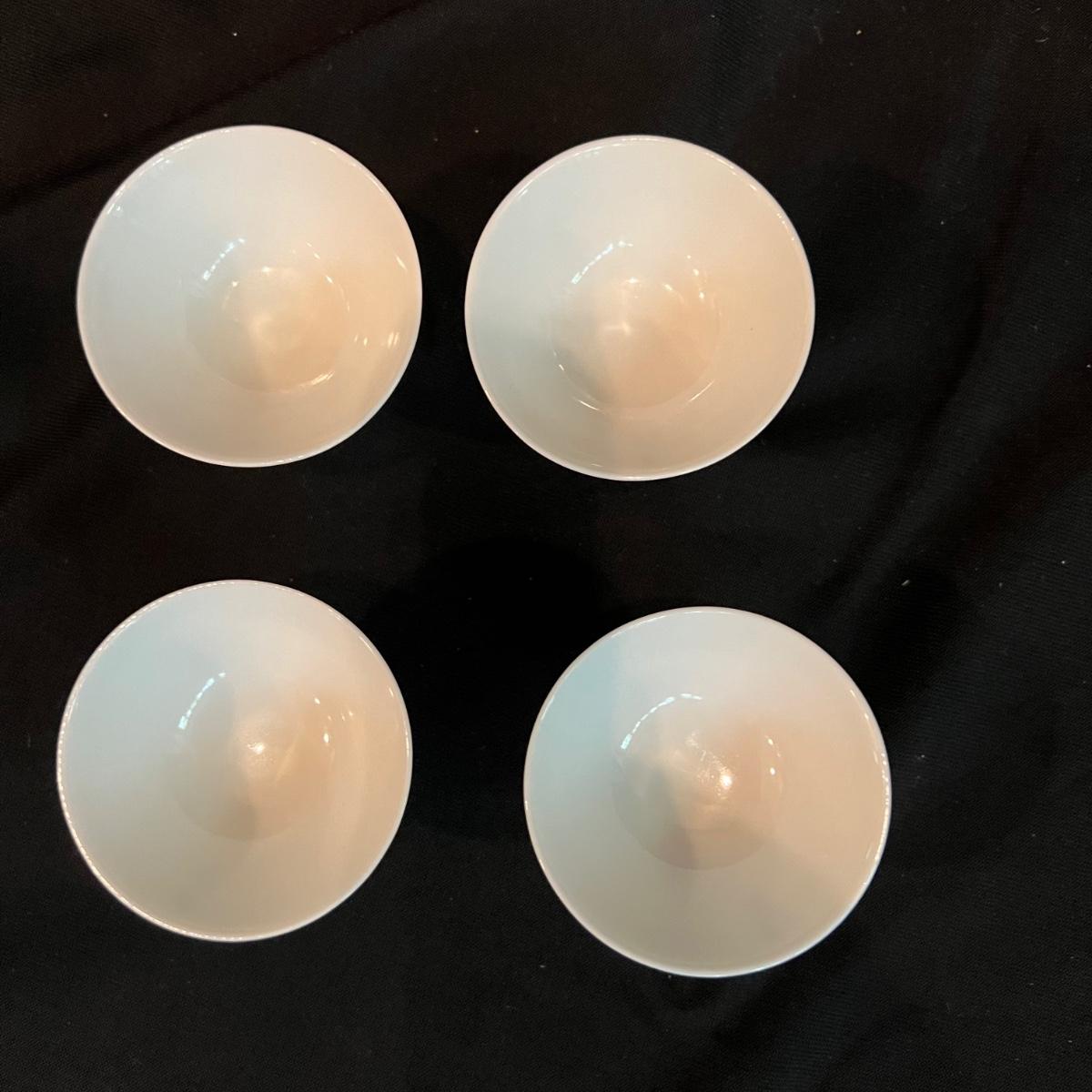 Blue and white sake set and red and black bowls. Two decanters measuring approximately 2”D x 4.75”H and four matching cups measuring 2”D x 1.5” H and one gold-rimmed black and yellow flower paint design also measuring 2”D x 1.5” H. Four ceramic rice bowls measuring 4.75”D x 2.25”H. Shipping available.