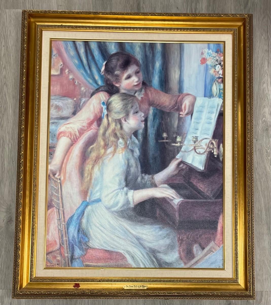 Description: P. Auguste Renoir (1841 - 1919) "Young Girls at the Piano" Oil Print on Canvas. Medium: Oil print on canvas.Measurement approximate: 30 x 28 Frame/ 27 x 25 Image (Inches)