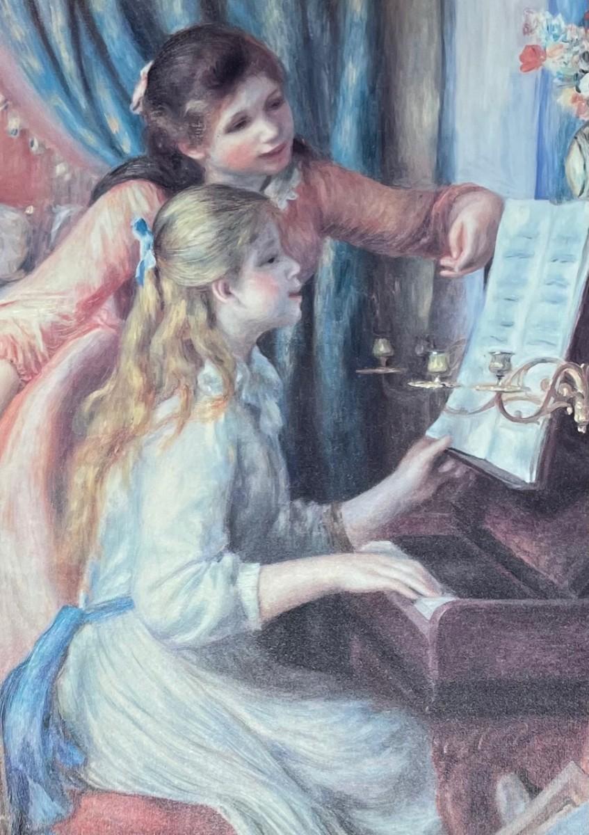 Description: P. Auguste Renoir (1841 - 1919) "Young Girls at the Piano" Oil Print on Canvas. Medium: Oil print on canvas.Measurement approximate: 30 x 28 Frame/ 27 x 25 Image (Inches)