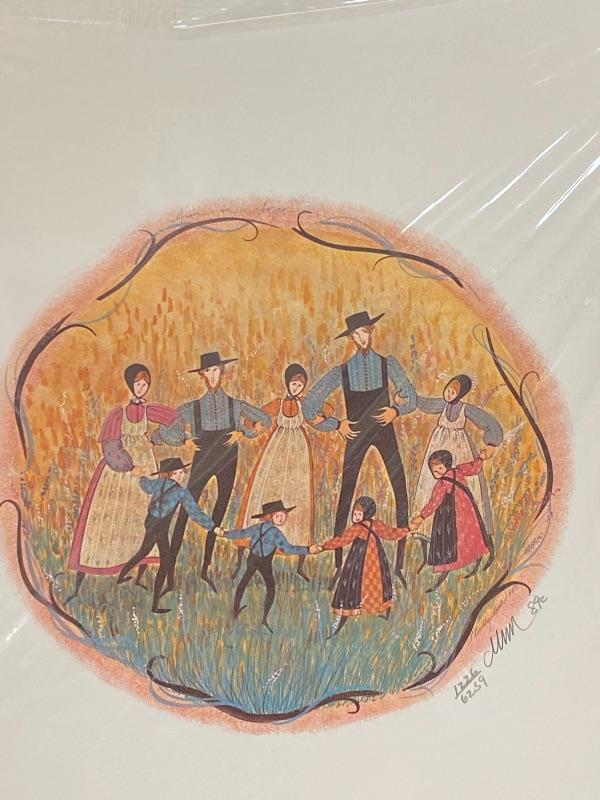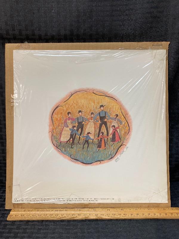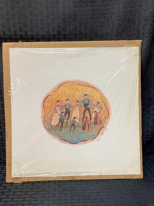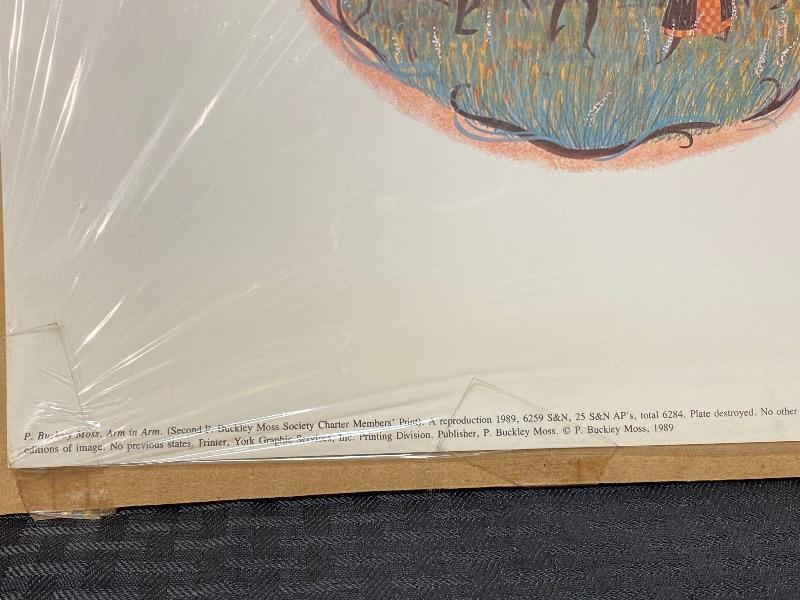 P Buckley Moss "Arm In Arm" 1989 reproduction print. Originally this was the 2nd Society Charter Member print. Unframed, about 11.5" sq. Signed & numbered. Original owner cover with plastic and taped it to the cardboard (as seen in photos). Smudges look to be on plastic not print.